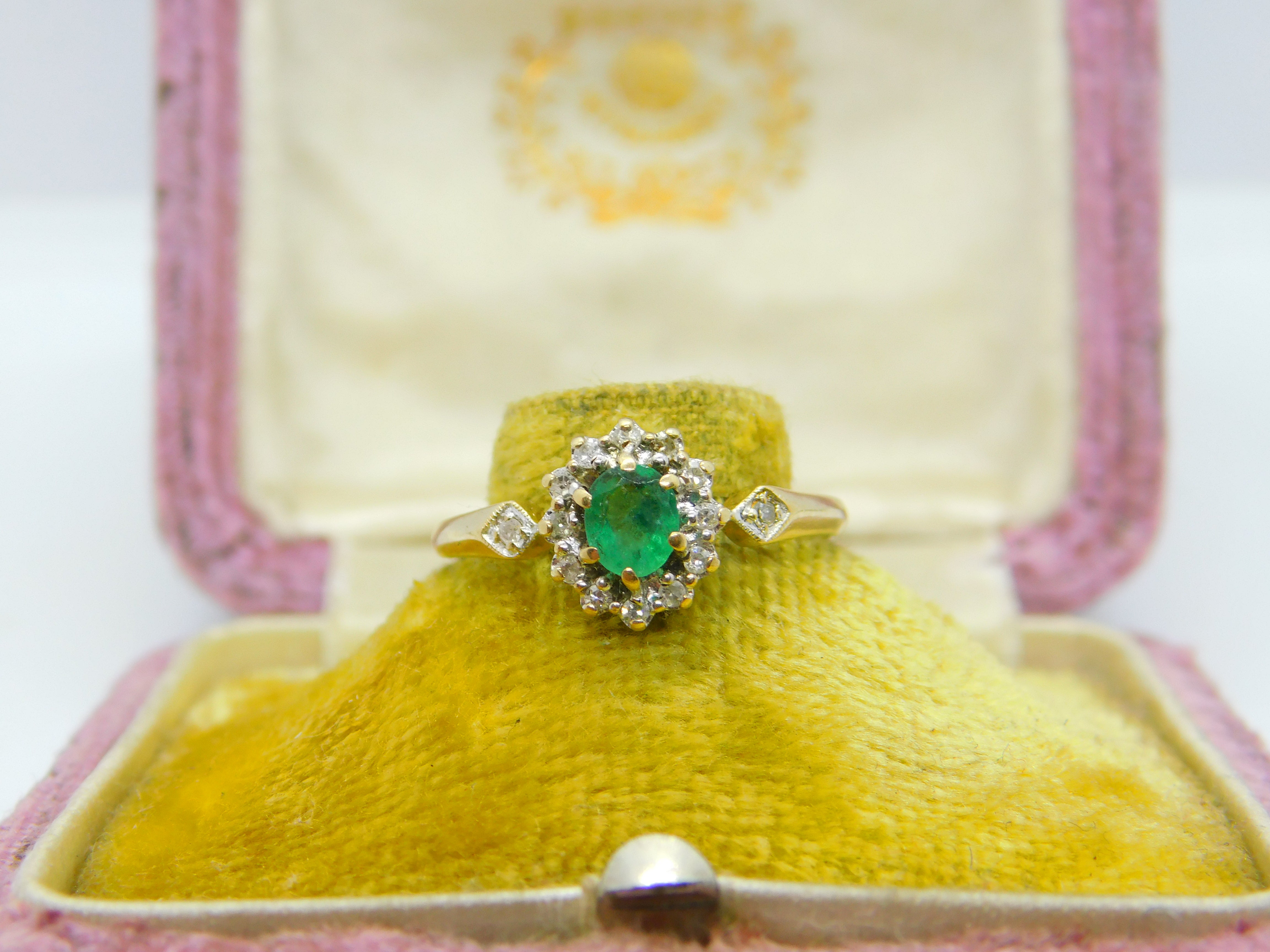 9ct Yellow Gold, Emerald & Diamond Cluster Ring 2003 Birmingham Vintage