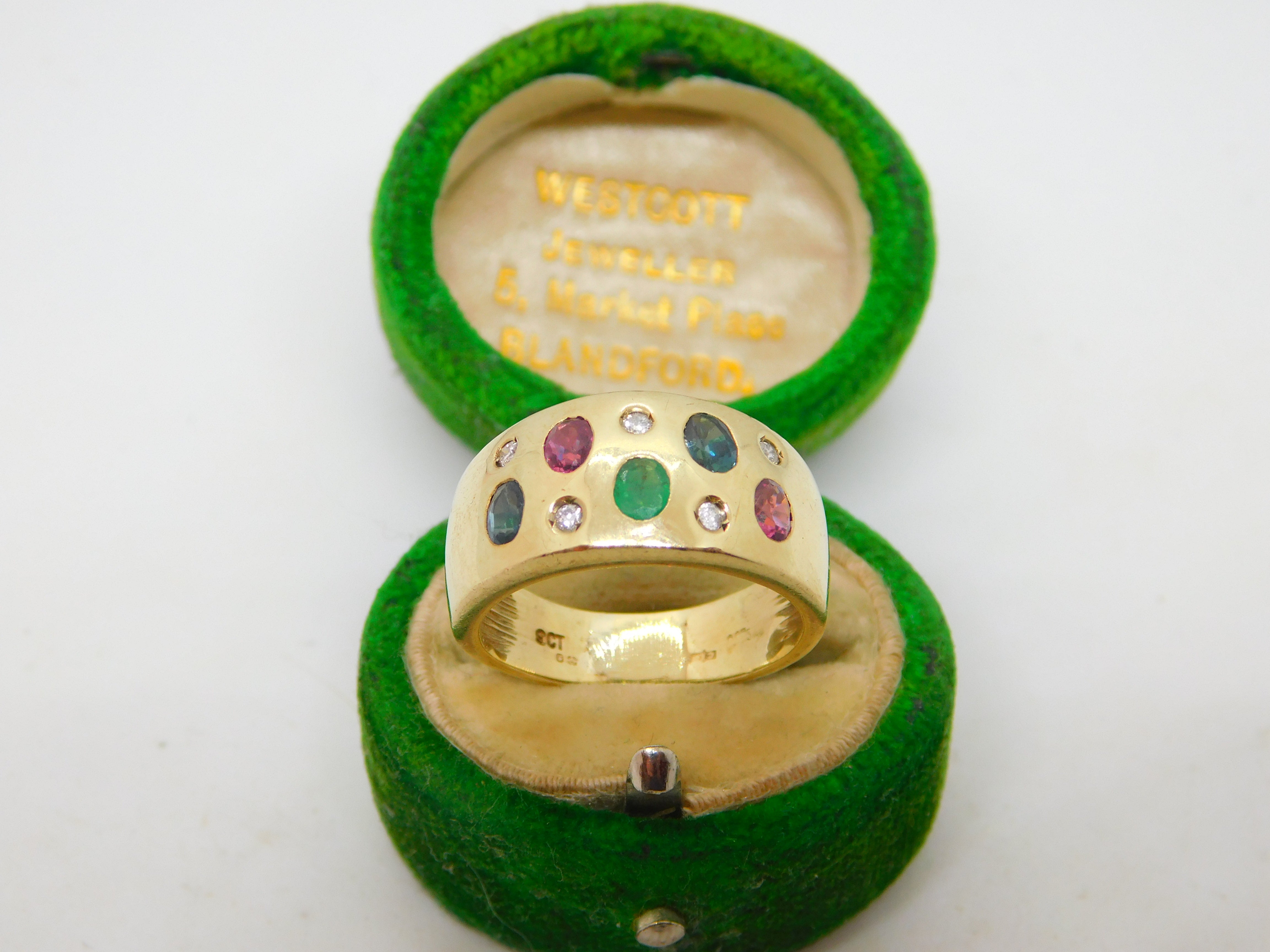 9ct Yellow Gold, Sapphire, Diamond & Ruby Gem Set Dress Ring Vintage c1990
