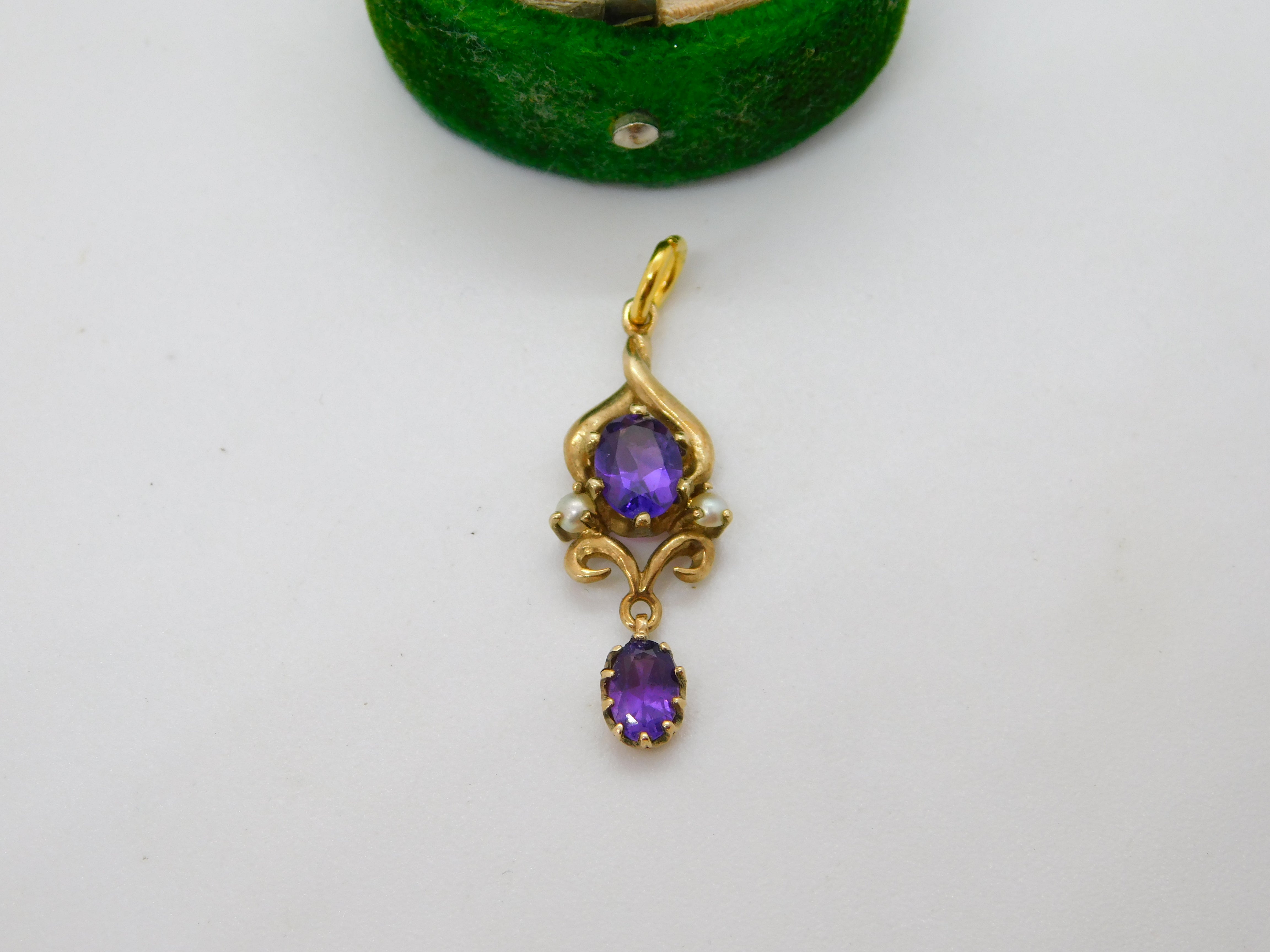 9ct Yellow Gold, Seed Pearl & Amethyst Set Lavalier Drop Pendant Antique c1920