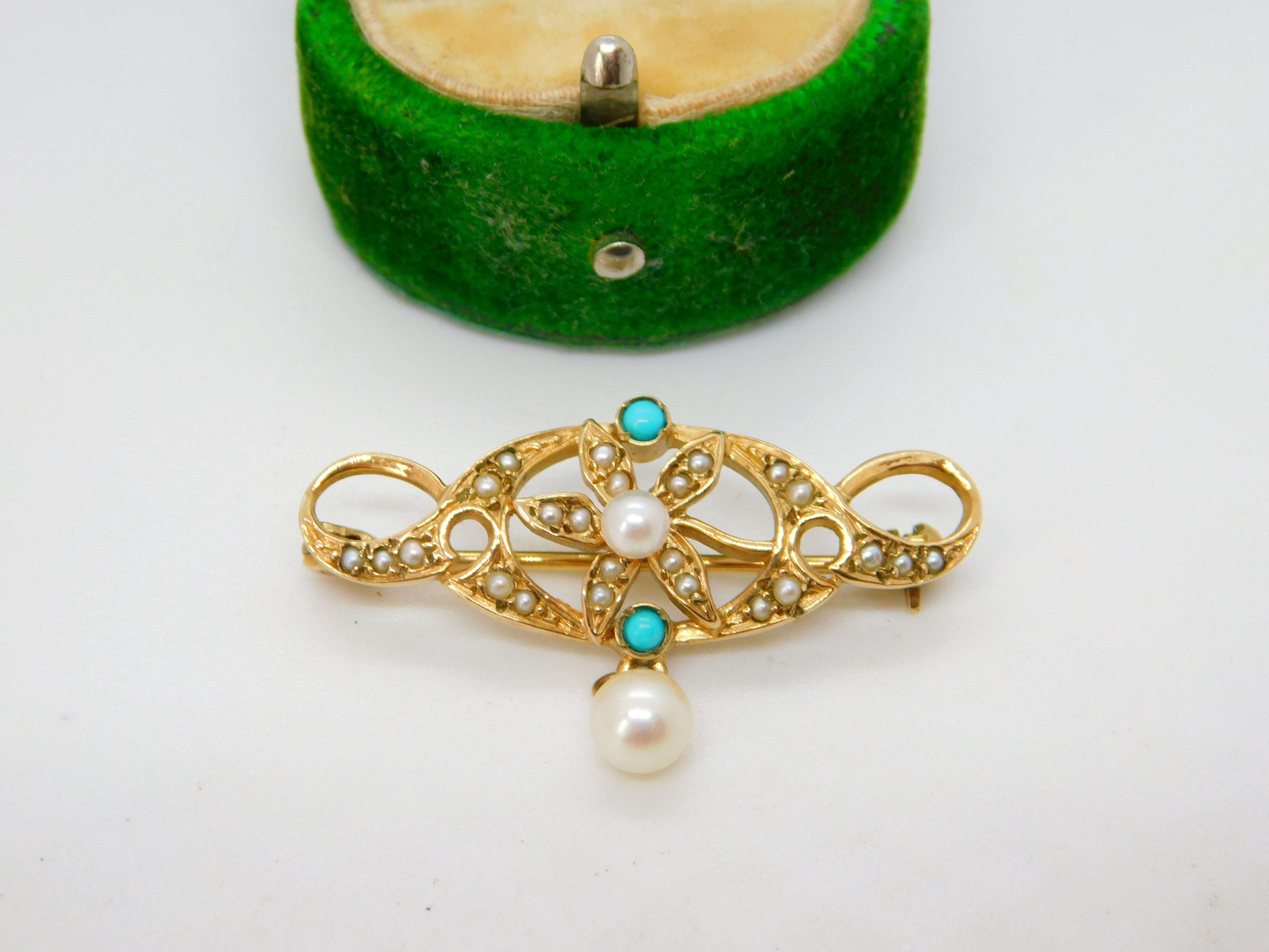 9ct Yellow Gold, Seed Pearl & Turquoise Floral Lavalier Drop Brooch Vintage 1982