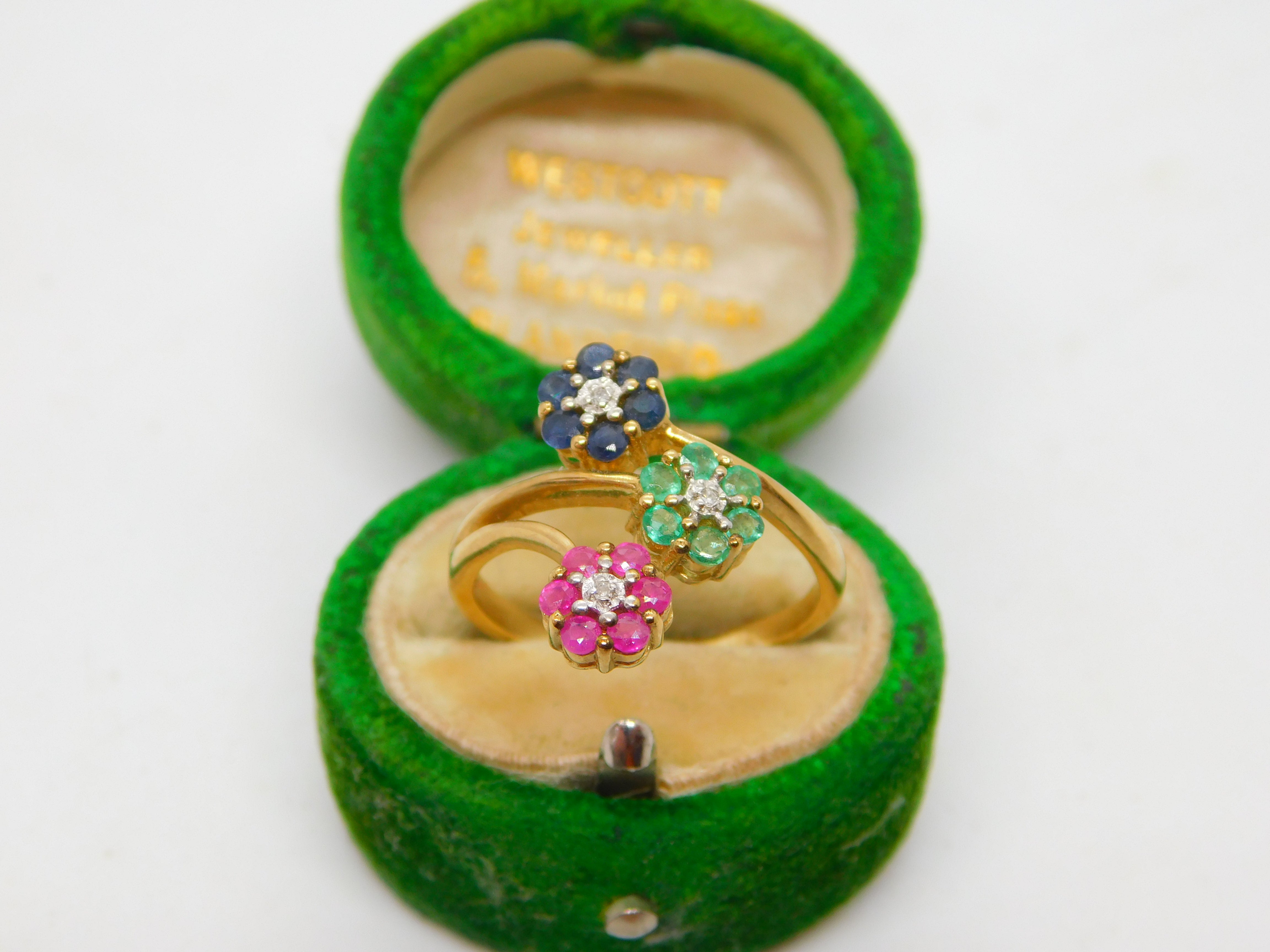 9ct Yellow Gold, Sapphire, Emerald, Ruby & Diamond Floral Ring Vintage 1990