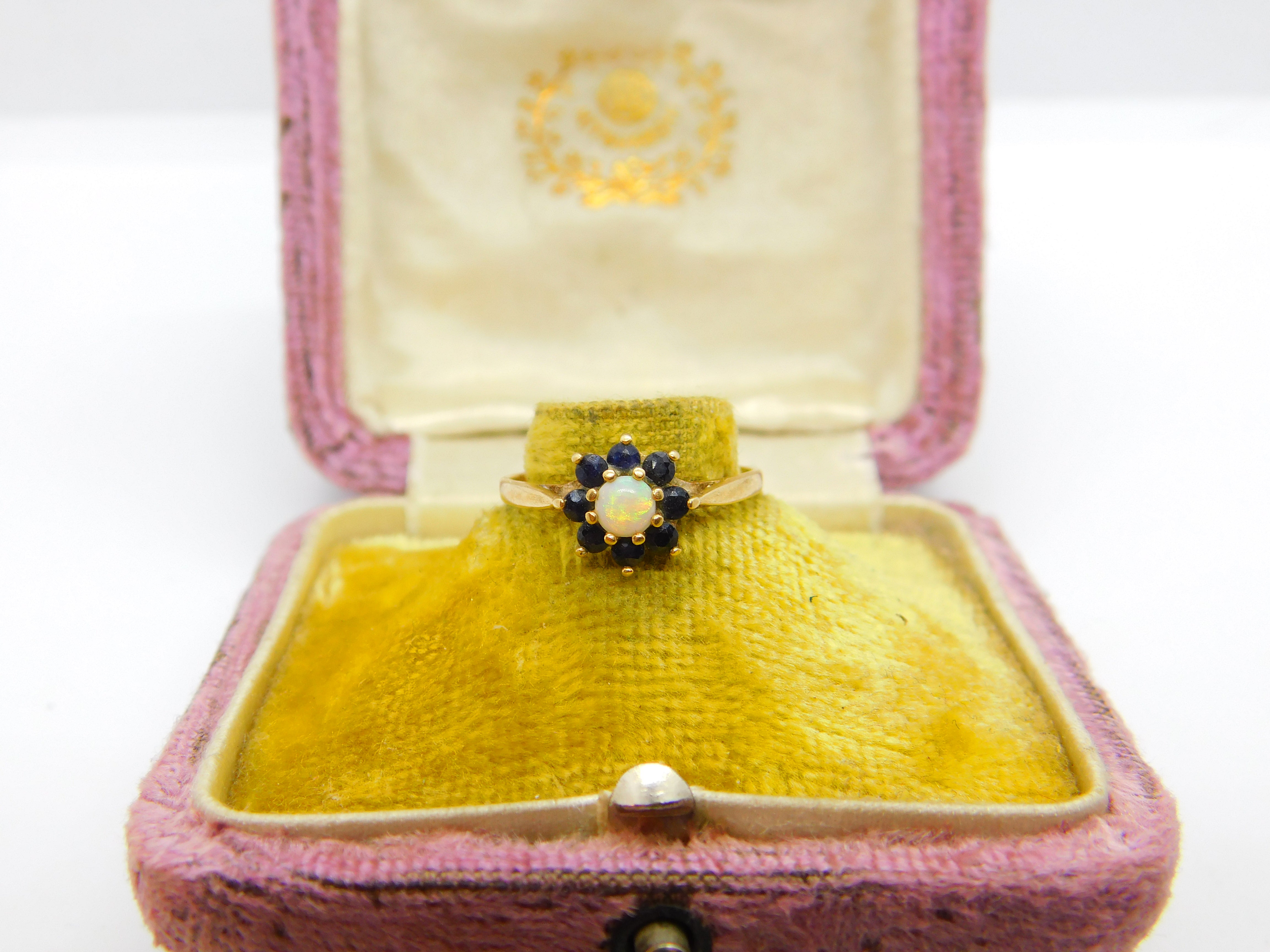 9ct Yellow Gold, Sapphire & Opal Floral Cluster Ring Vintage 1980 Birmingham