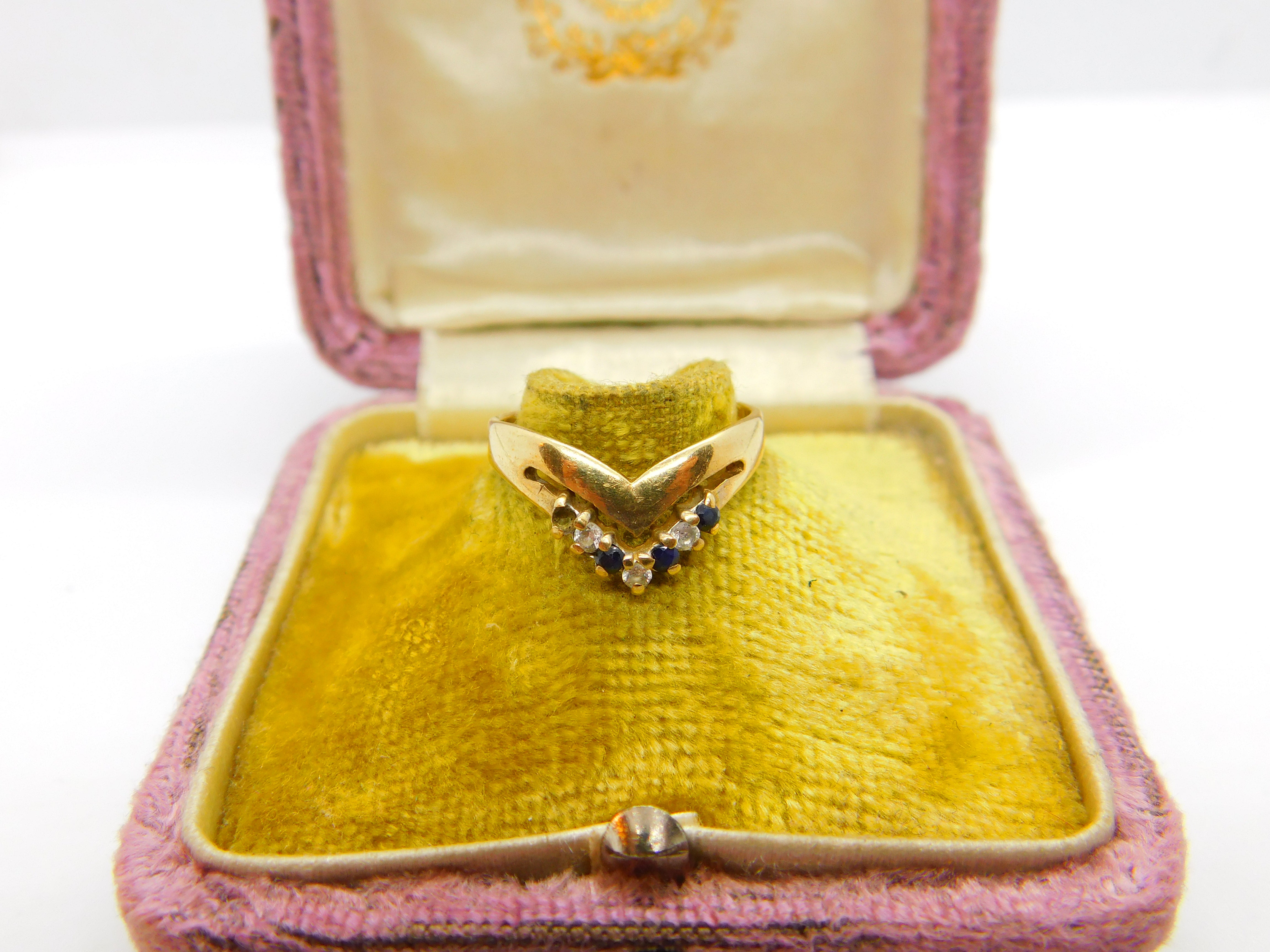 9ct Yellow Gold, Sapphire & Diamond Wishbone Ring Vintage 1988 London