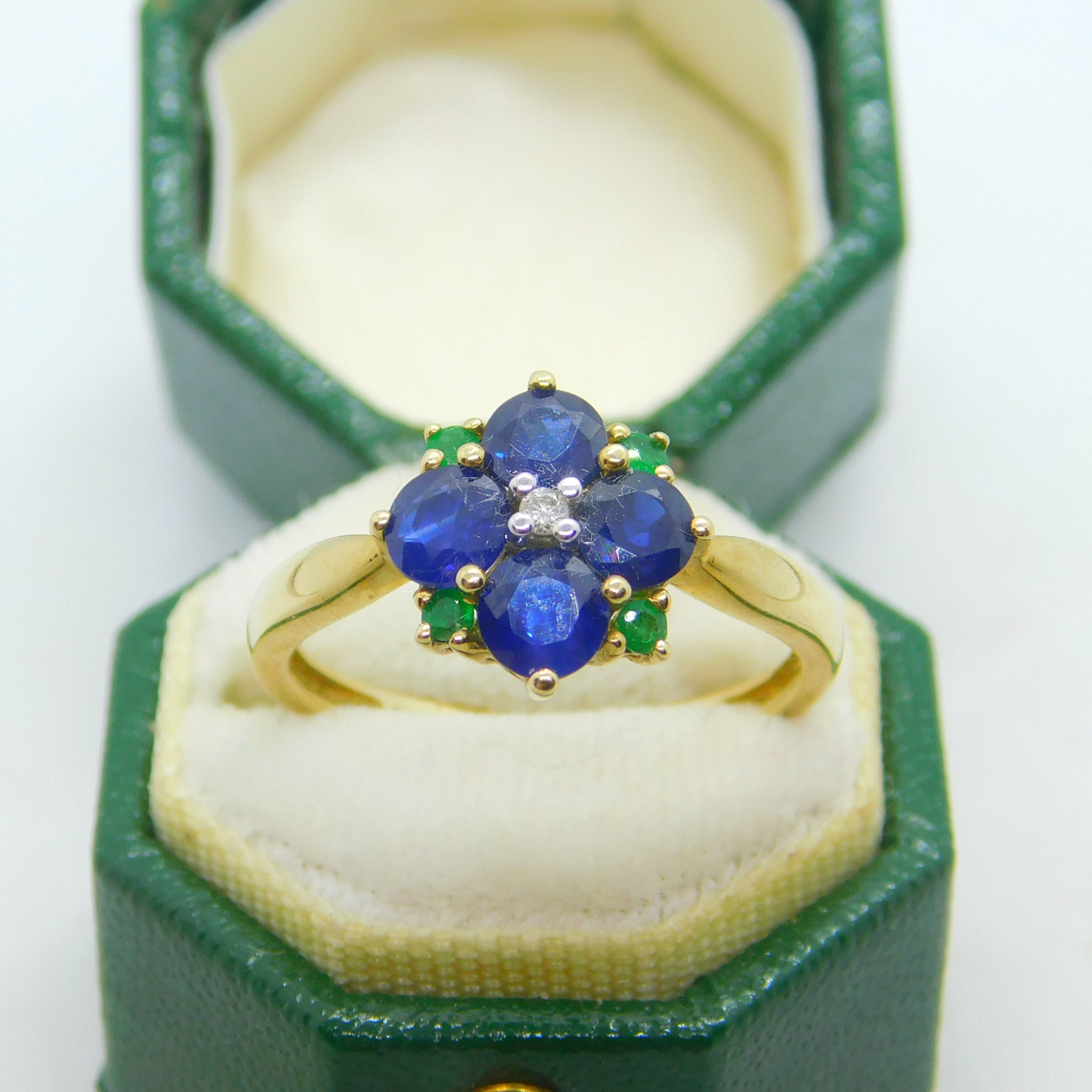 9ct Yellow Gold, Sapphire, Emerald & Diamond Floral Cluster Ring Vintage c1990