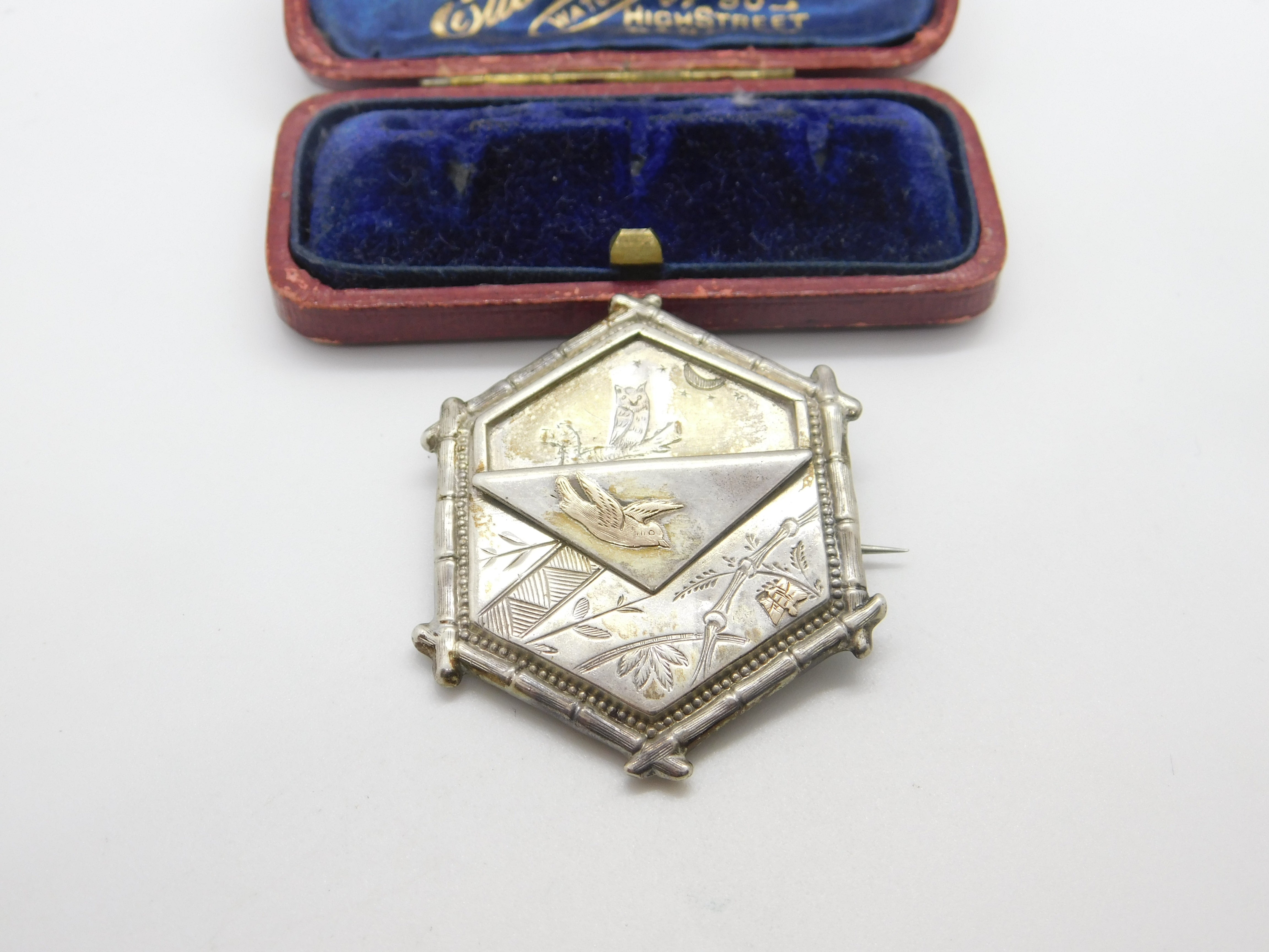 Aesthetic Movement Victorian Sterling Silver Owl & Swallow Brooch c1880 Antique