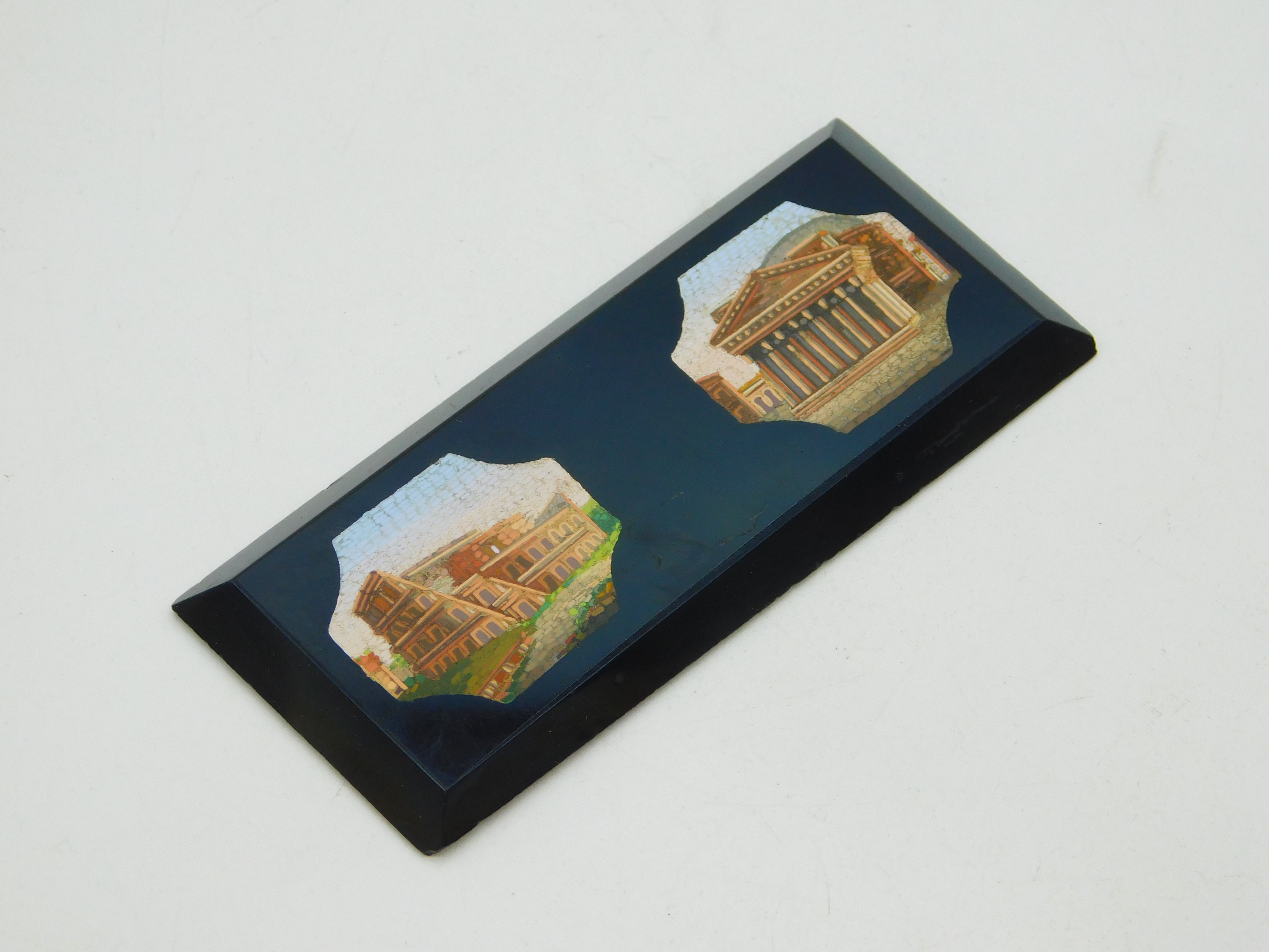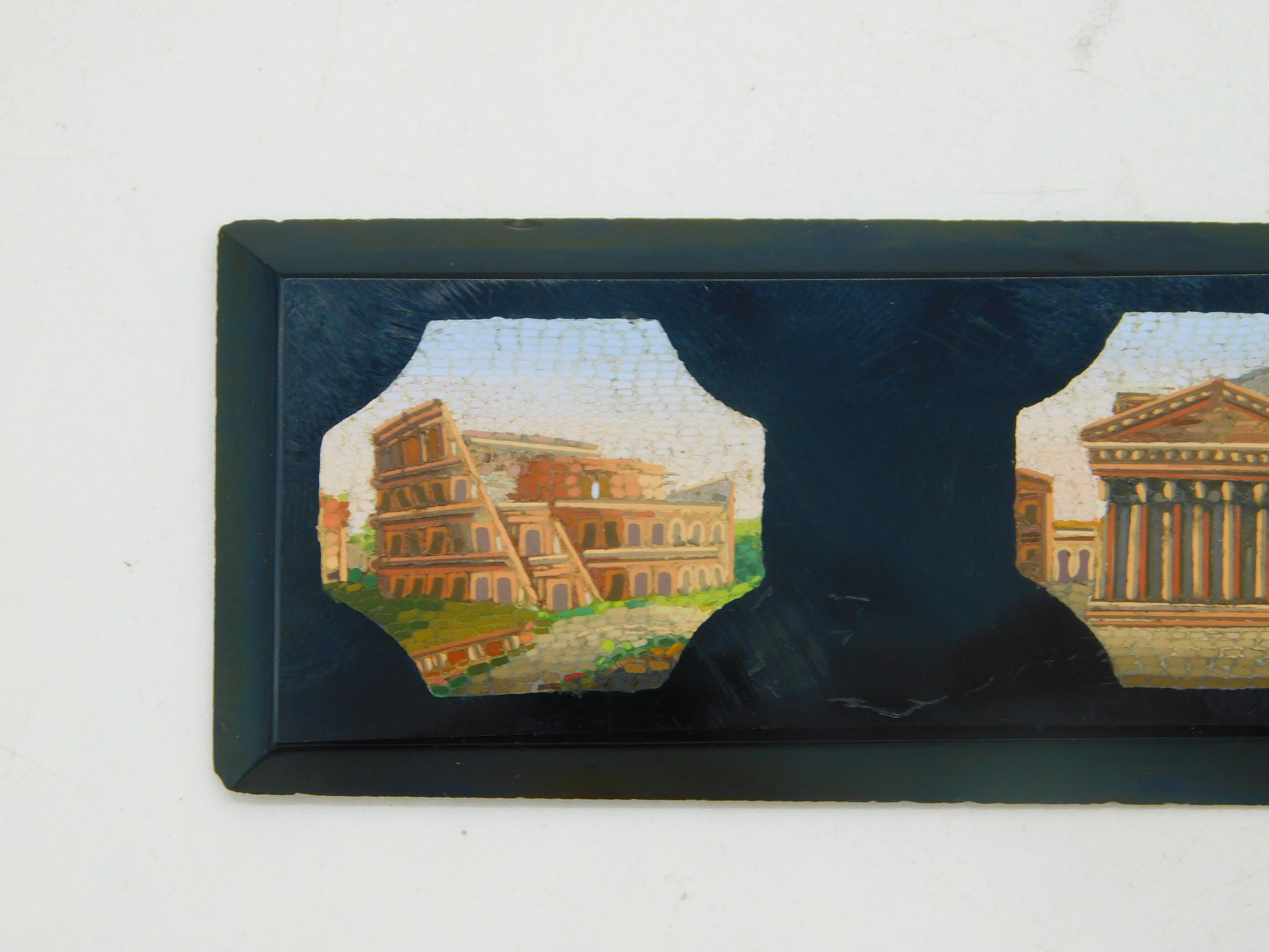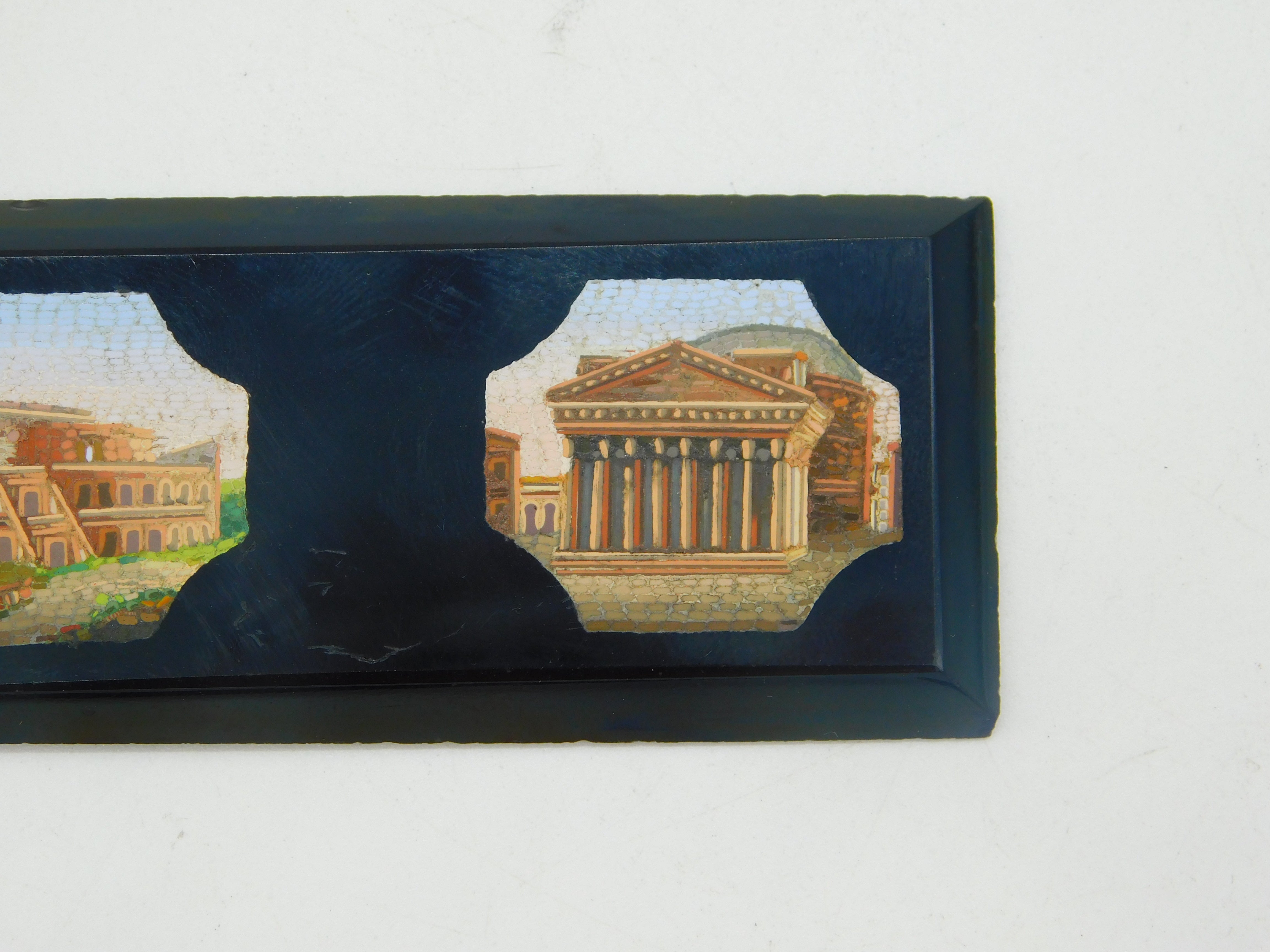 Details: A fantastic and wonderfully designed antique 19th century grand tour period panel in black onyx set with two superb micro mosaic plaques depicting the colosseum and the parthenon c1830s. Minor scratching the onyx but generally good, the item would originally have been set on a box or piece of furniture. This is a wonderful item that would make a perfect gift or addition to any collection. We are more than happy to provide XRF reports for items upon request.