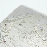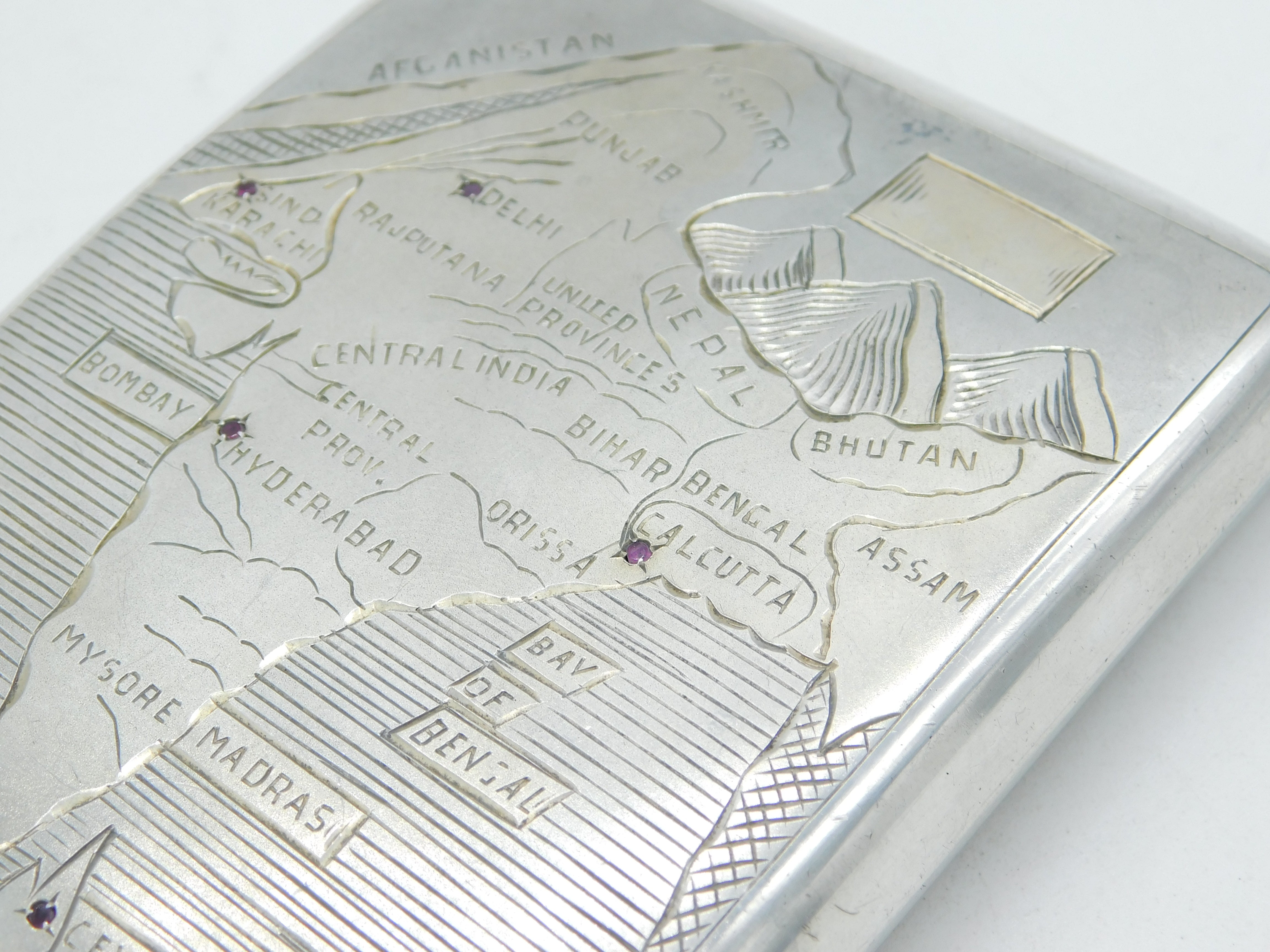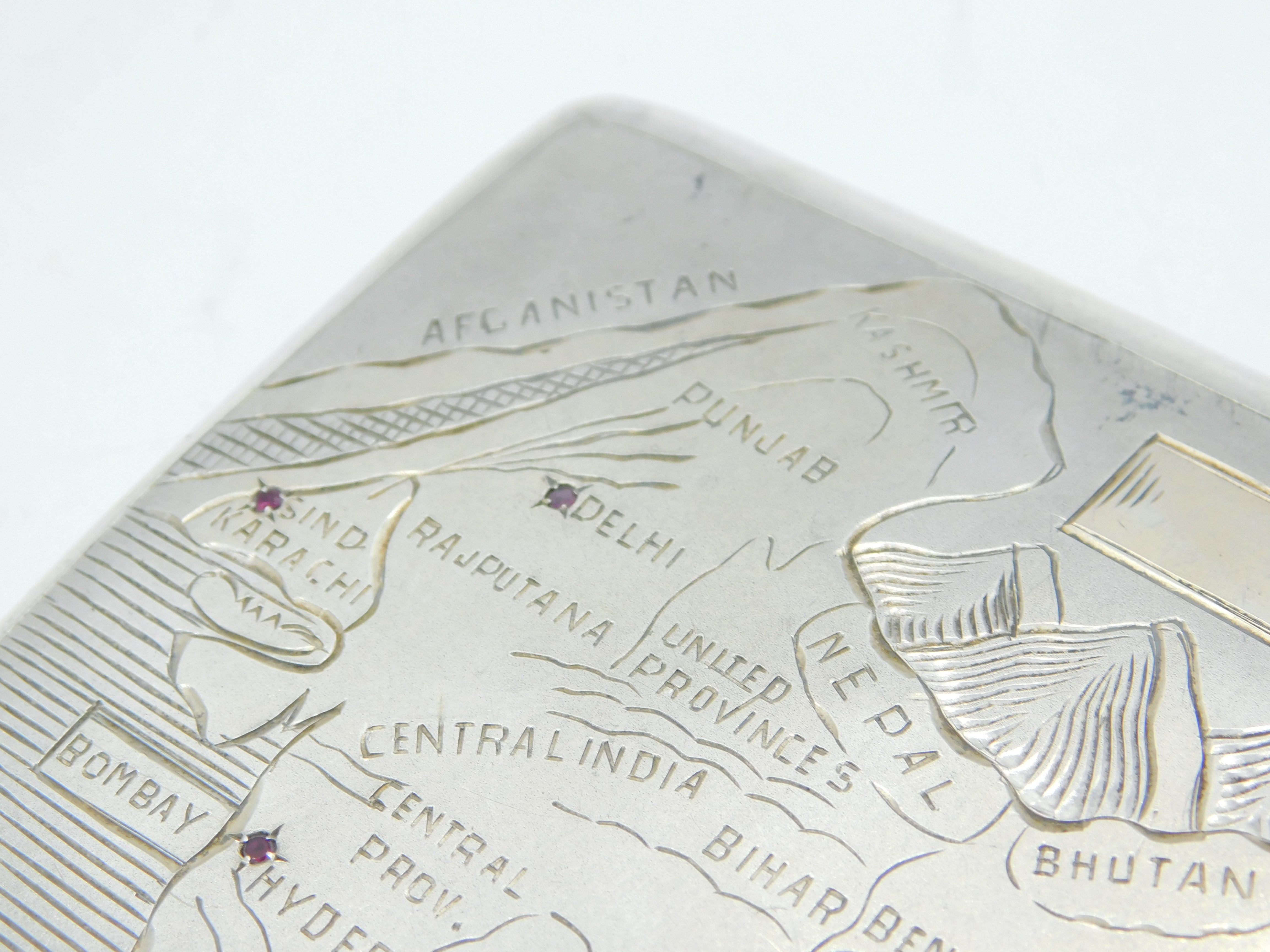 Details: A fantastic and wonderfully designed antique early 20th century sterling silver cigarette case depicting the map of India and surrounding nations including city names and provinces, four of the cities set with natural ruby stones, hallmarked 'sterling silver' to the interior and XRF tested c1920s, likely a travel souvenir possibly of military interest. This is a wonderful item that would make a perfect gift or addition to any collection. We are more than happy to provide XRF reports for items upon request.