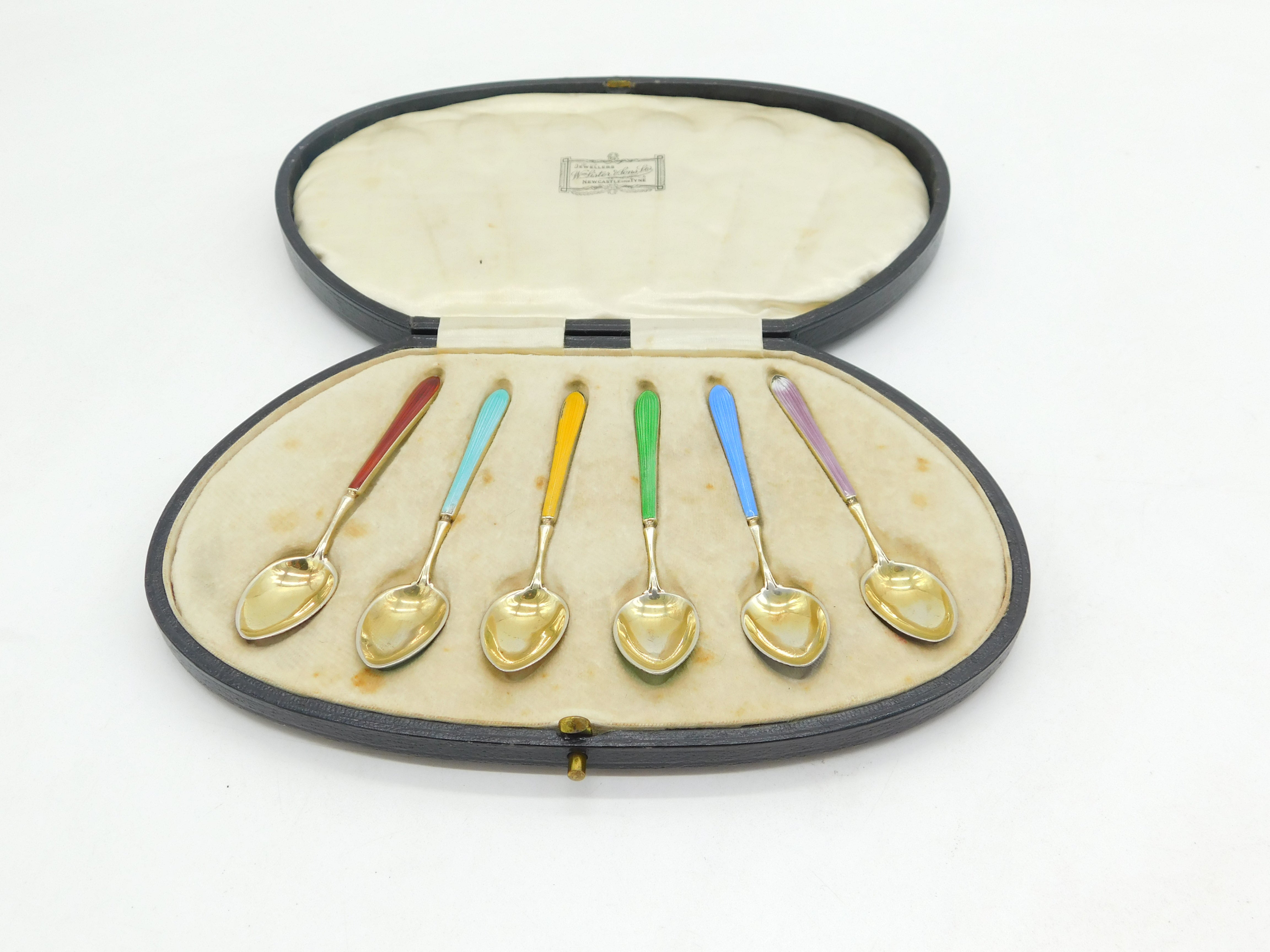 Details: A fantastic and wonderfully designed antique art deco boxed set of six sterling silver multi coloured enamel teaspoons with lovely detailing each hallmarked Birmingham 1930 by Barker Brothers Silver, minor enamel loss in a few areas pictured and to the reverse of the bowls. This is a wonderful item that would make a perfect gift or addition to any collection. We are more than happy to provide XRF reports for items upon request.