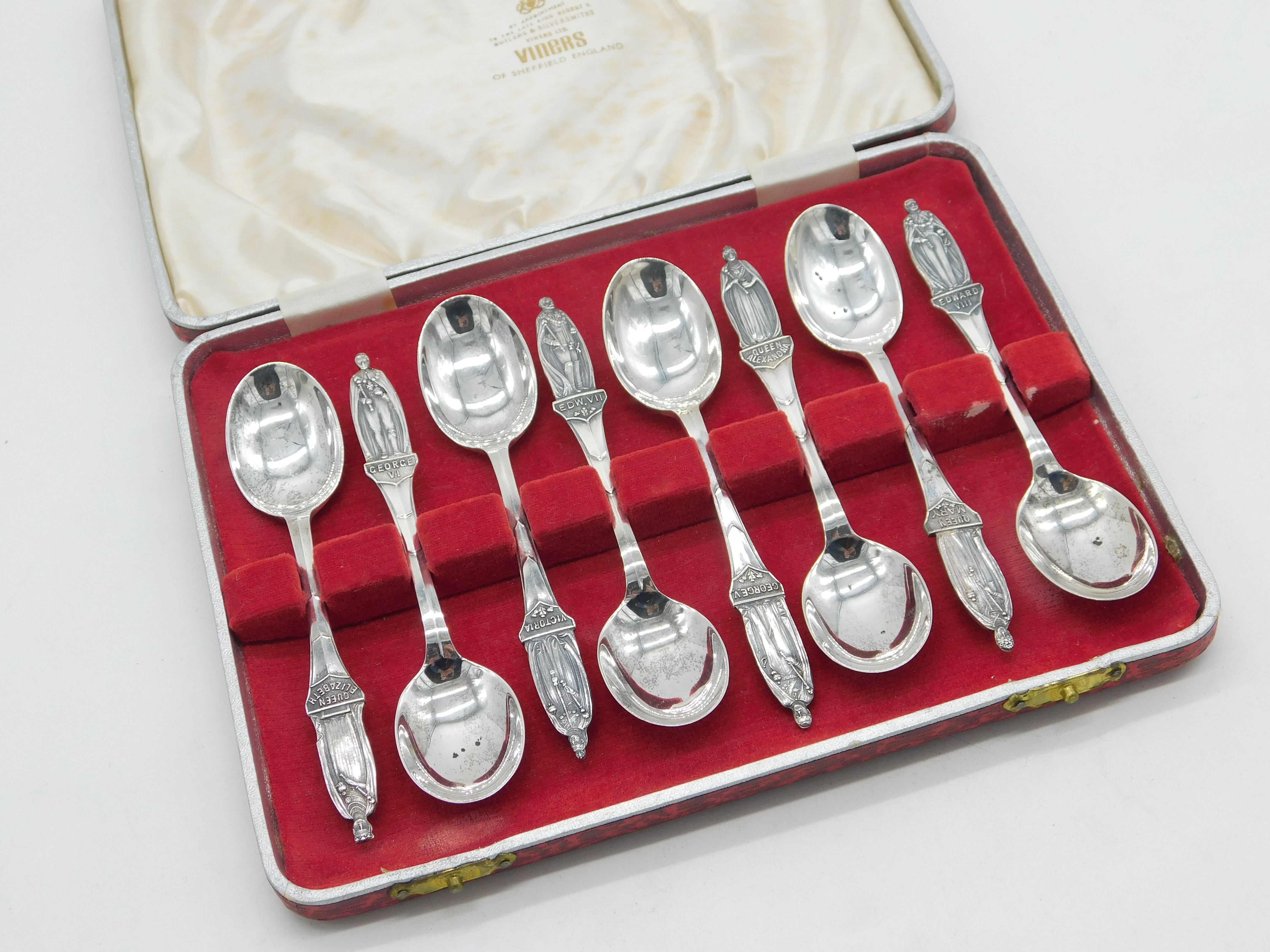 Details: A fantastic and wonderfully designed antique art deco boxed set of sterling silver teaspoons depicting the monarchs of Britain from Queen Victoria to George VI with eight included hallmarked Sheffield 1936. This is a wonderful item that would make a perfect gift or addition to any collection. The BOX pictured is for PRESENTATION ONLY and is NOT included in the listings but used to frame the pictures unless specifically stated otherwise.