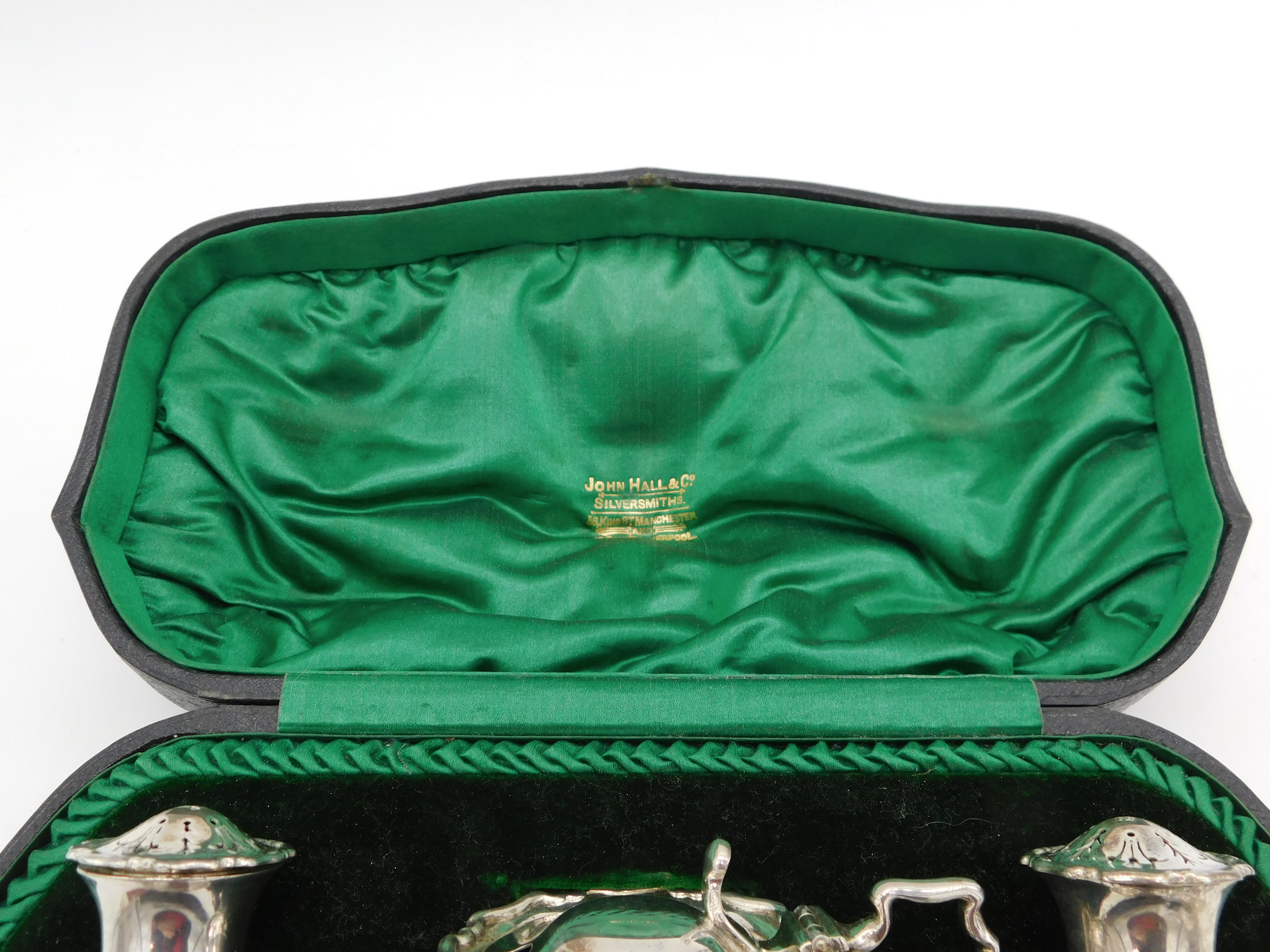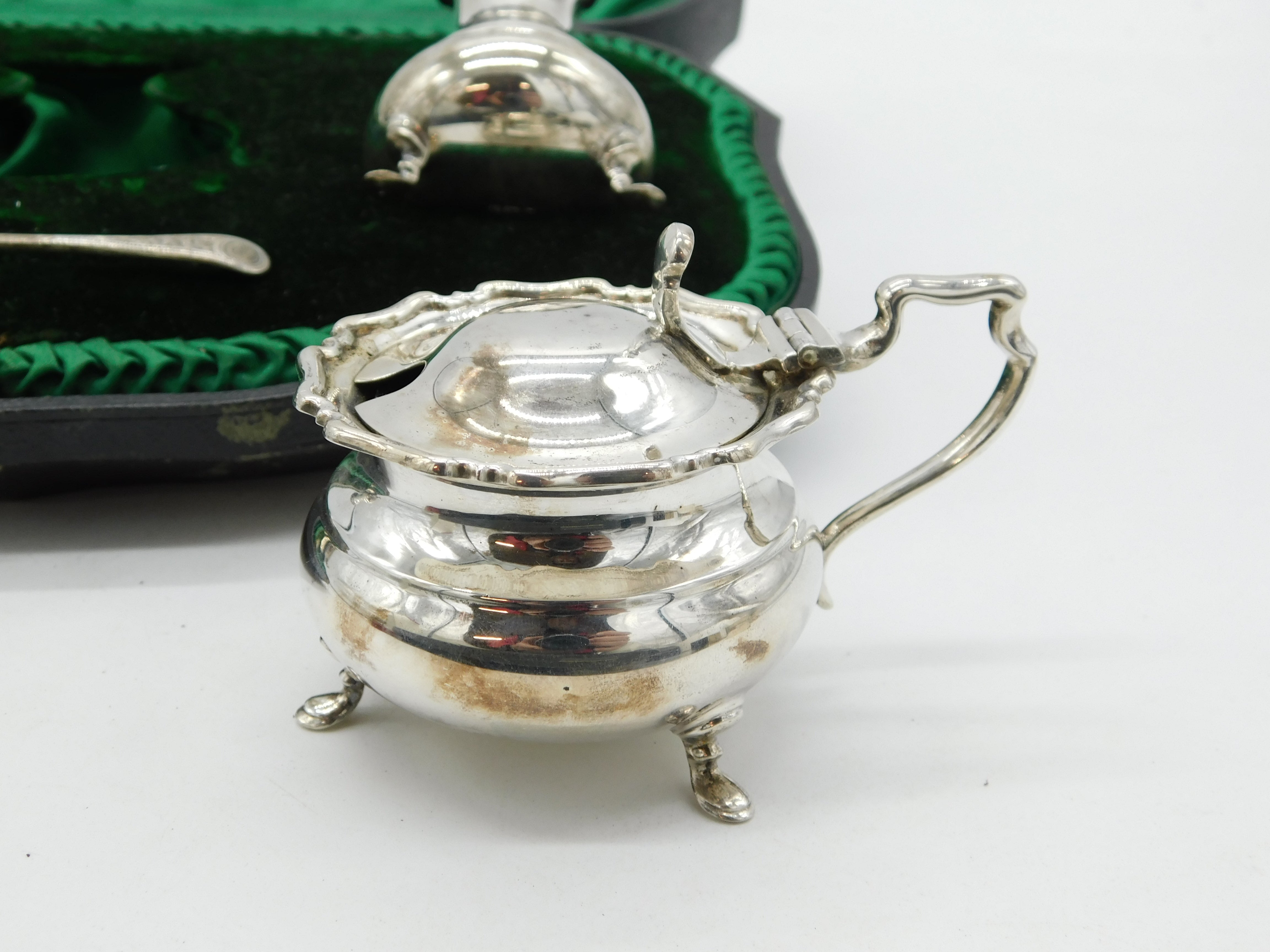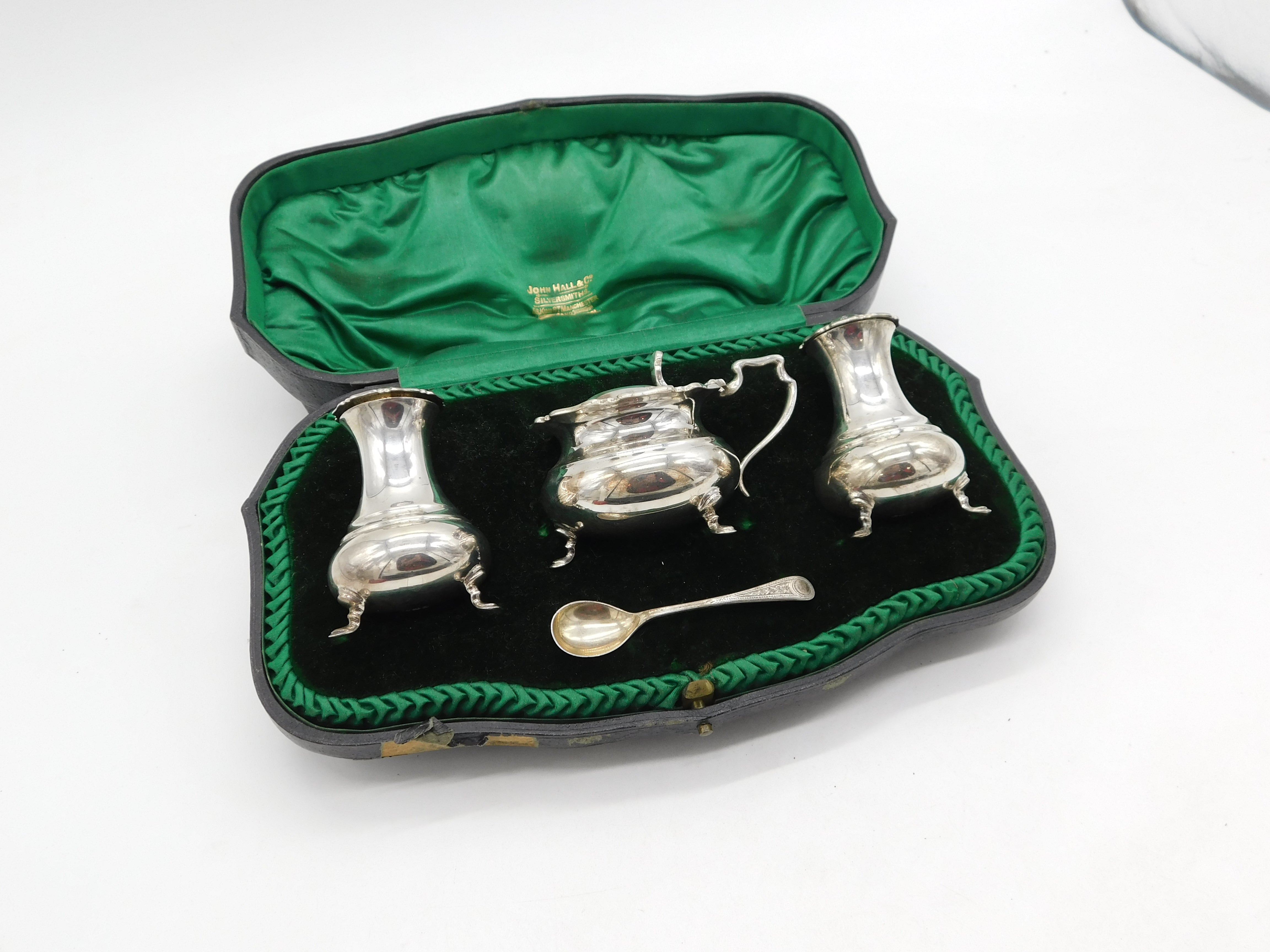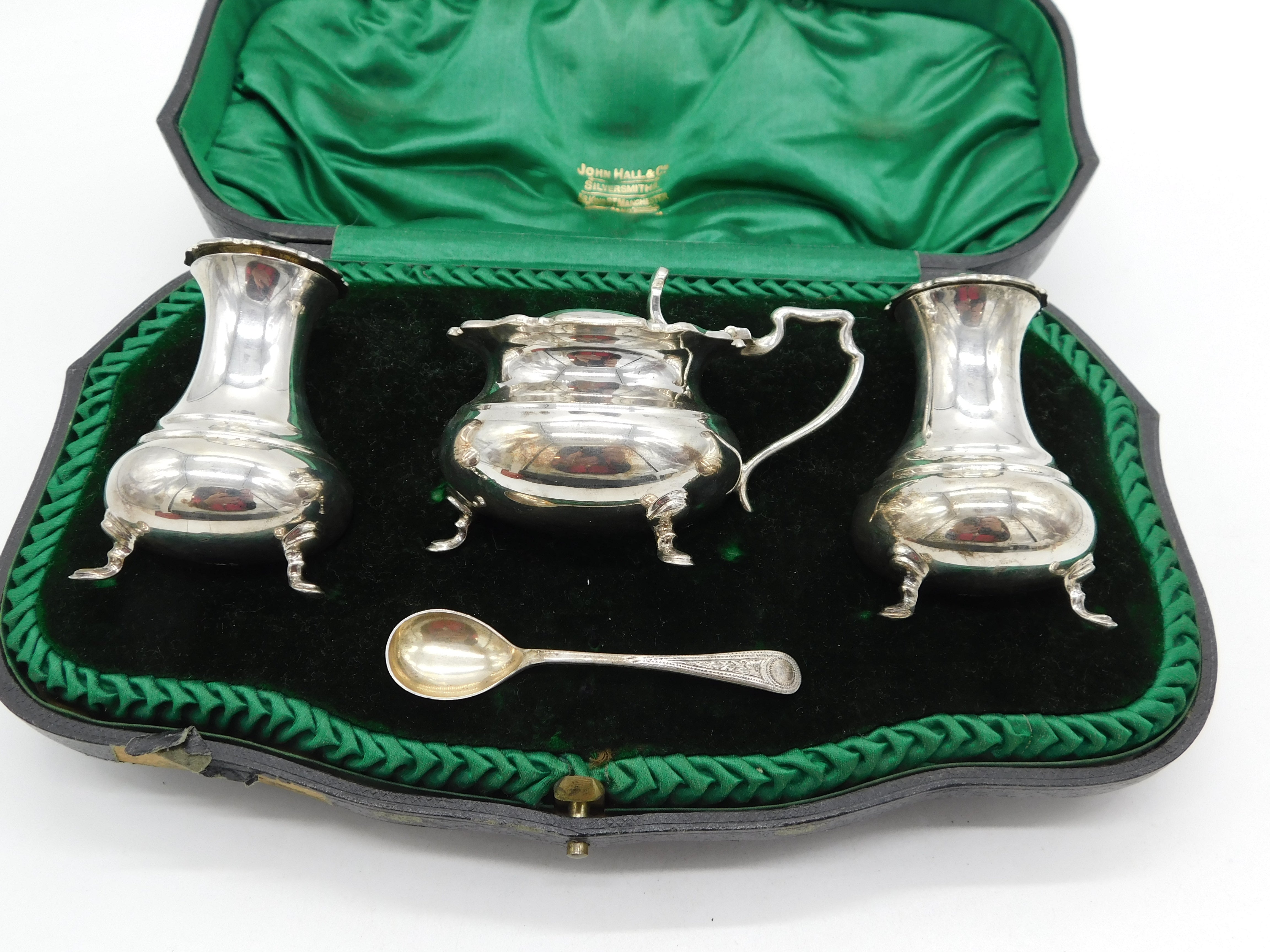 Details: A fantastic and wonderfully designed antique art deco boxed sterling silver cruet set to include paw foot mustard pot, pair of pepper shakers and spoon hallmarked Sheffield 1917 by Atkin Bros, the spoon is hallmarked but not matched to the set. This is a wonderful item that would make a perfect gift or addition to any collection.