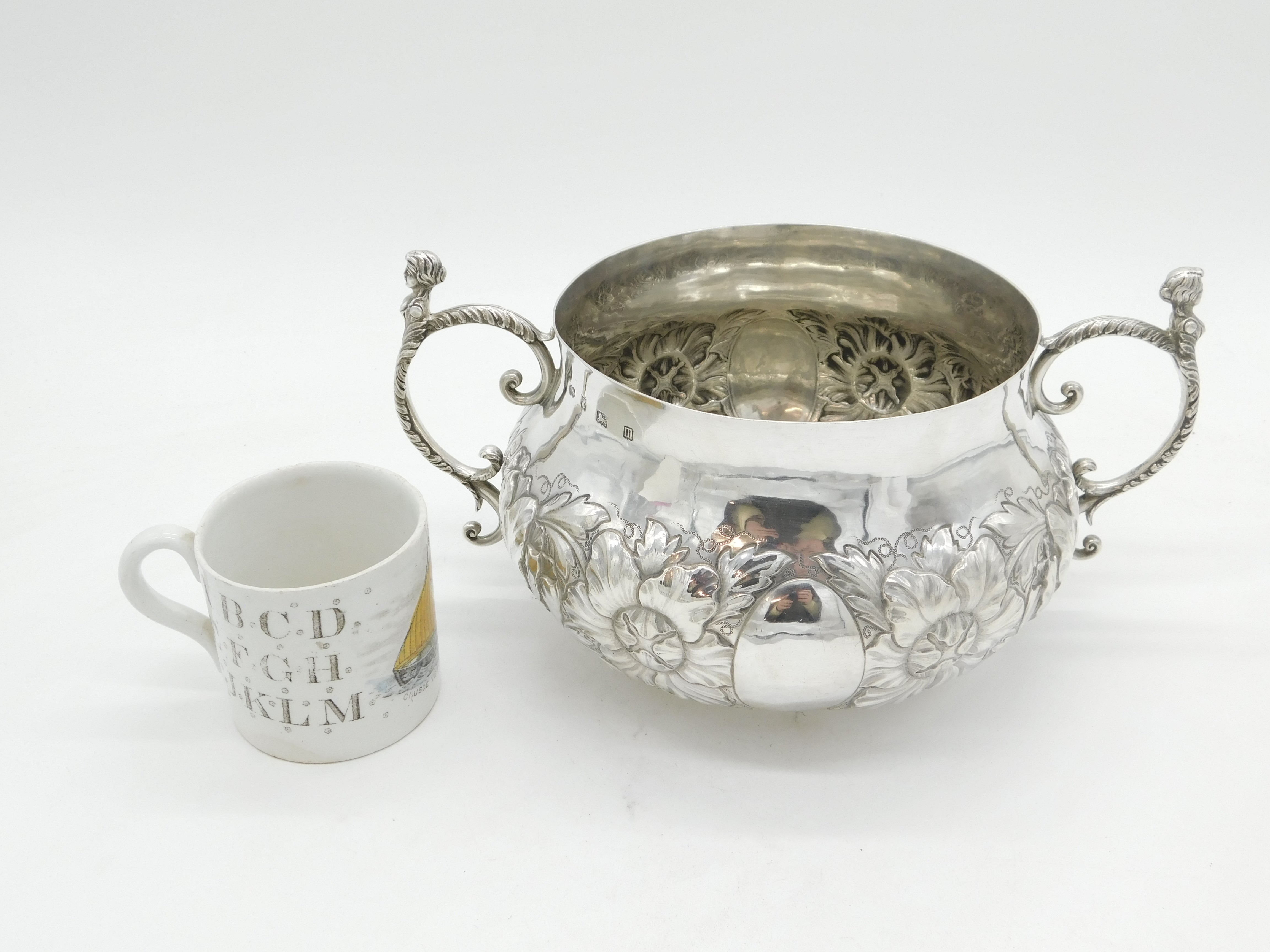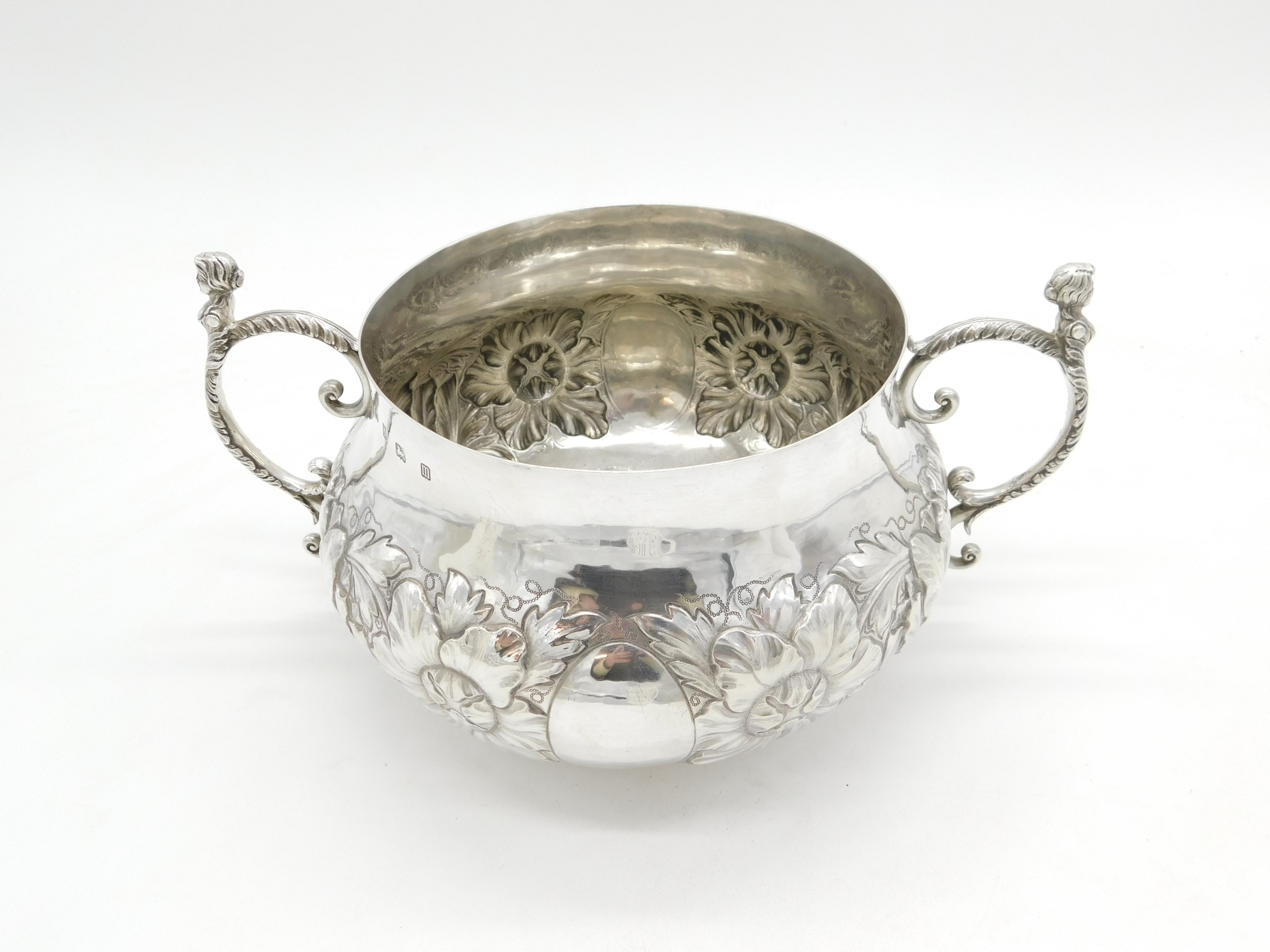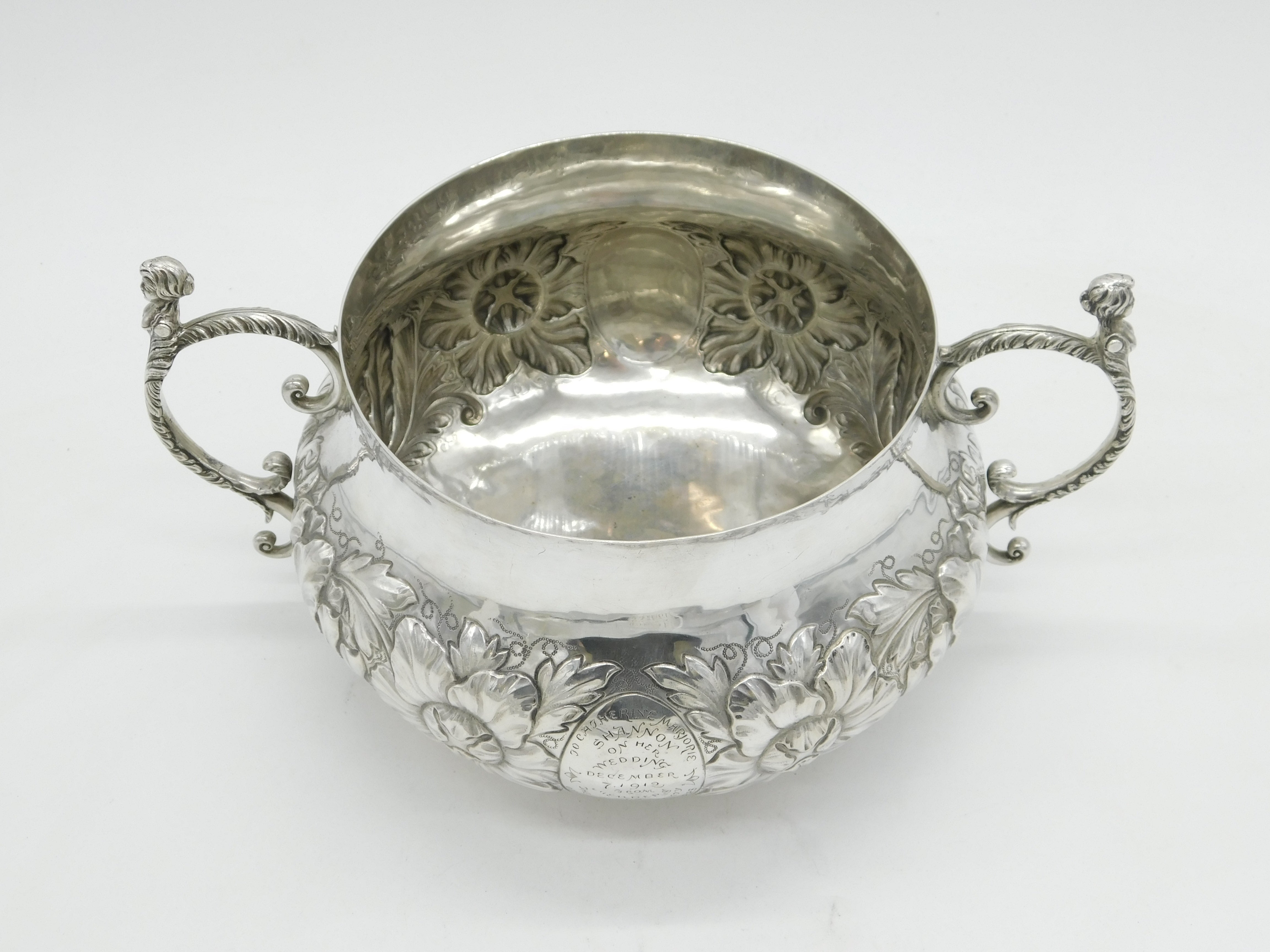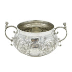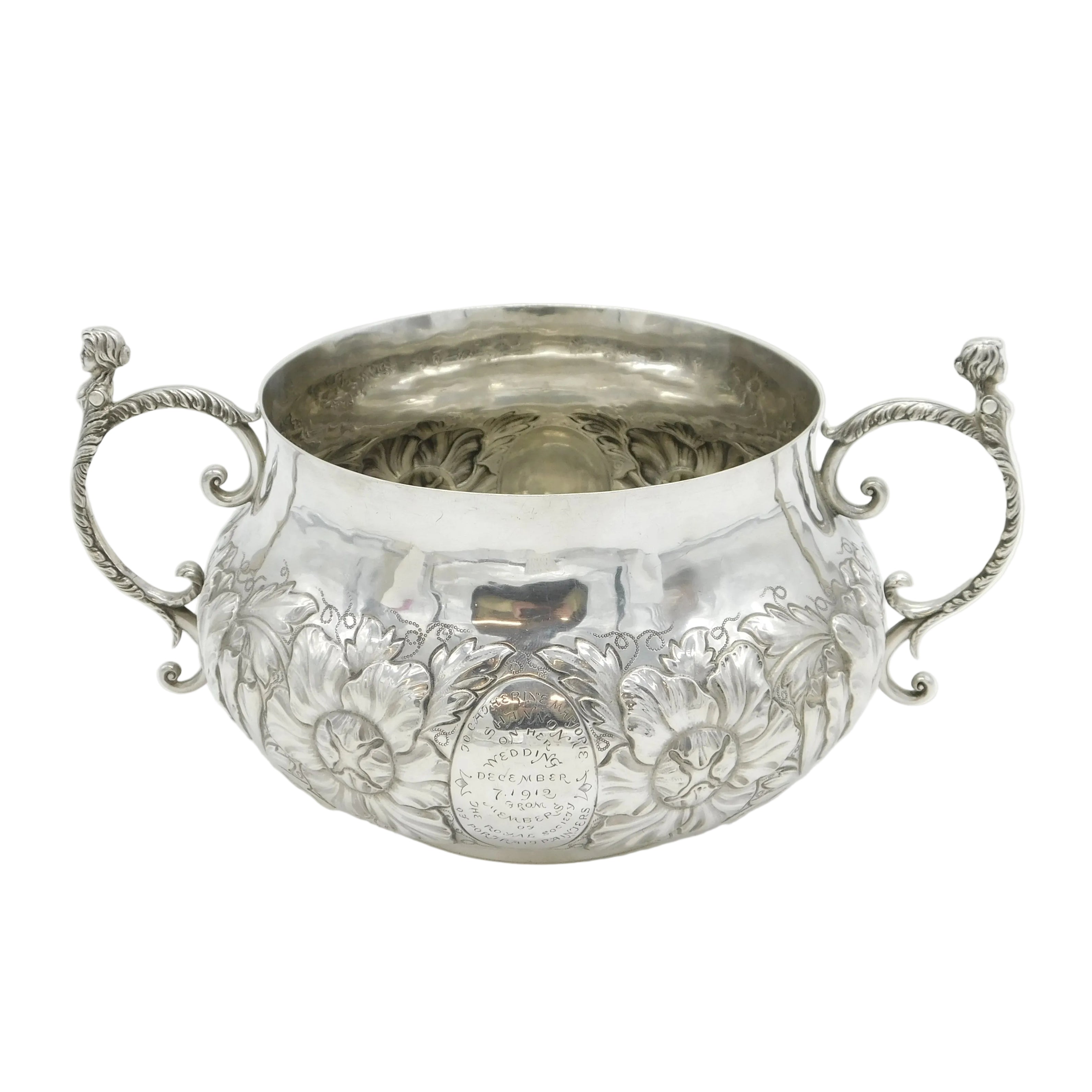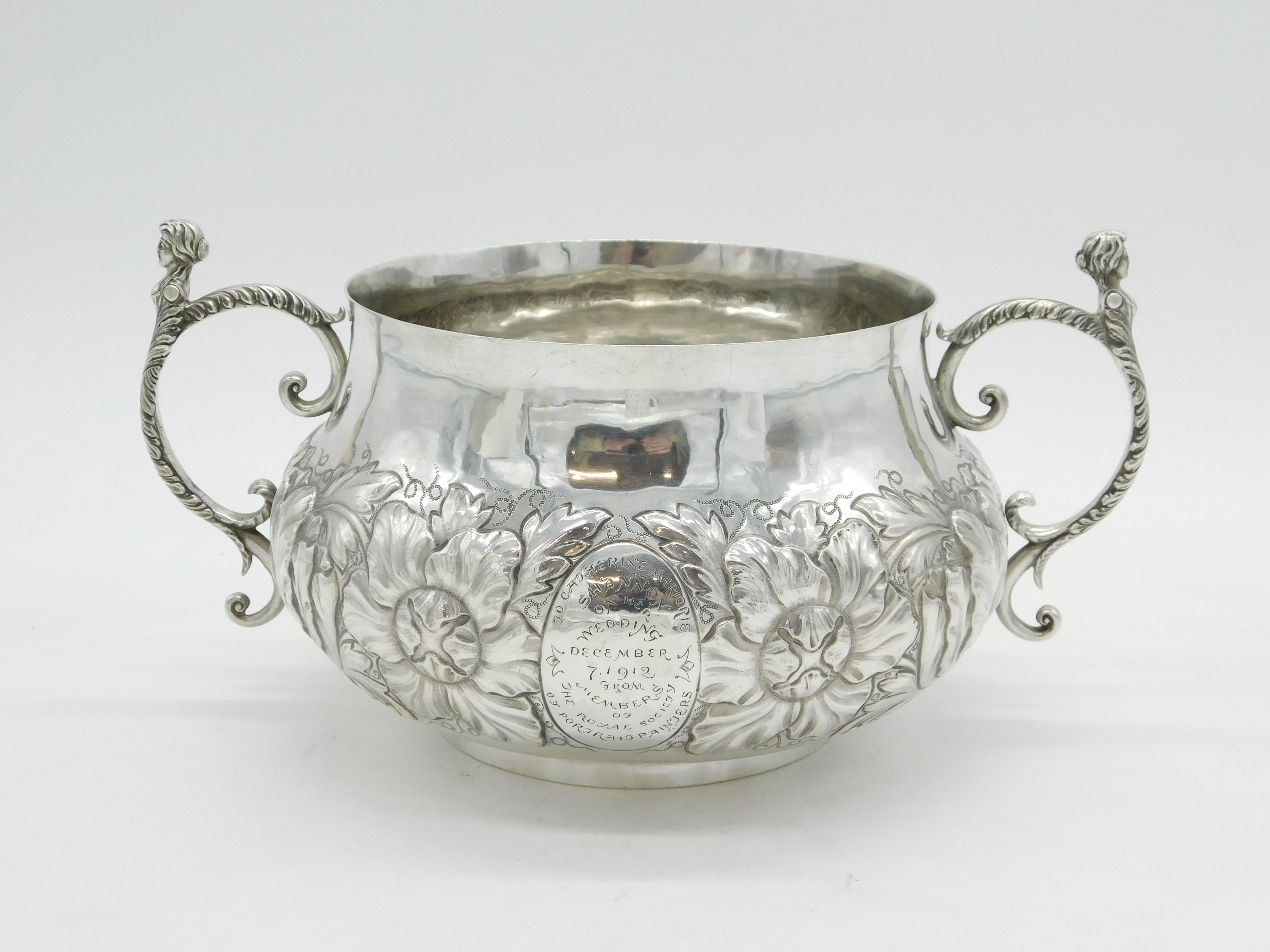 Details: A fantastic and wonderfully designed antique art deco large sterling silver 17th century style porringer with superb floral embossed decoration and cast caryatid handles. Hallmarked Birmingham 1911 by The Duchess of Sutherland Cripples Guild and equally includes the Guild mark to the base. The porringer features an engraving to the front detailing that the item was given to Catherine Marjorie Shannon on her wedding day by the Royal Society of Portrait Painters'. 'Kitty' Shannon was an esteemed English artist and illustrator. A lovely porringer in excellent condition. This is a wonderful item that would make a perfect gift or addition to any collection. We are more than happy to provide XRF reports for items upon request.
