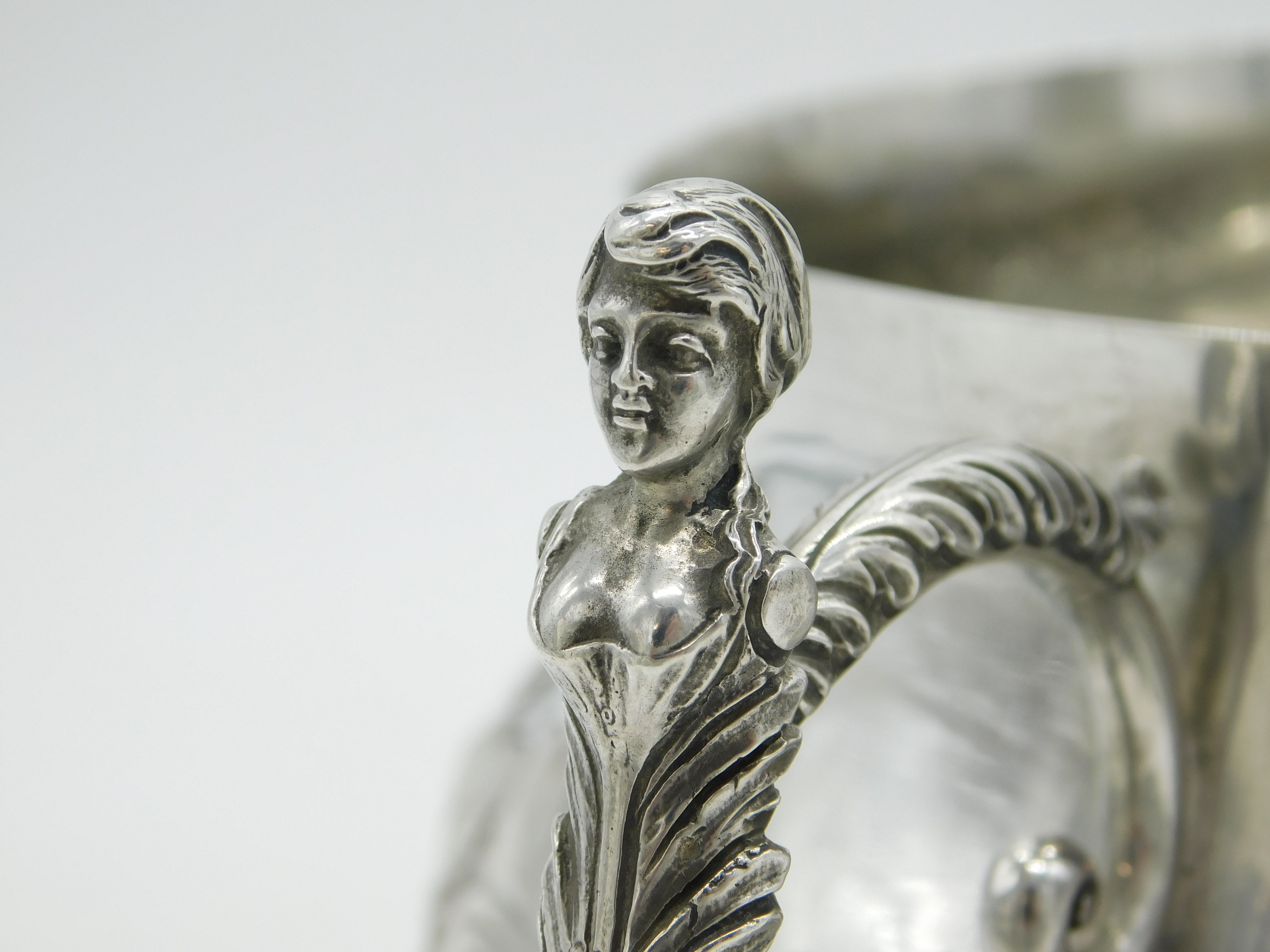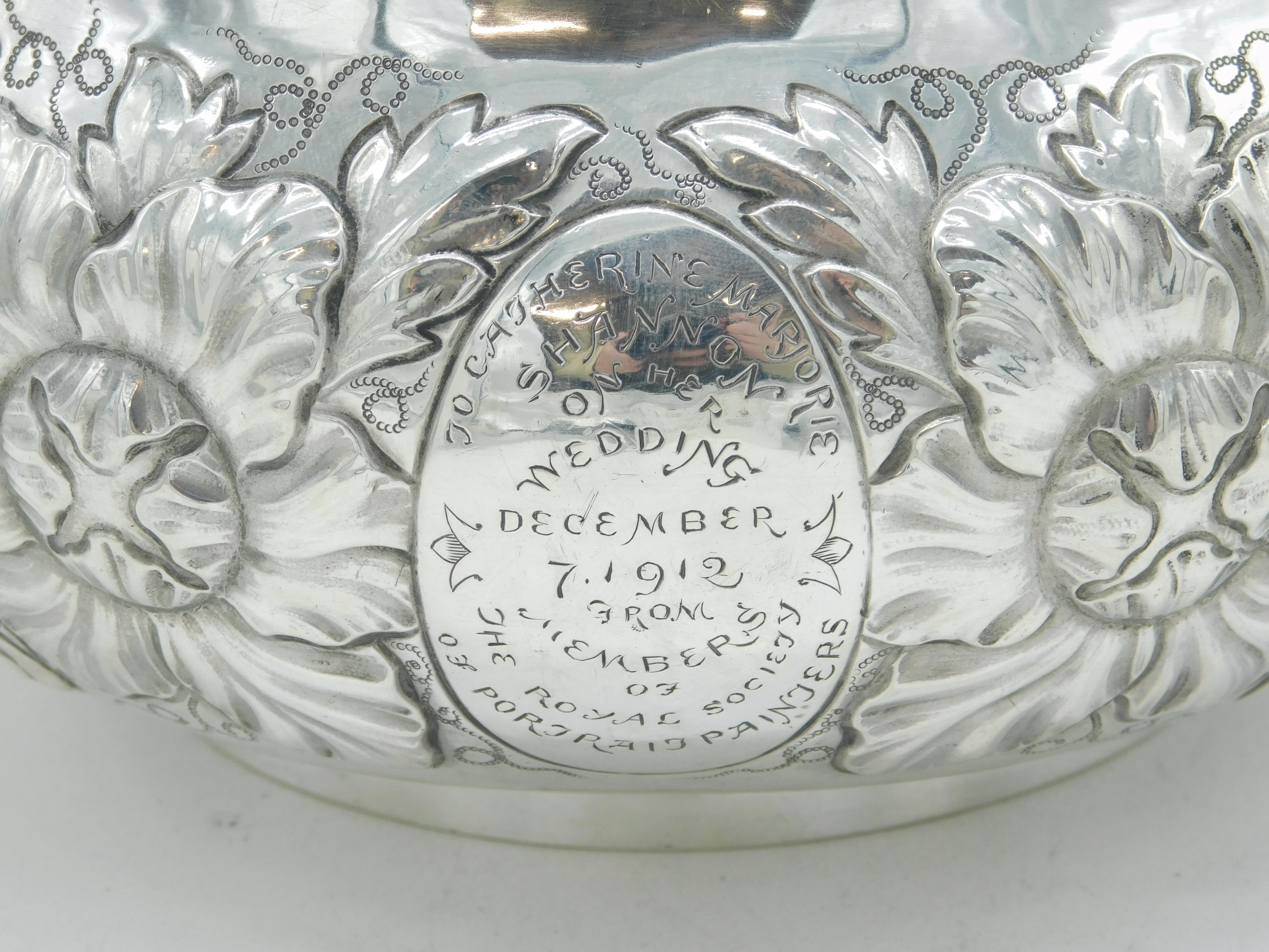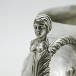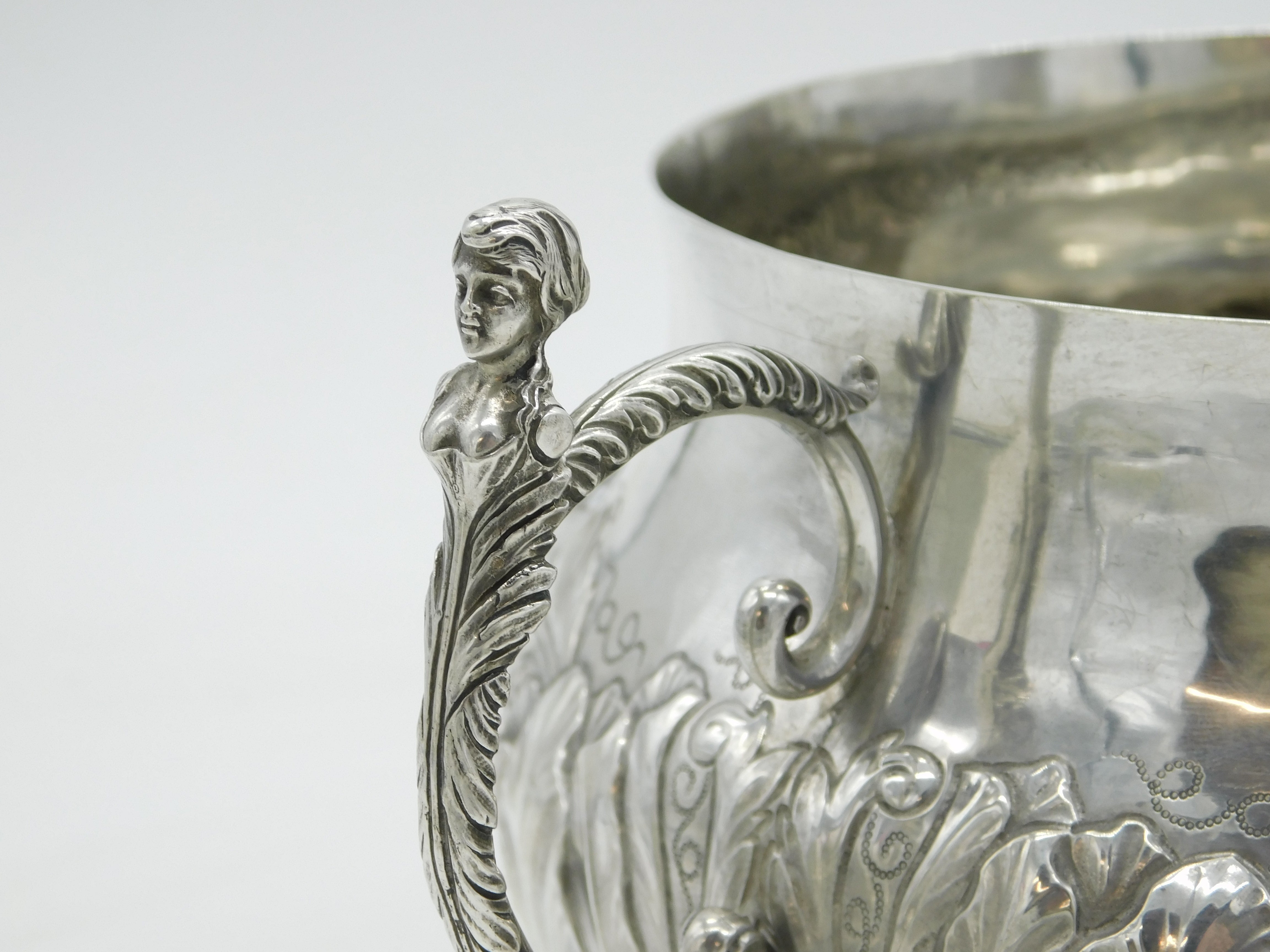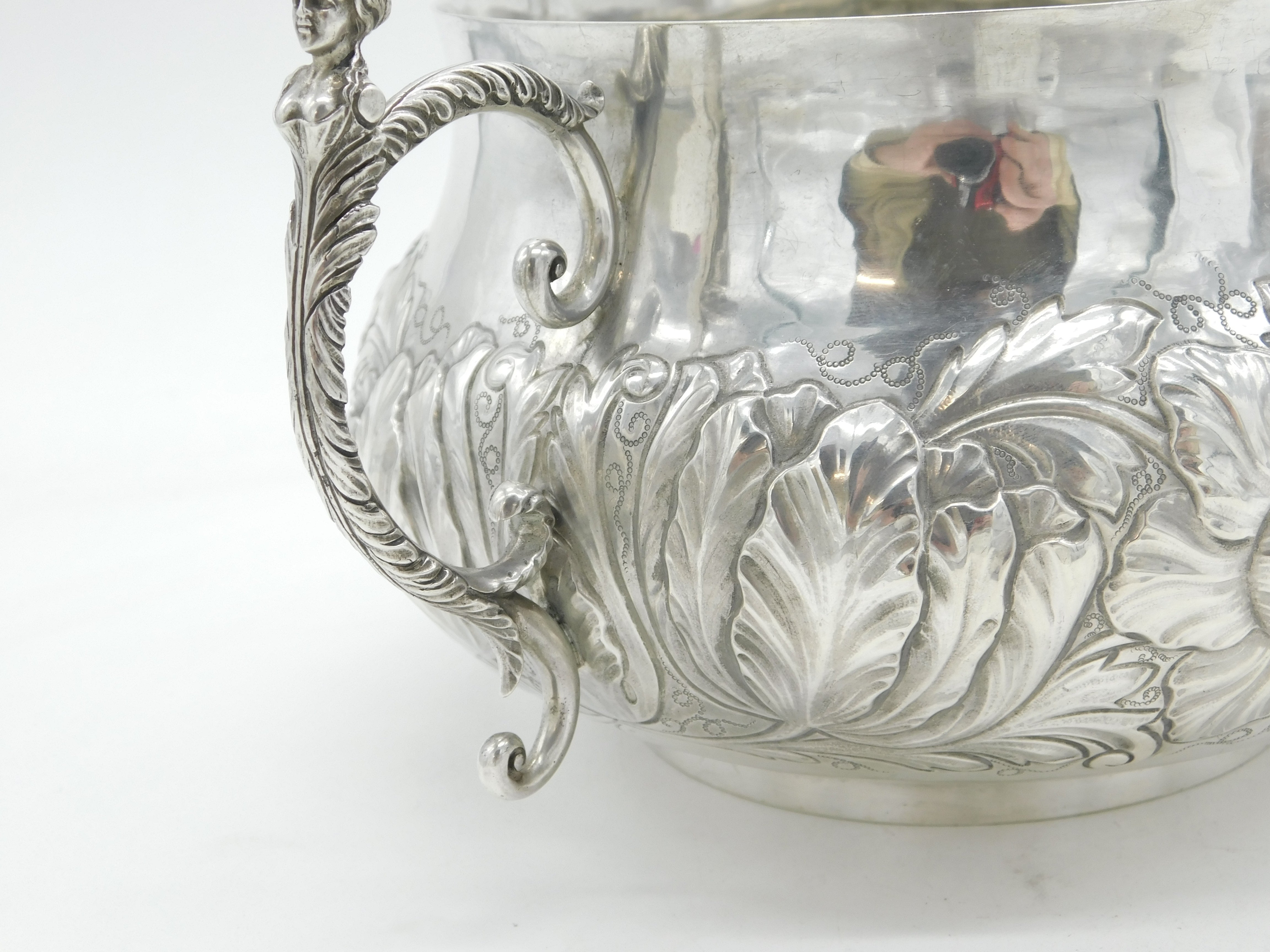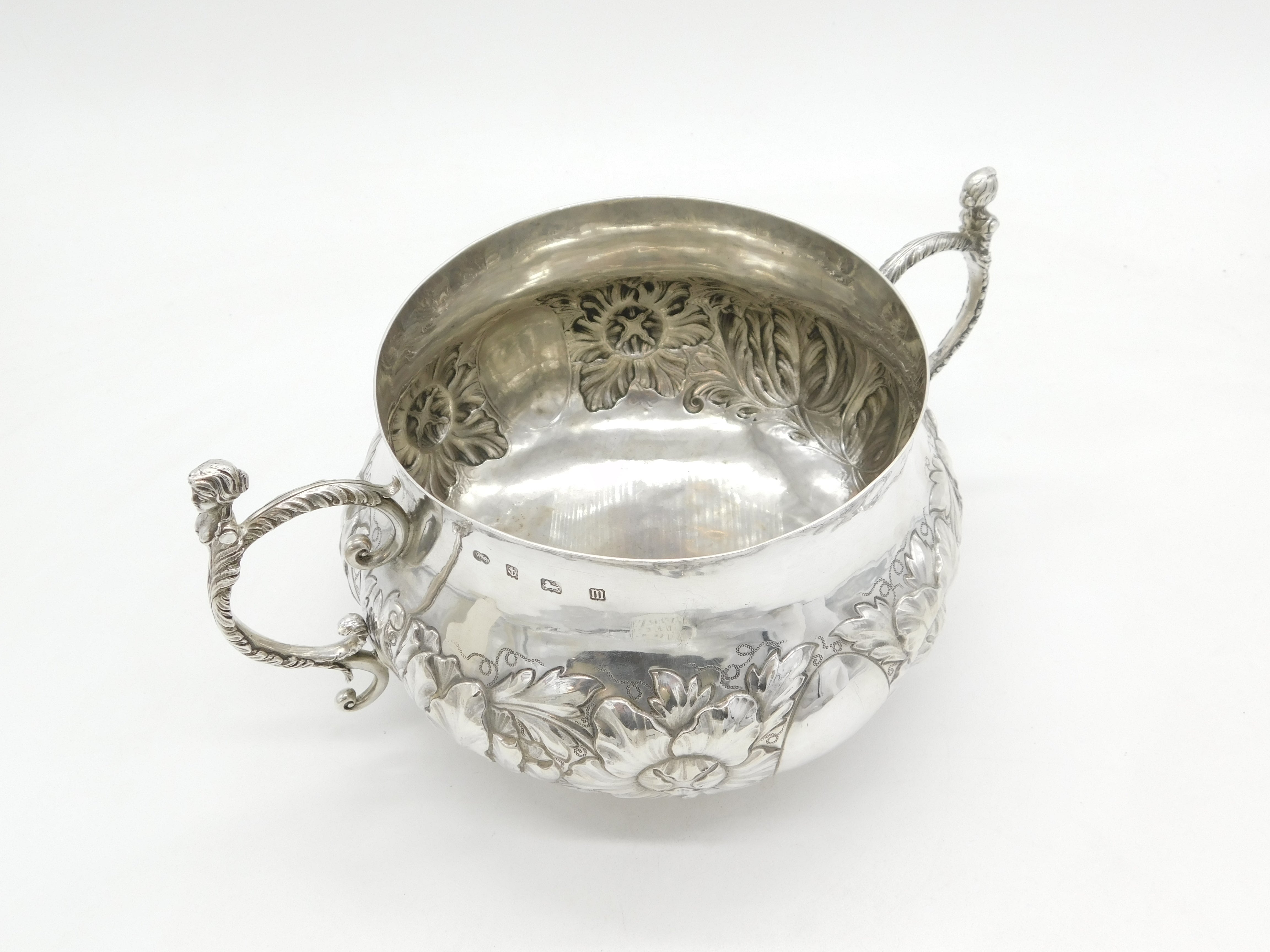 Details: A fantastic and wonderfully designed antique art deco large sterling silver 17th century style porringer with superb floral embossed decoration and cast caryatid handles. Hallmarked Birmingham 1911 by The Duchess of Sutherland Cripples Guild and equally includes the Guild mark to the base. The porringer features an engraving to the front detailing that the item was given to Catherine Marjorie Shannon on her wedding day by the Royal Society of Portrait Painters'. 'Kitty' Shannon was an esteemed English artist and illustrator. A lovely porringer in excellent condition. This is a wonderful item that would make a perfect gift or addition to any collection. We are more than happy to provide XRF reports for items upon request.