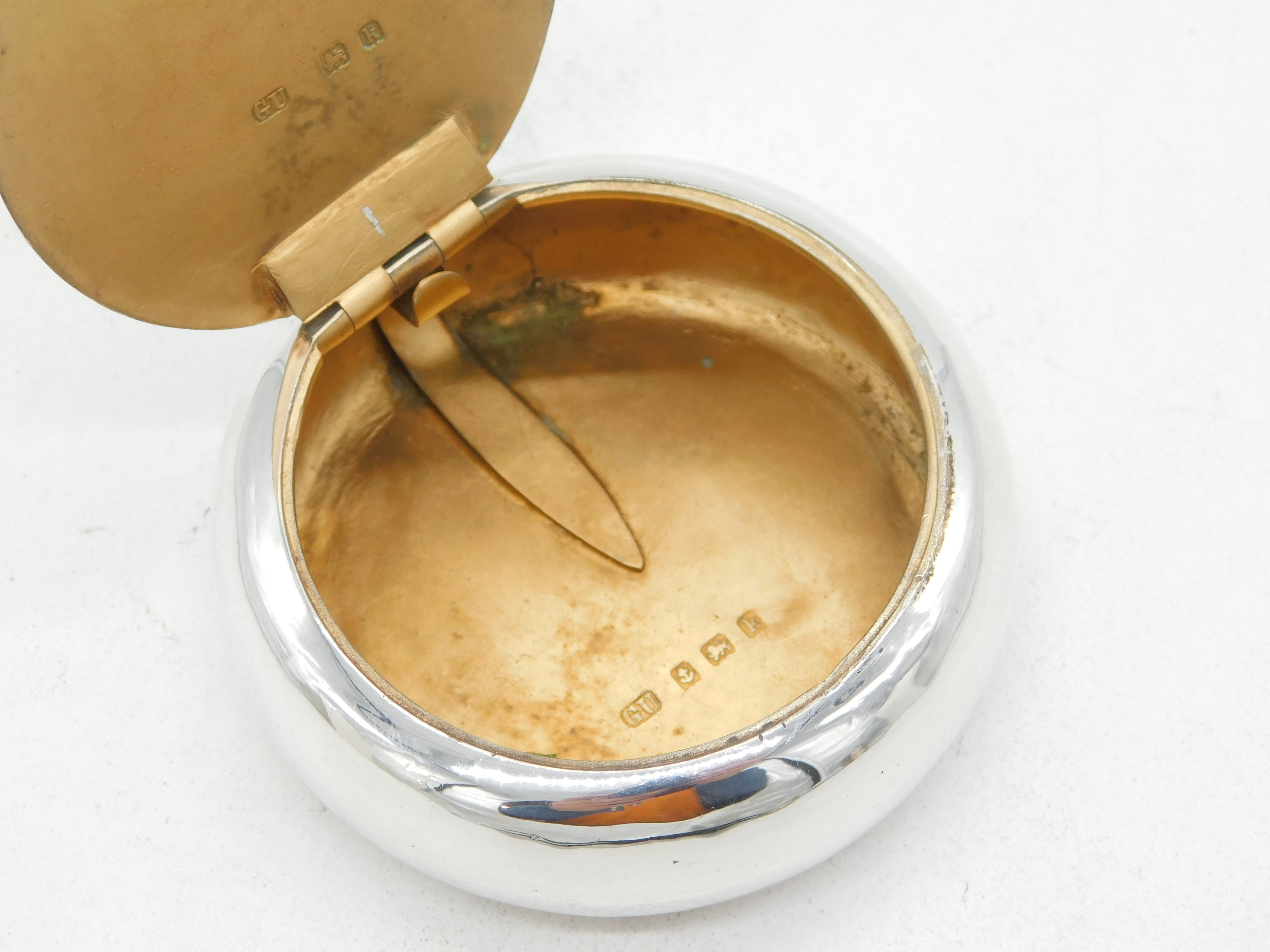 Details: A fantastic and wonderfully designed antique Edwardian sterling silver circular snuff box with lovely gilded interior hallmarked Birmingham 1909 by George Unite. This is a wonderful item that would make a perfect gift or addition to any collection. We are more than happy to provide XRF reports for items upon request.