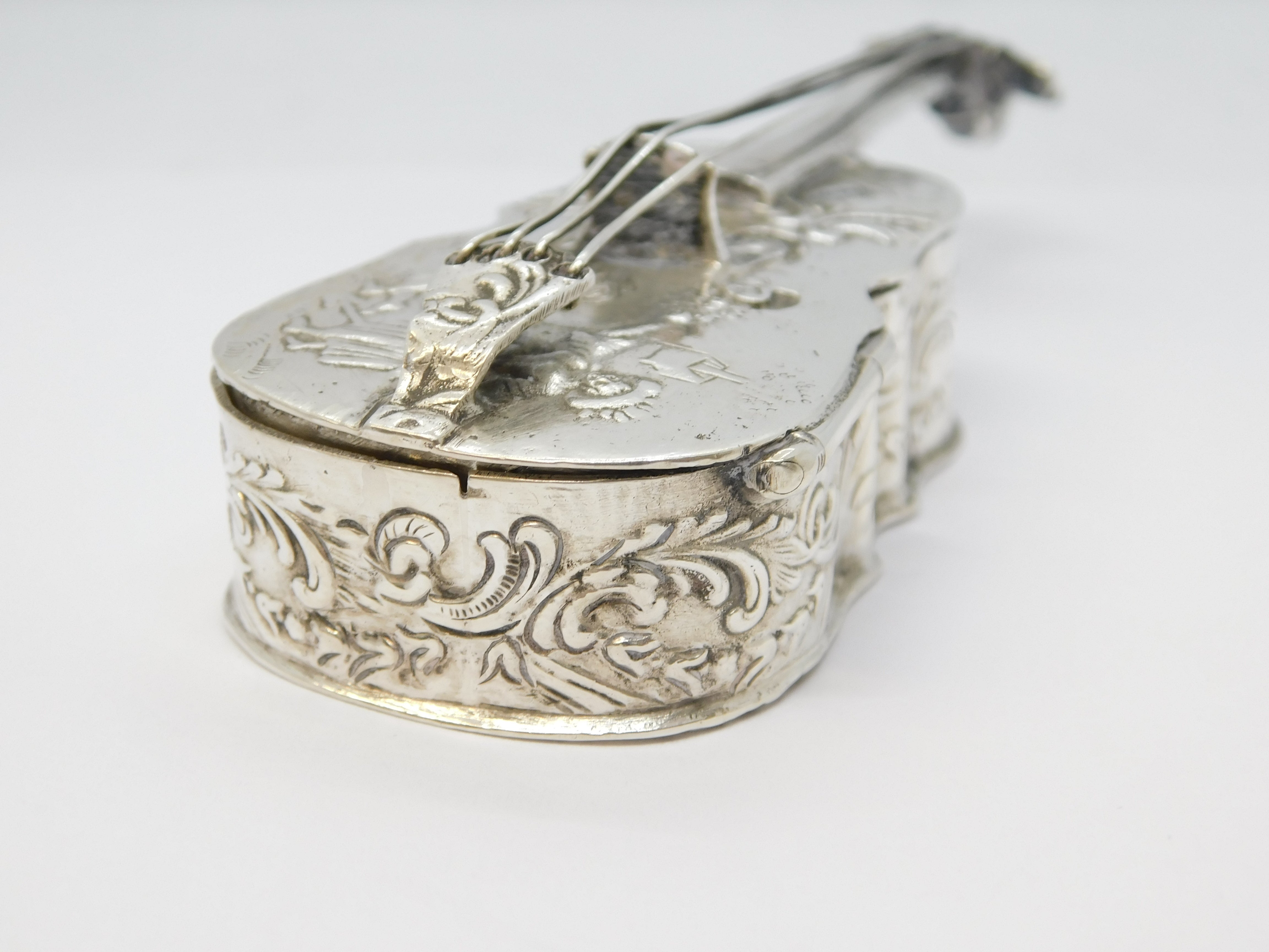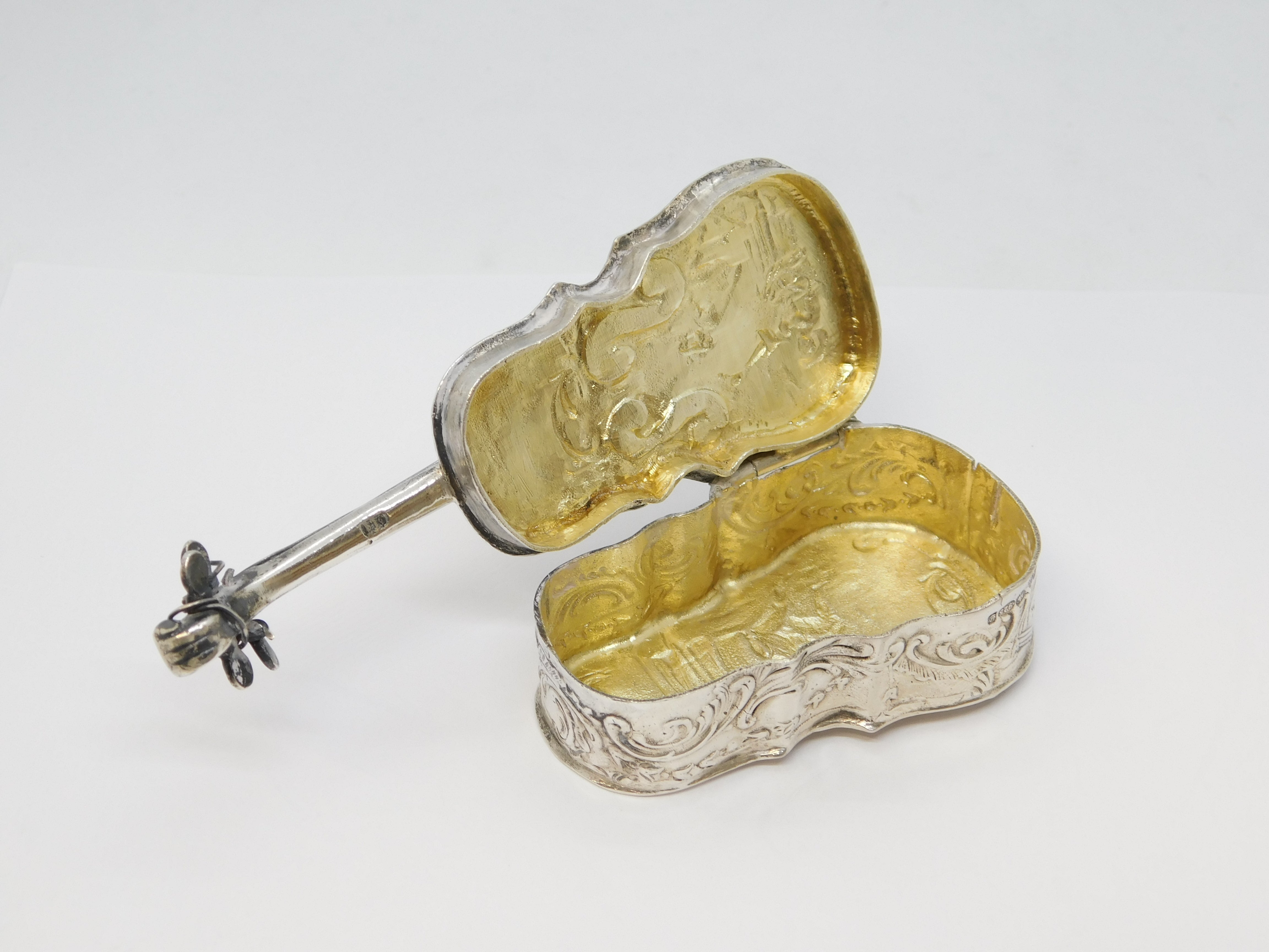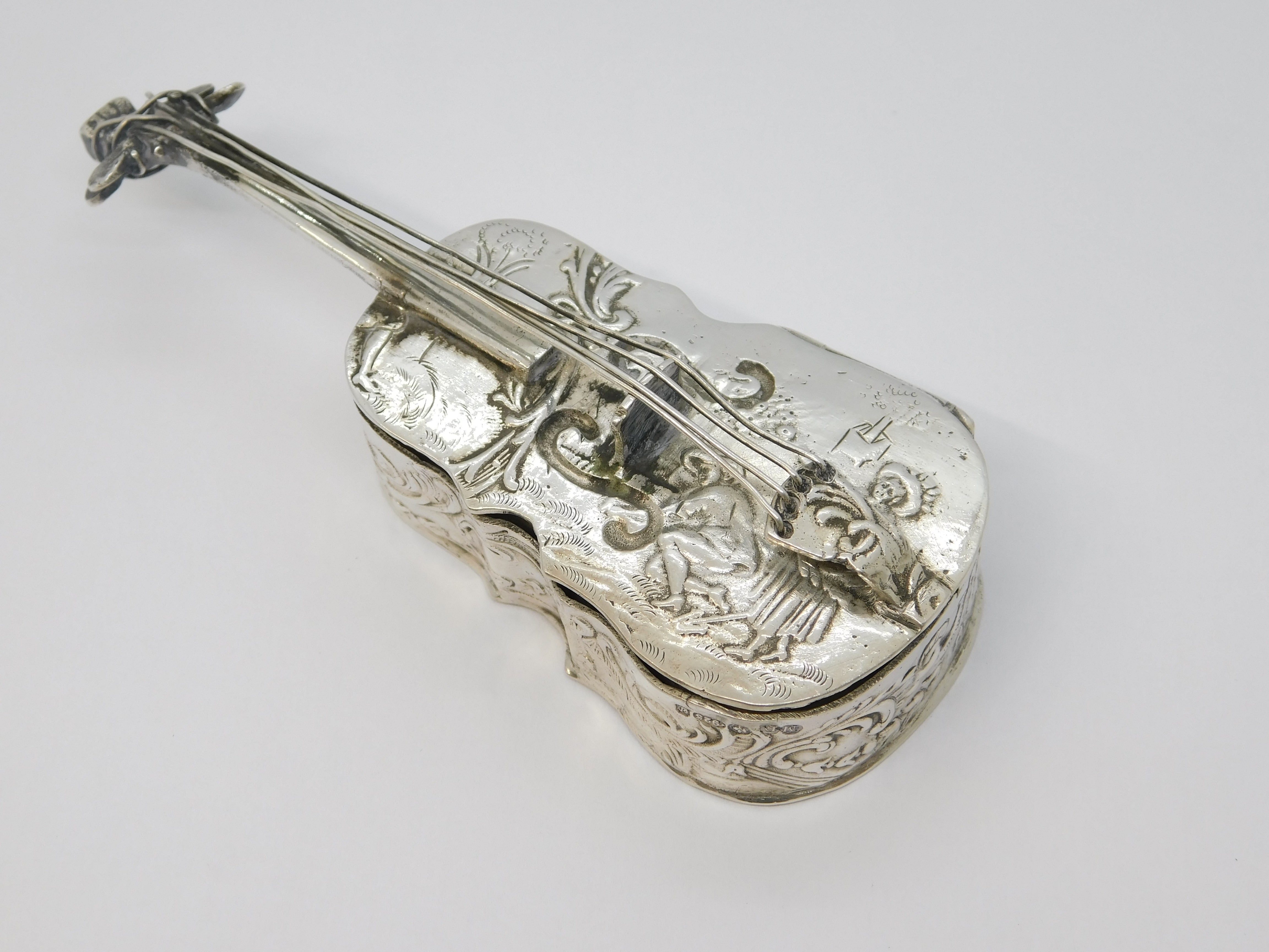Details: A fantastic and wonderfully designed antique Edwardian sterling silver novelty snuff box in the form of a cello or violin with lovely regency scenes embossed throughout, gilded to the interior, hallmarked Chester 1904 by M. Friedland & Co. This is a wonderful item that would make a perfect gift or addition to any collection. We are more than happy to provide XRF reports for items upon request.