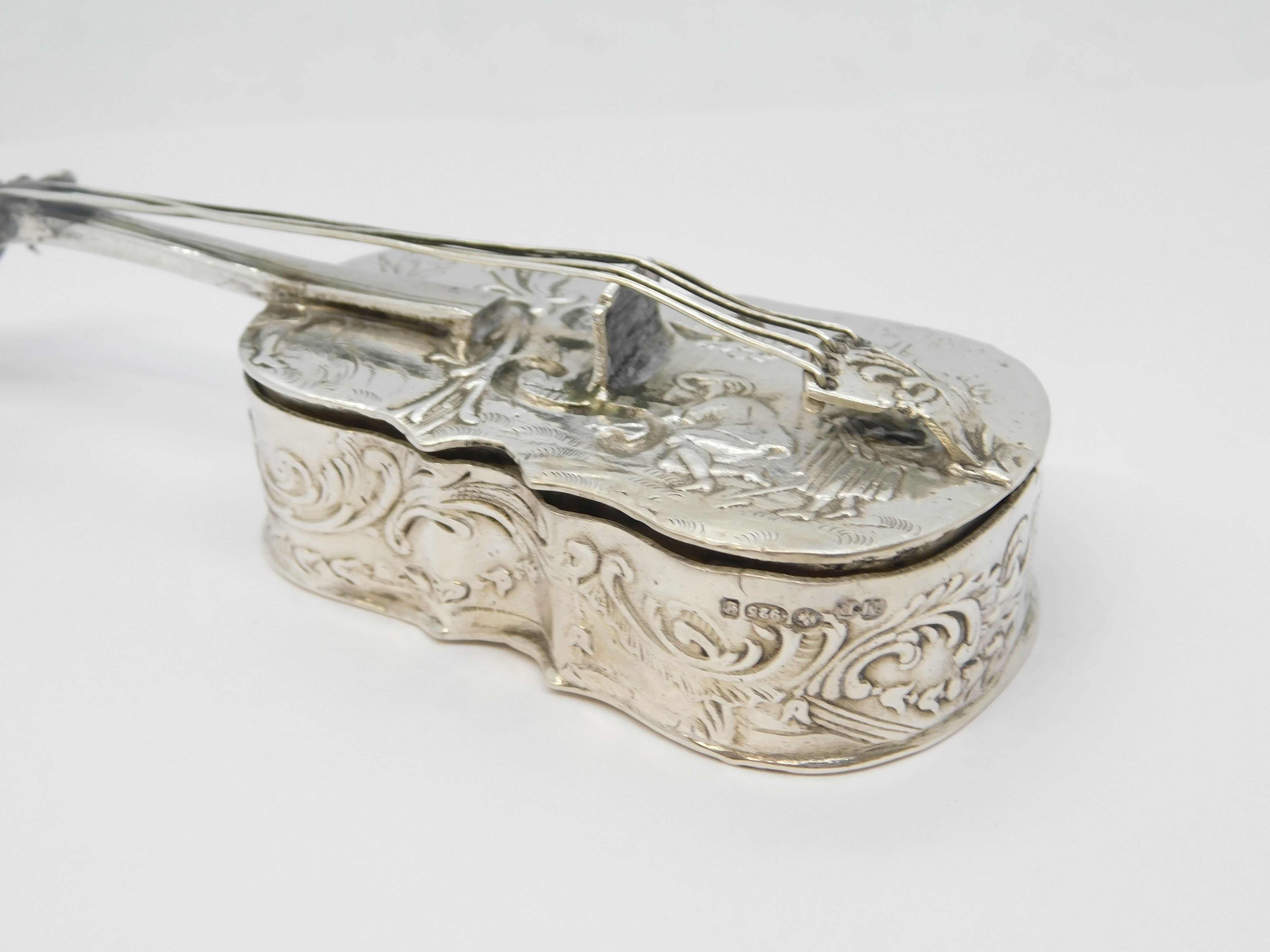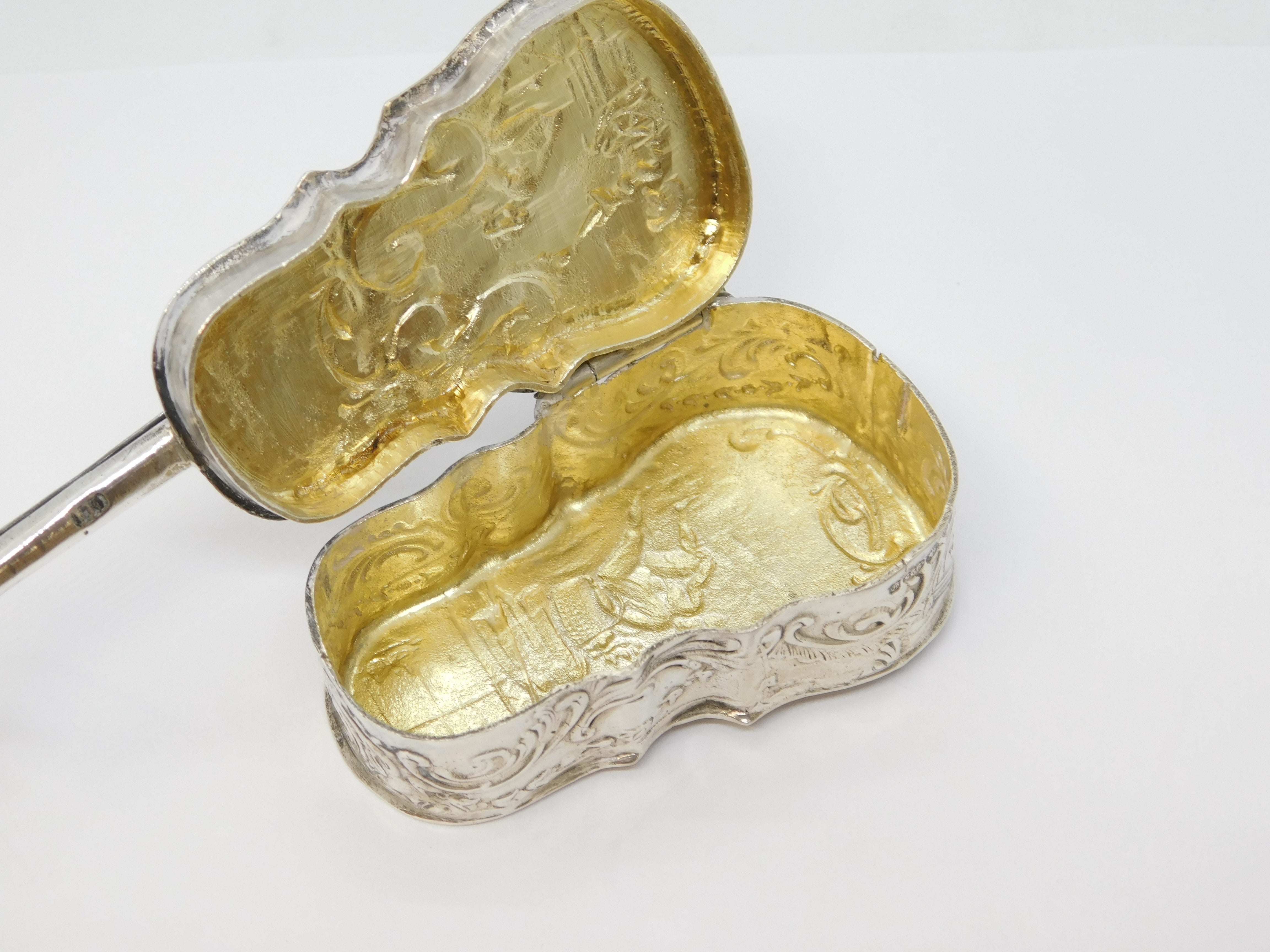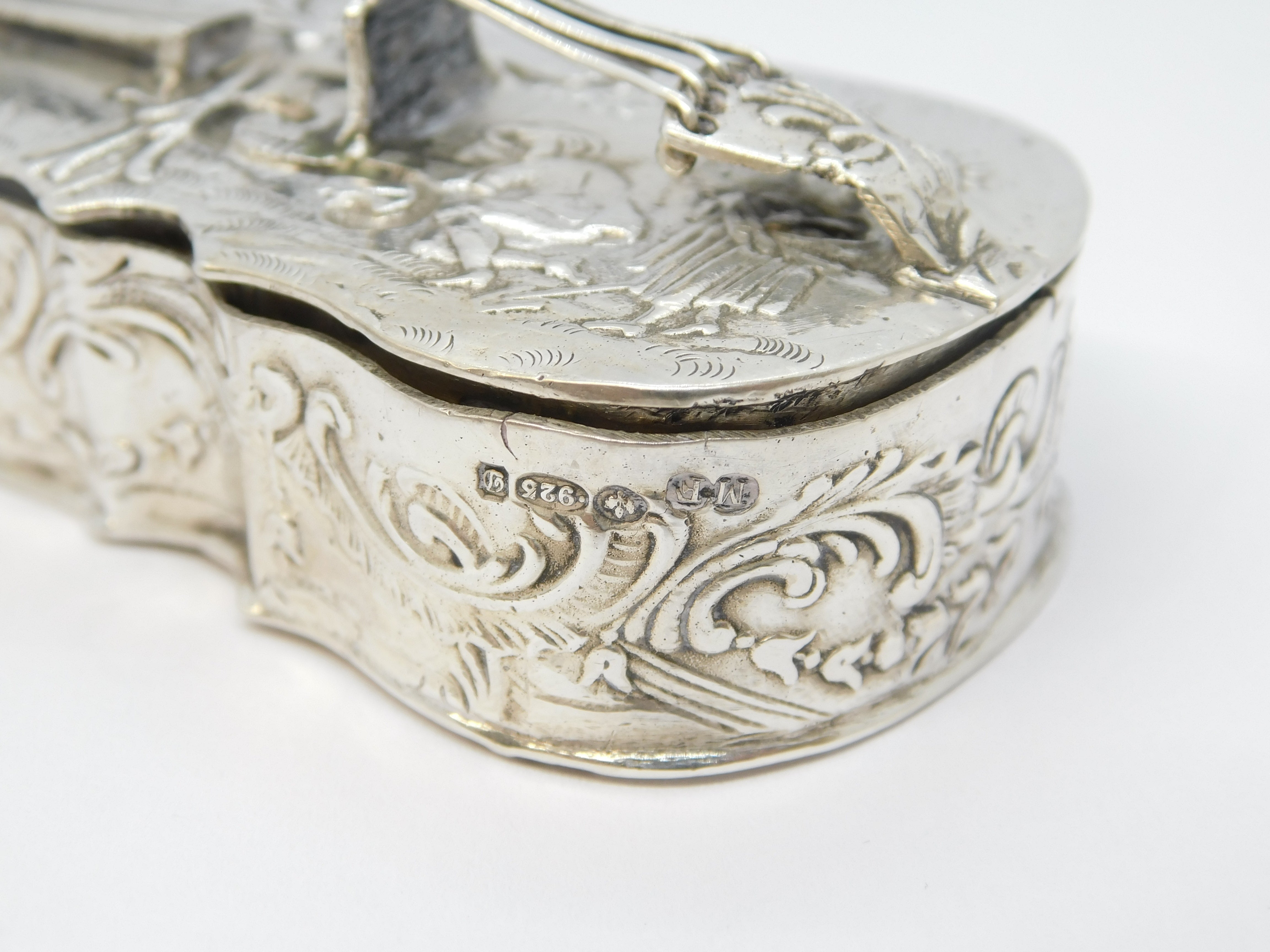 Details: A fantastic and wonderfully designed antique Edwardian sterling silver novelty snuff box in the form of a cello or violin with lovely regency scenes embossed throughout, gilded to the interior, hallmarked Chester 1904 by M. Friedland & Co. This is a wonderful item that would make a perfect gift or addition to any collection. We are more than happy to provide XRF reports for items upon request.