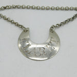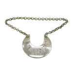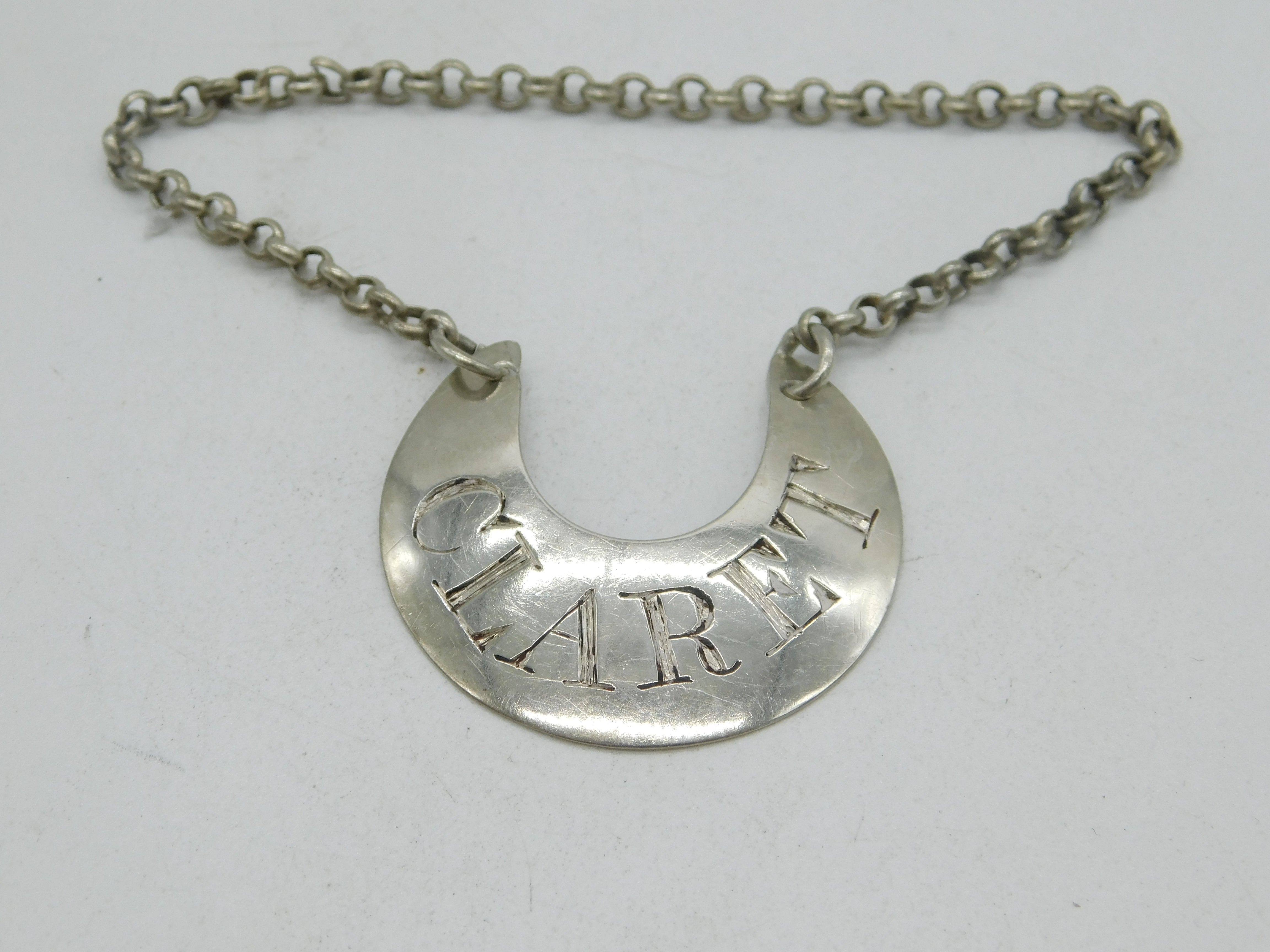 Details: A fantastic and wonderfully designed antique early-Georgian sterling silver crescent form decanter label for Claret wine with lovely detailing, unmarked, likely by Sandilands Drinkwater (purchased with a large collection of other items from the same maker), the silver has been XRF tested. This is a wonderful item that would make a perfect gift or addition to any collection. We are more than happy to provide XRF reports for items upon request.