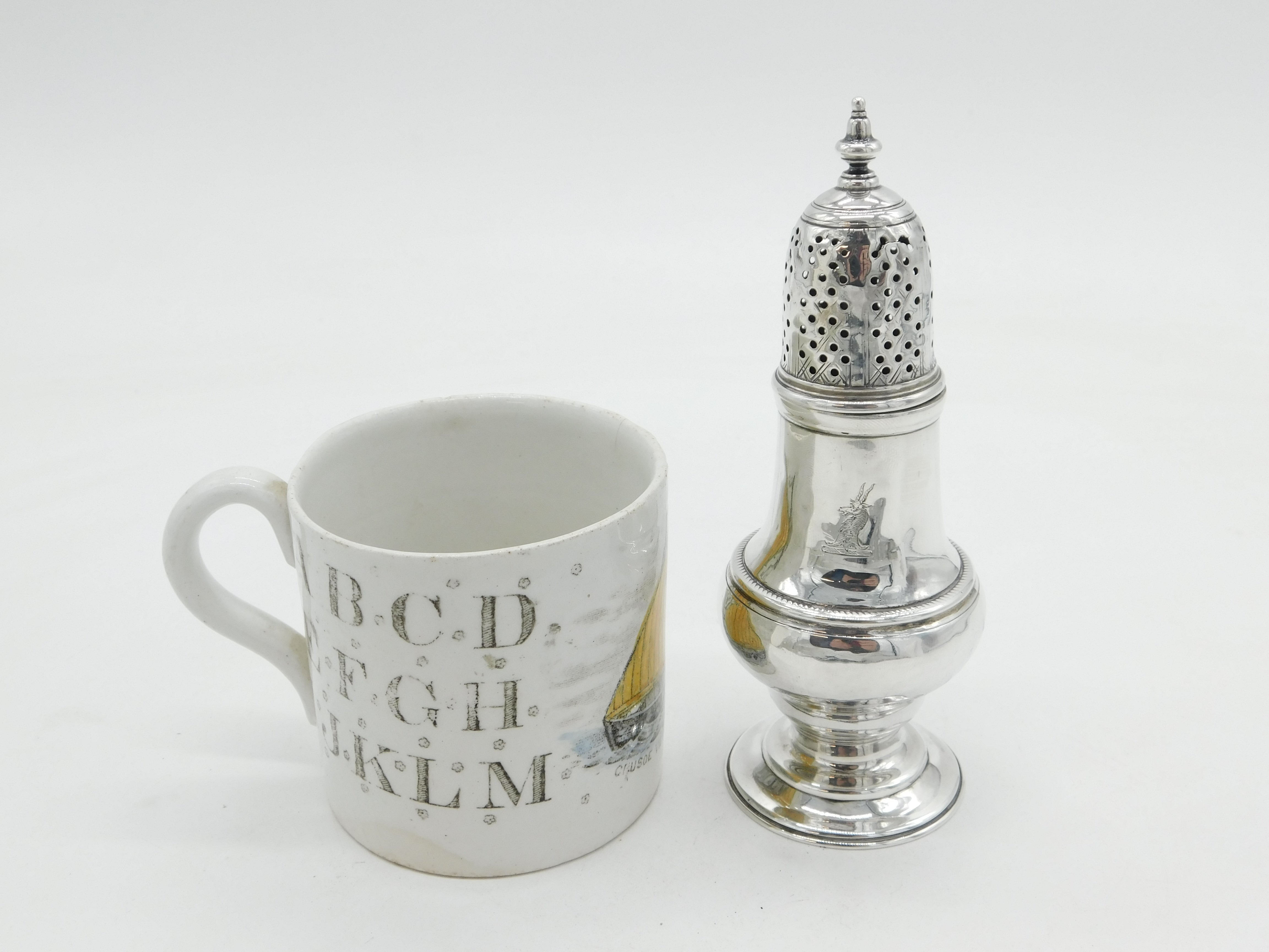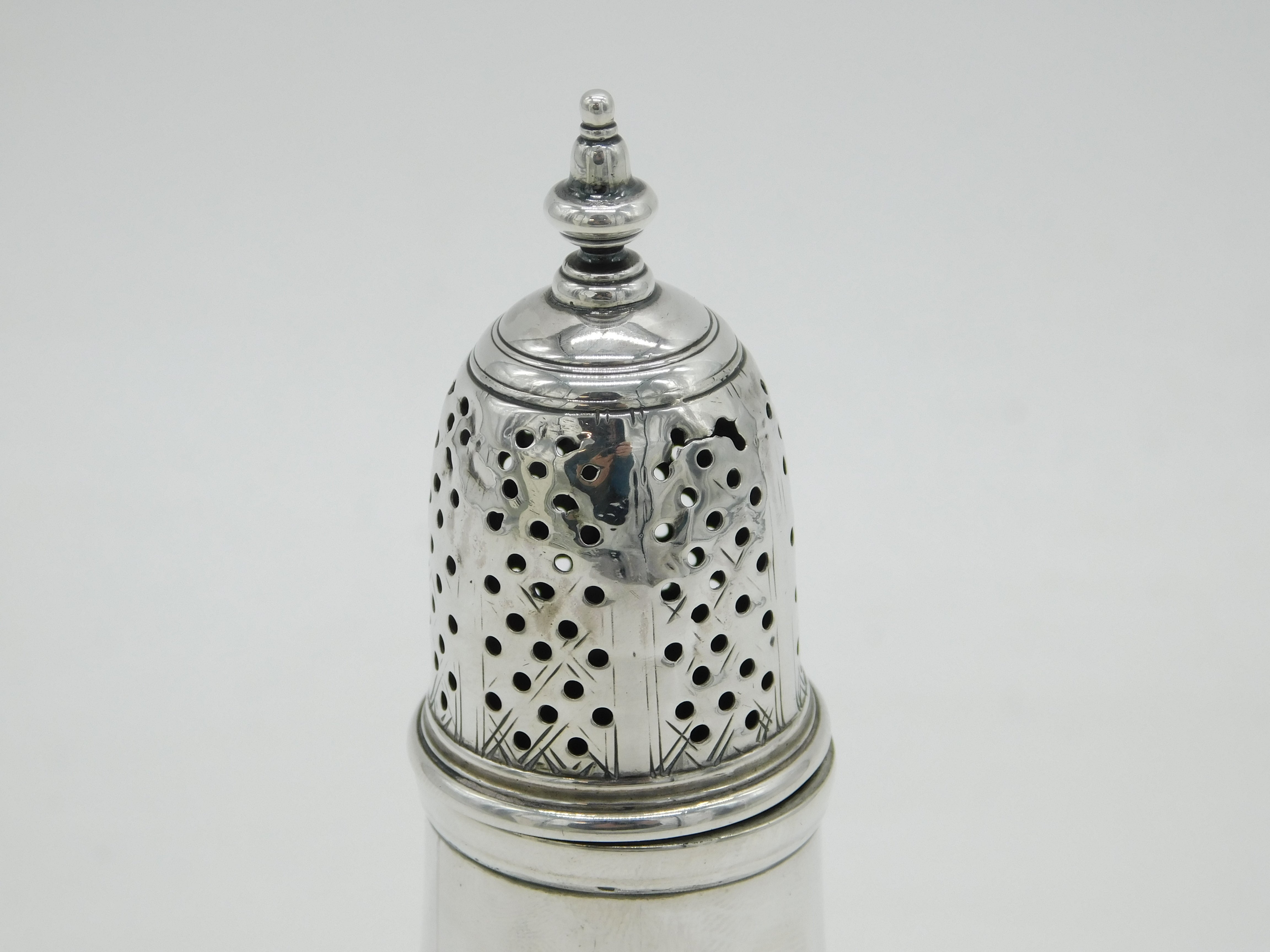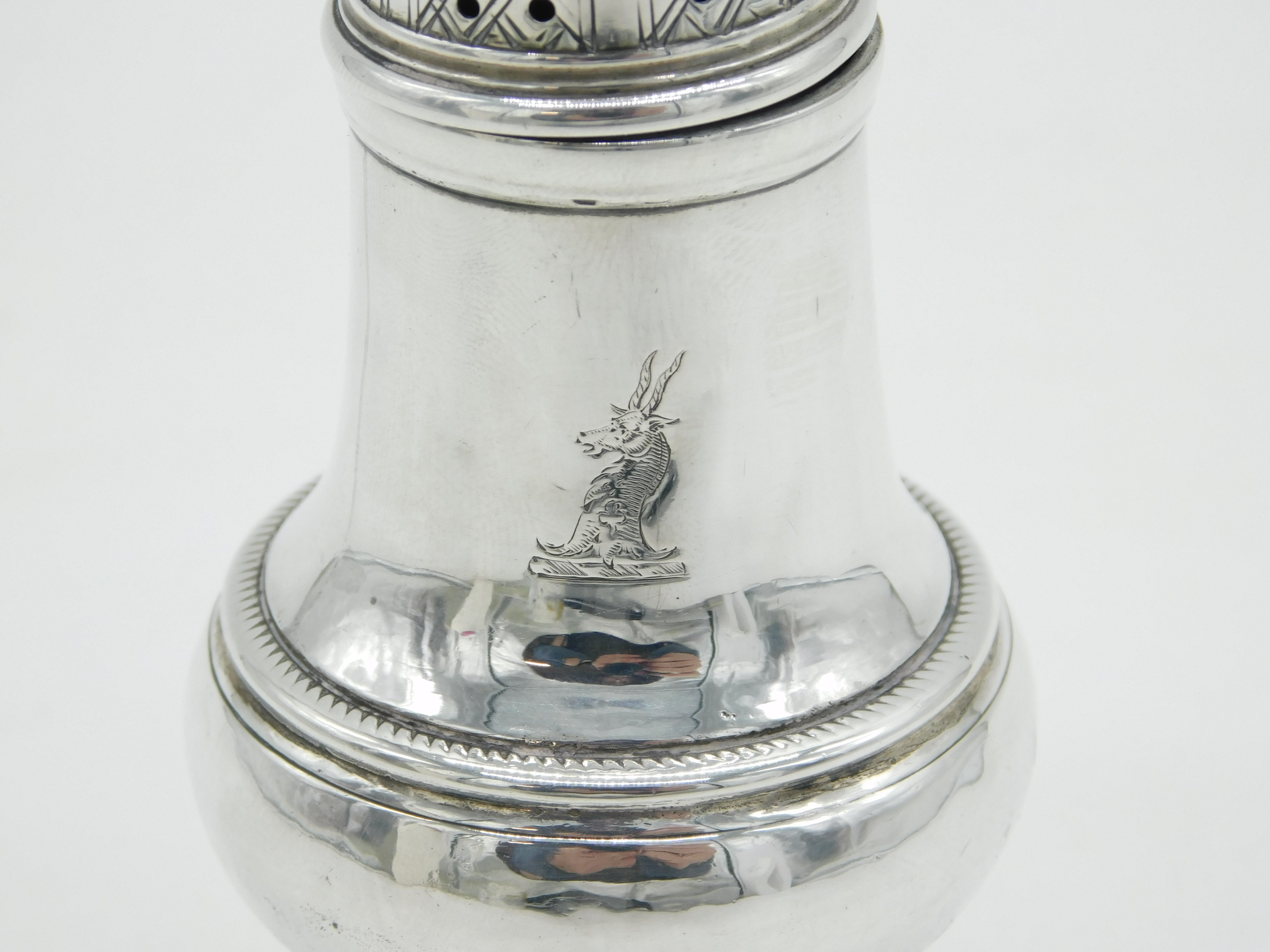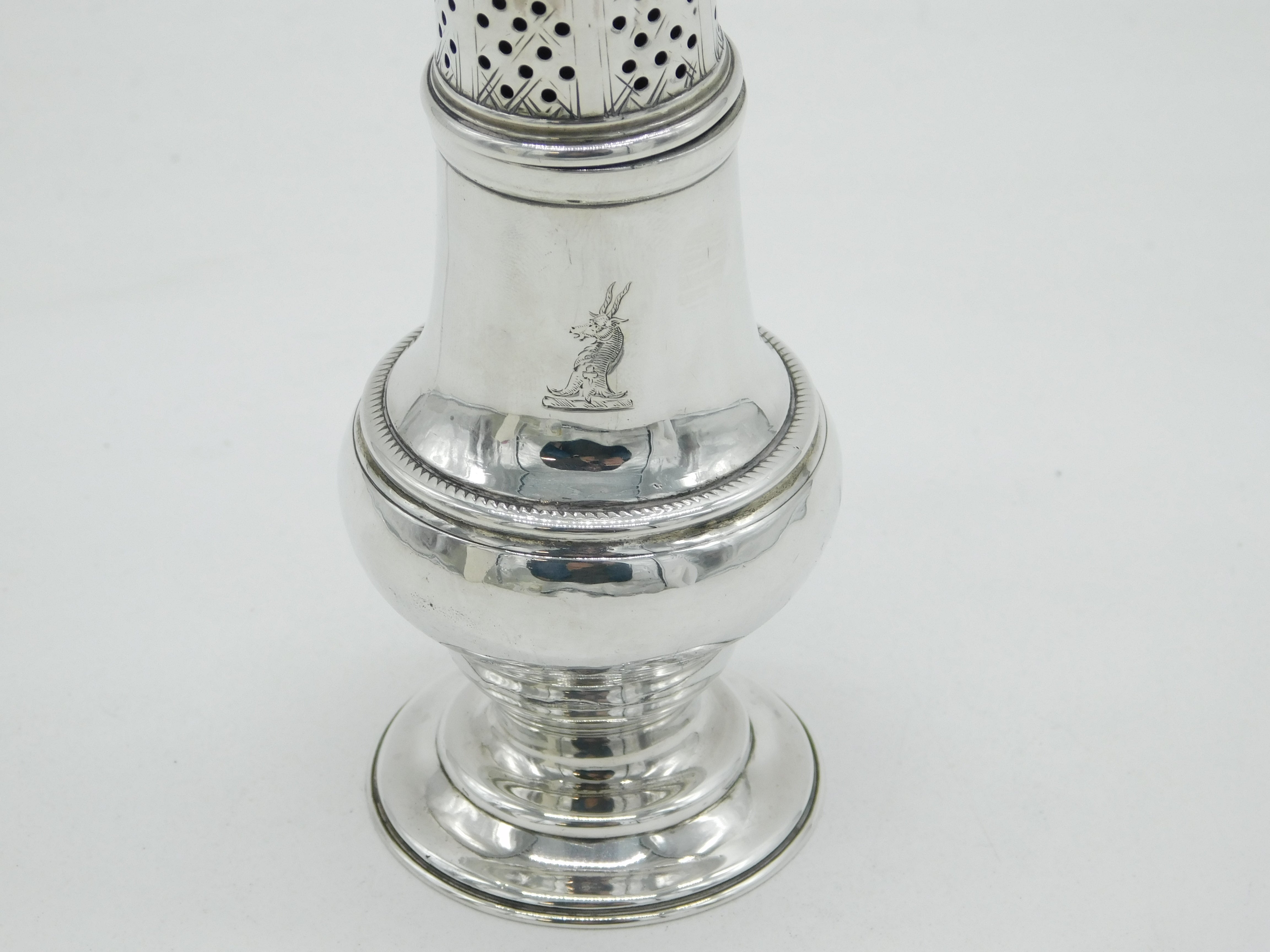 George II Sterling Silver Crested Muffineer Sugar Caster Antique 1758 London