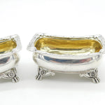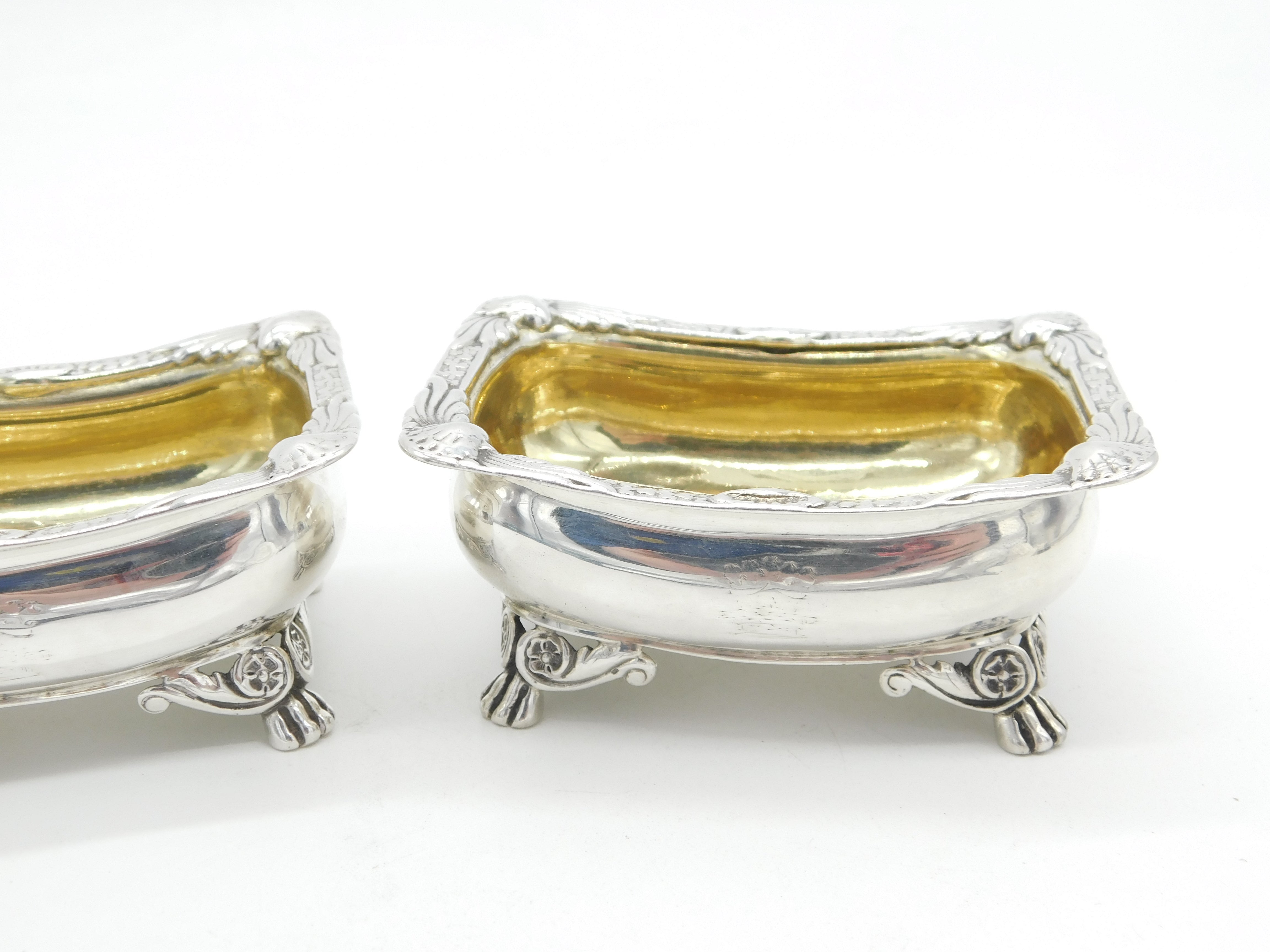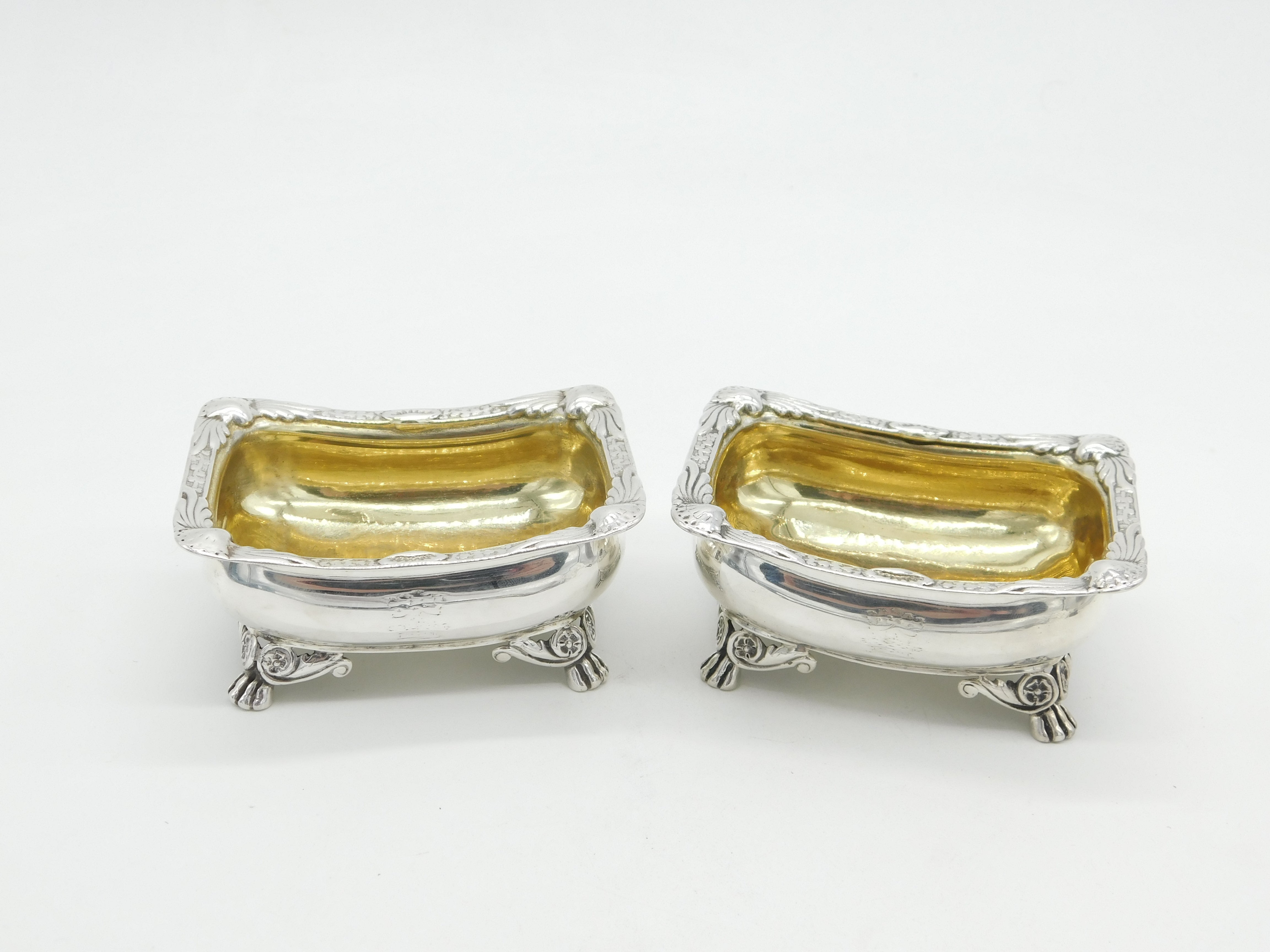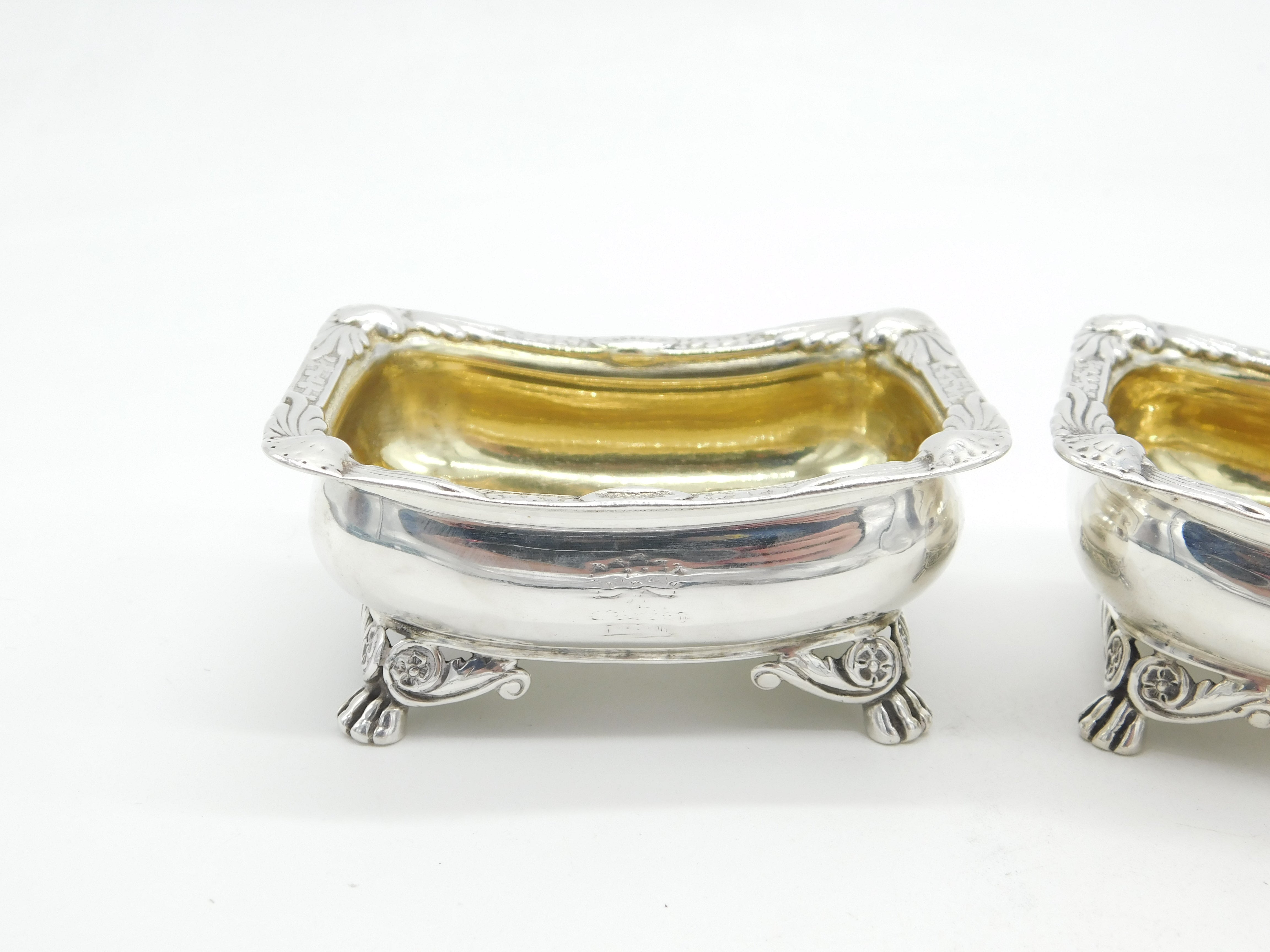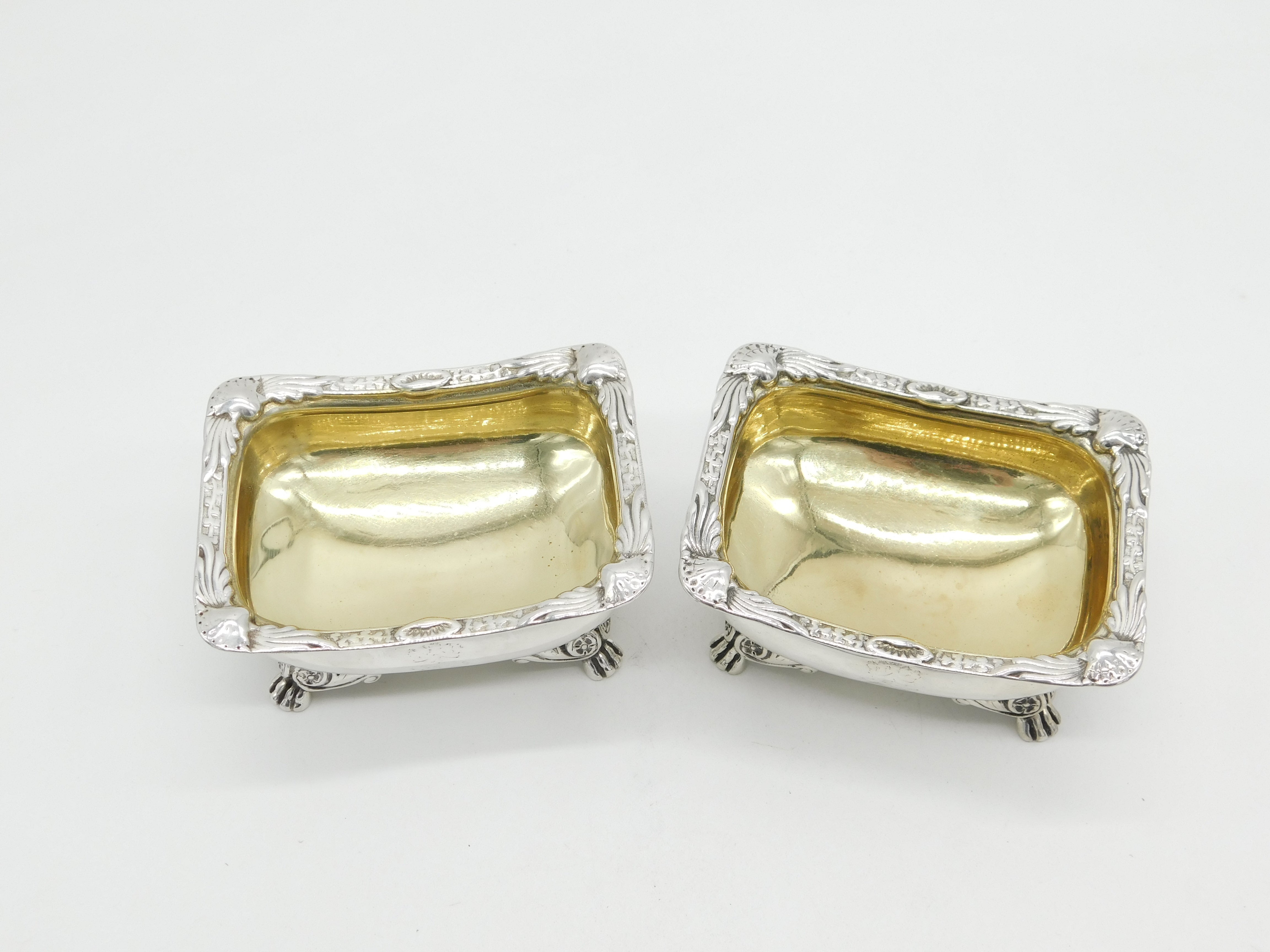 Details: A fantastic and wonderfully designed  antique georgian pair of sterling silver salt cellars with gilded interiors and charming paw feet hallmarked London 1810 by Rebecca Emes & Edward Barnard I. This is a wonderful item that would make a perfect gift or addition to any collection. The BOX pictured is for PRESENTATION ONLY and is NOT included in the listings but used to frame the pictures unless specifically stated otherwise.