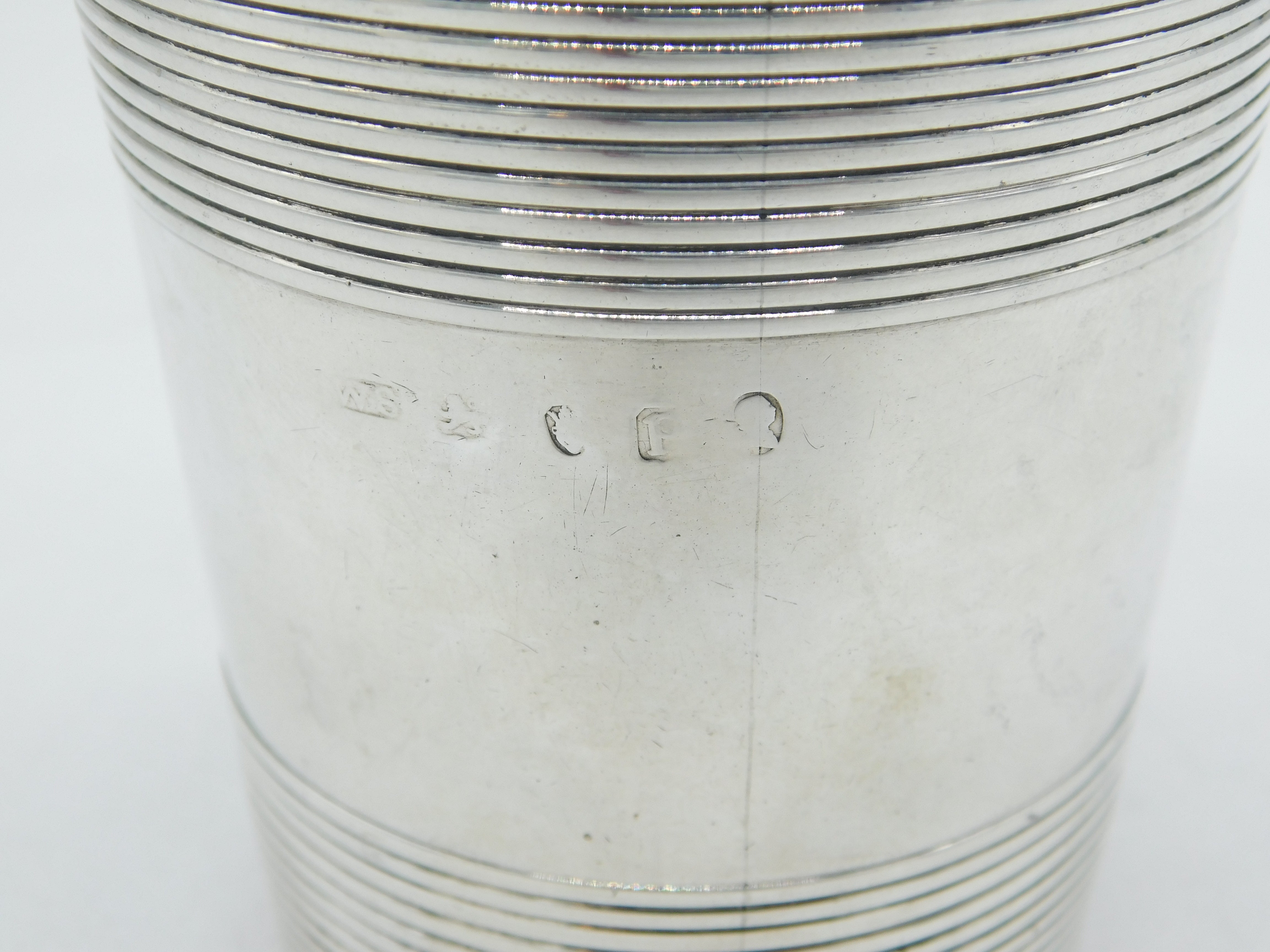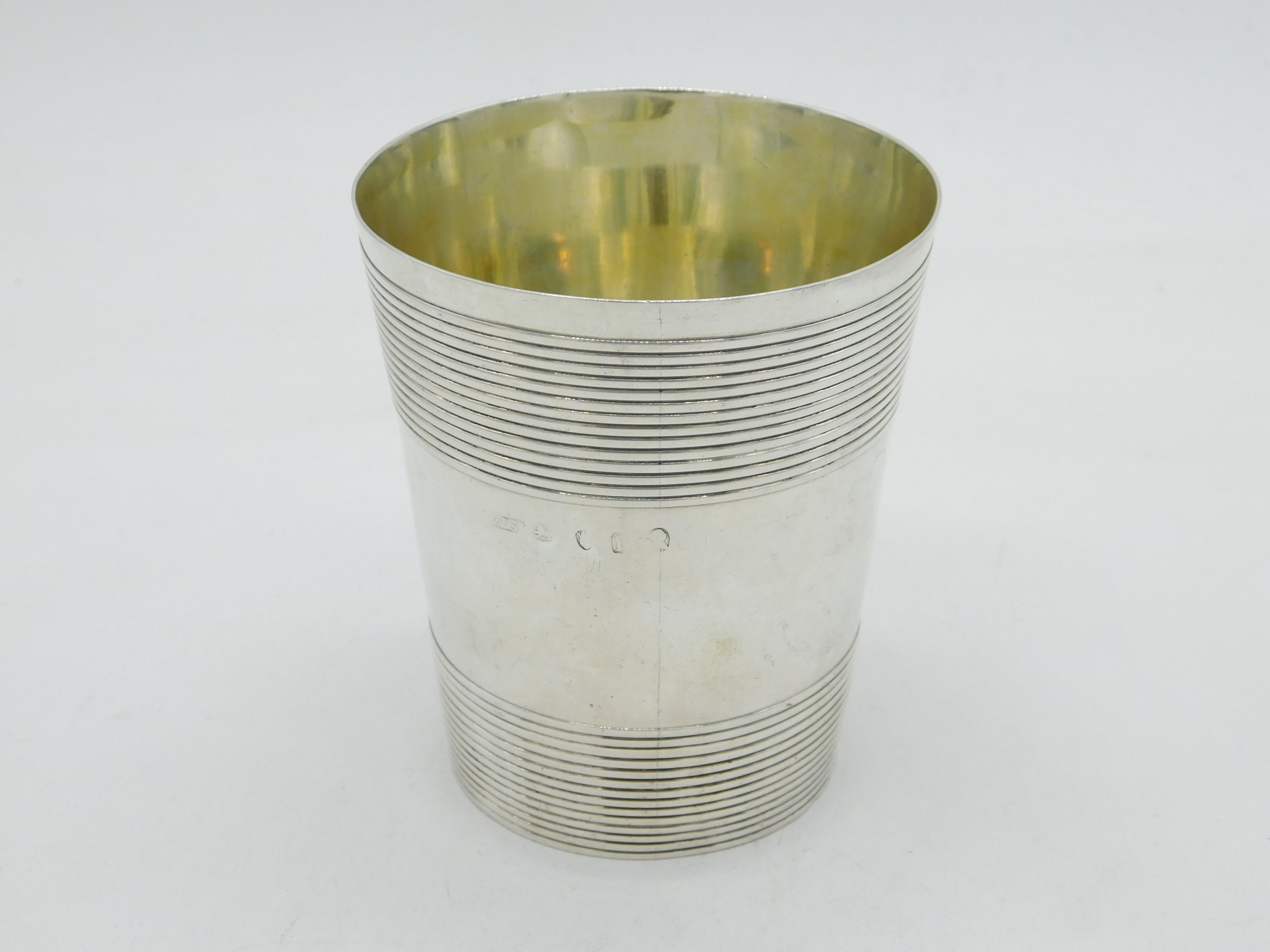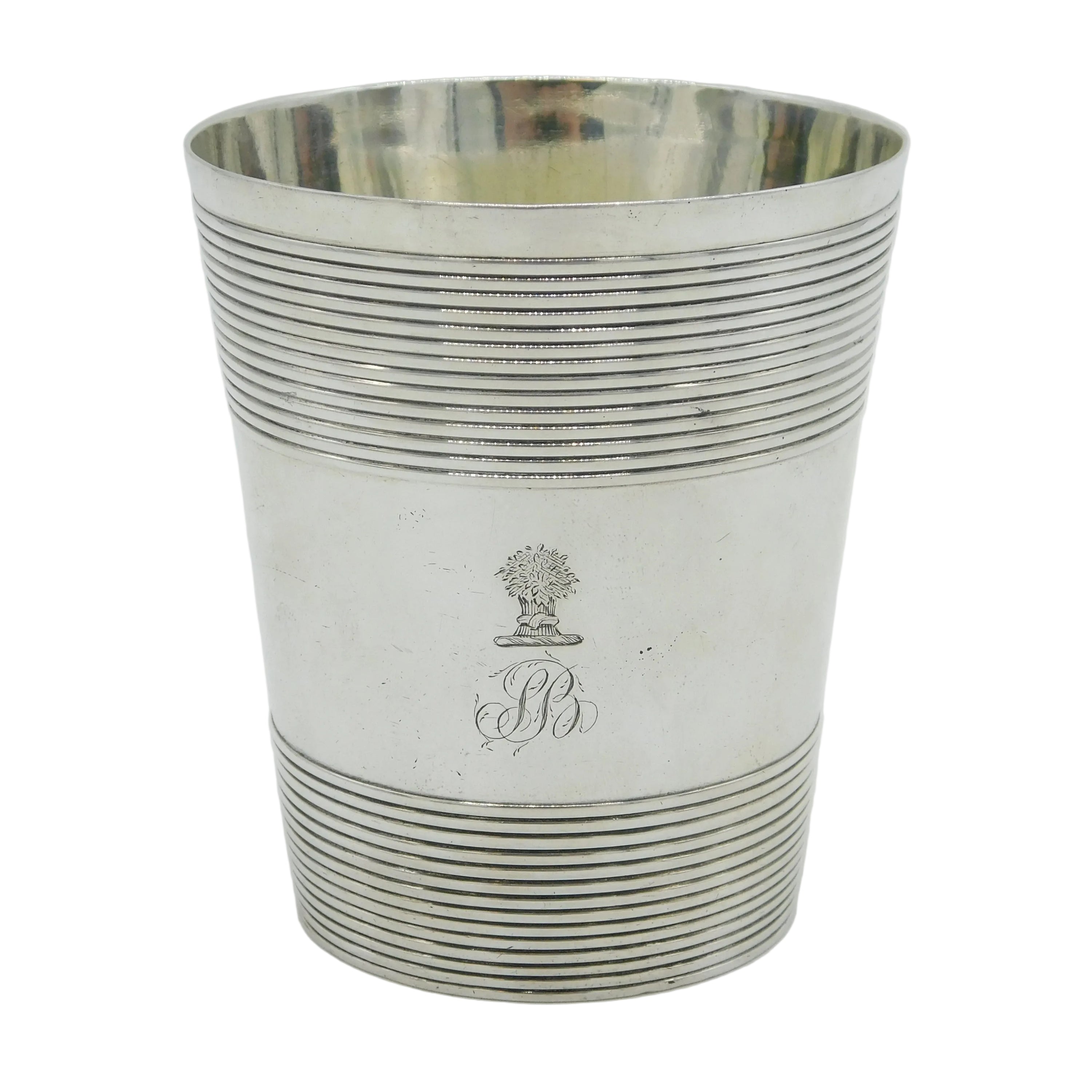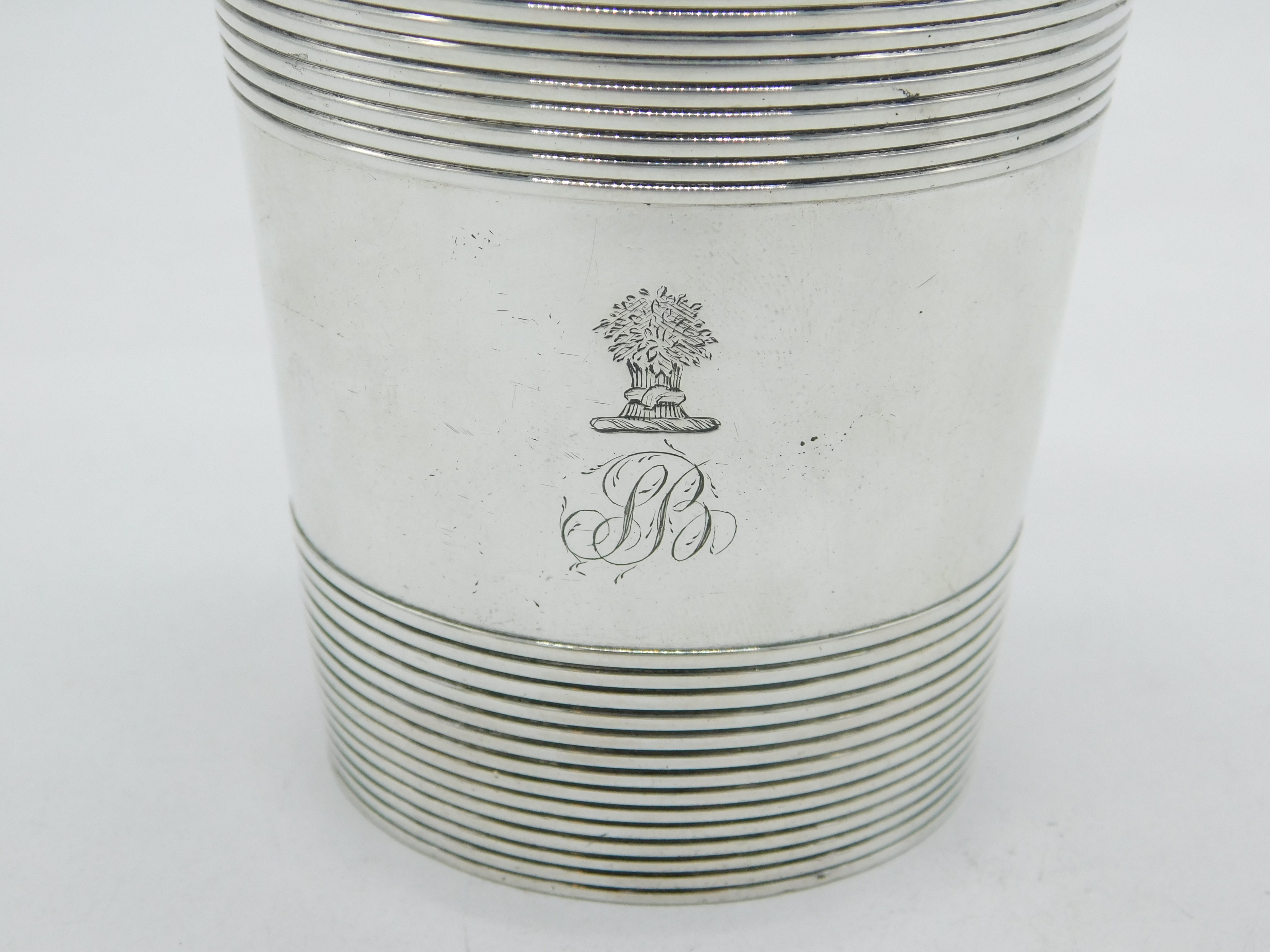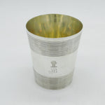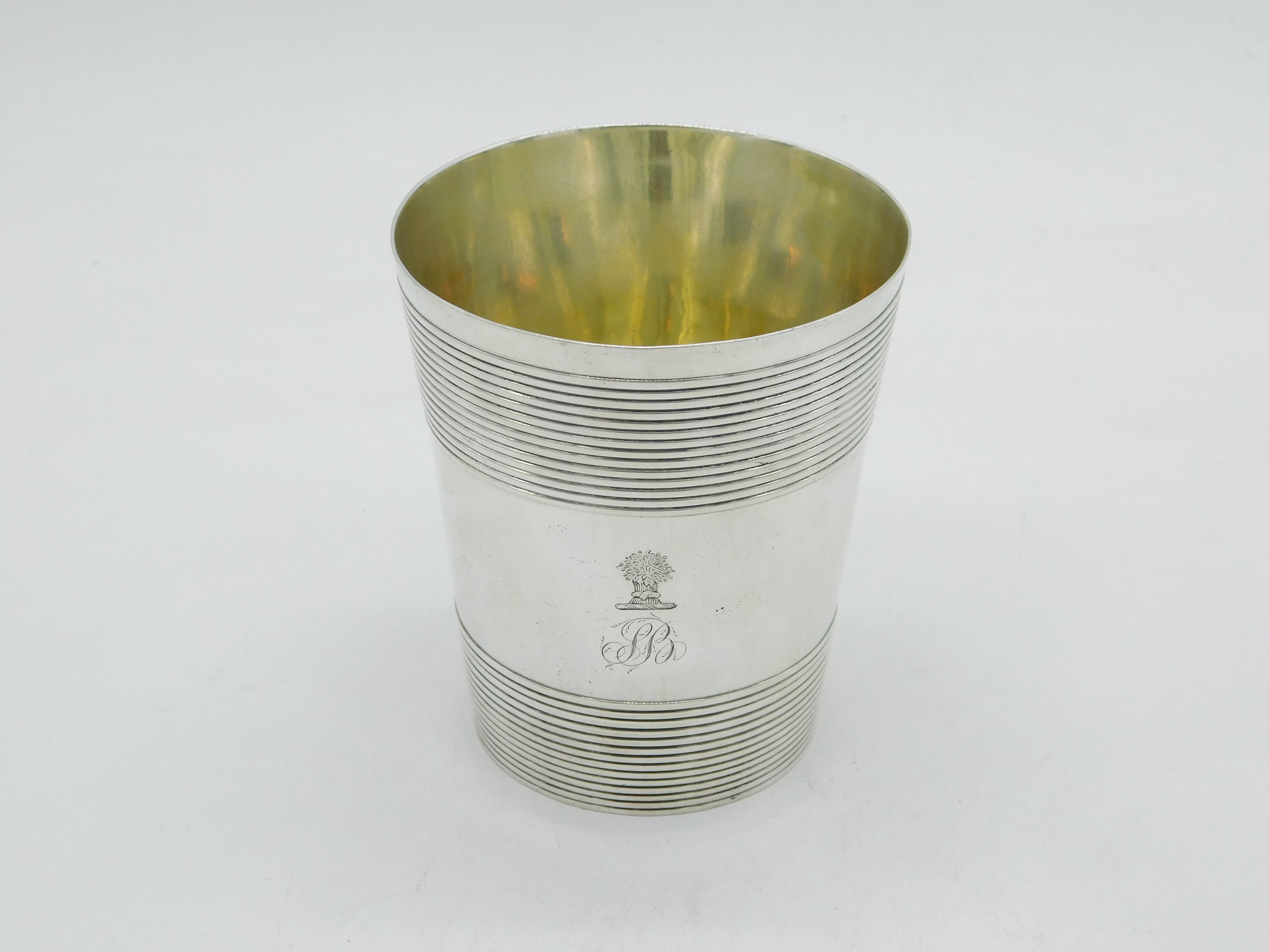 Details: A fantastic and wonderfully designed antique georgian sterling silver crested beaker cup with lovely lined decoration and high quality gilding to the interior, hallmarked for London 1790 by William Stephenson. This is a wonderful item that would make a perfect gift or addition to any collection. We are more than happy to provide XRF reports for items upon request.
