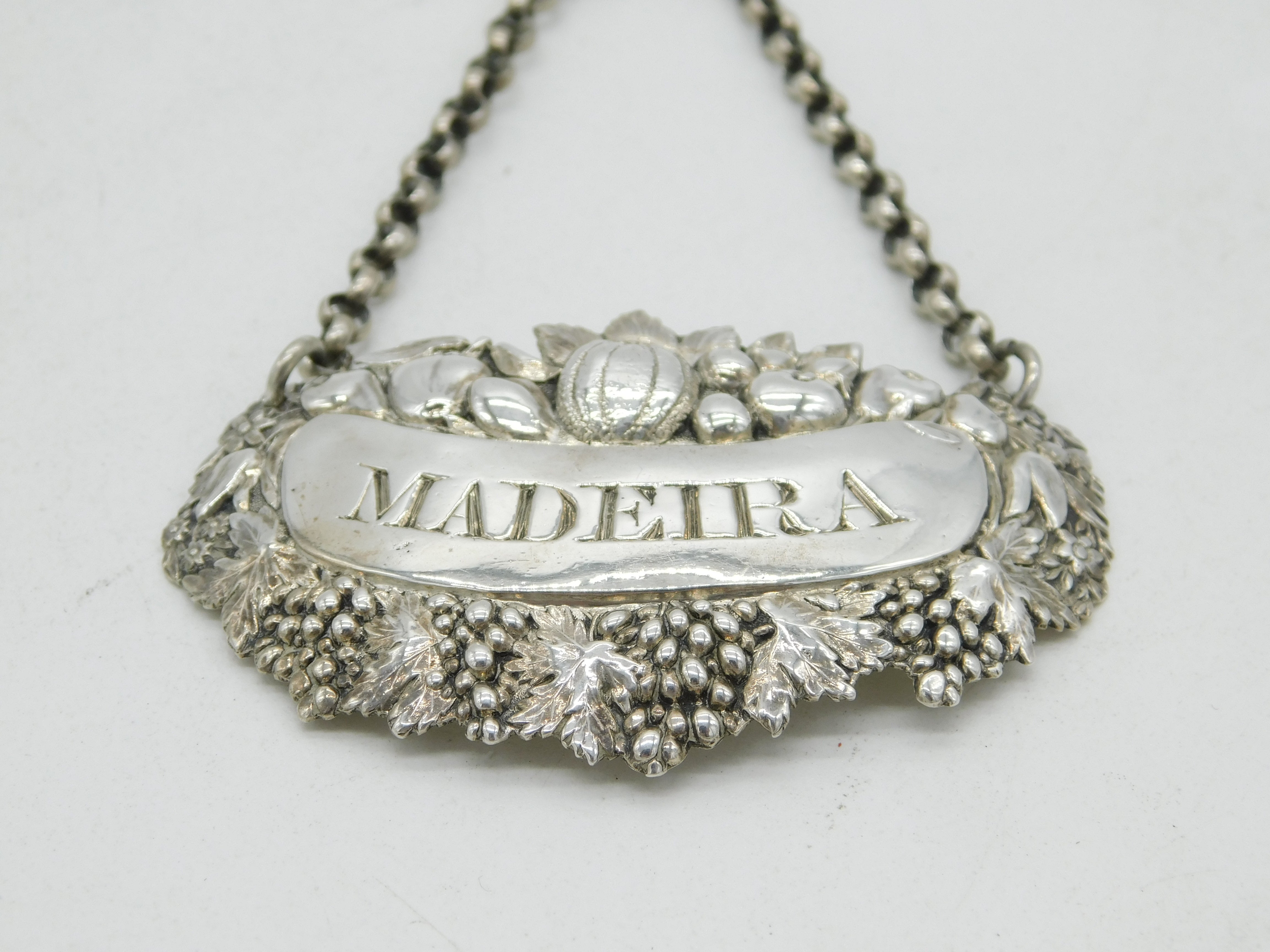Details: A fantastic and wonderfully designed antique georgian sterling silver floral pattern Madeira wine decanter label with lovely detailing hallmarked London 1820 by George Knight. This is a wonderful item that would make a perfect gift or addition to any collection. We are more than happy to provide XRF reports for items upon request.
