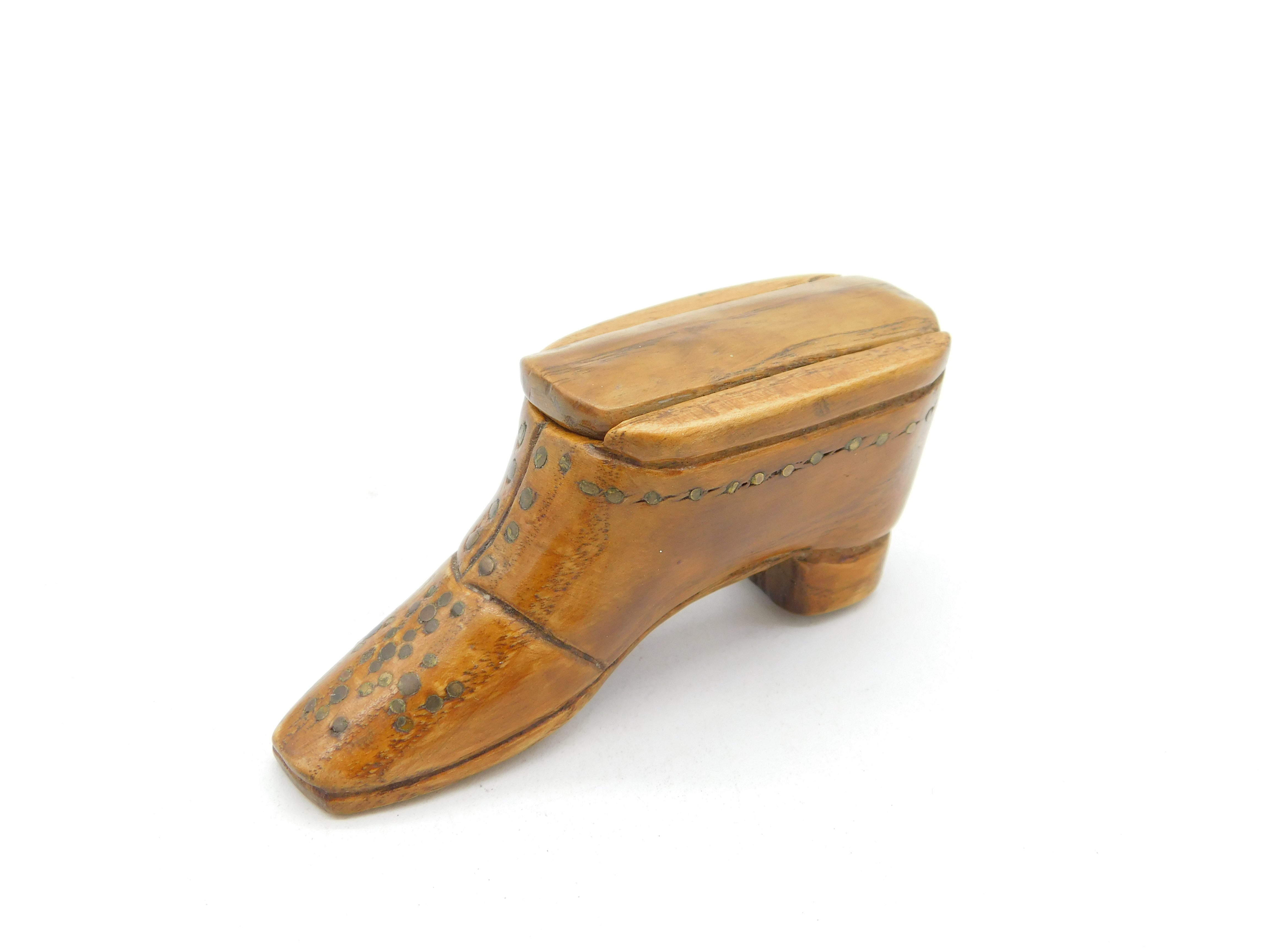 Details: A fantastic and wonderfully designed antique georgian carved wooden treen & brass pin novelty shoe form snuff box with sliding wooden lid c1800. This is a wonderful item that would make a perfect gift or addition to any collection. The BOX pictured is for PRESENTATION ONLY and is NOT included in the listings but used to frame the pictures unless specifically stated otherwise.