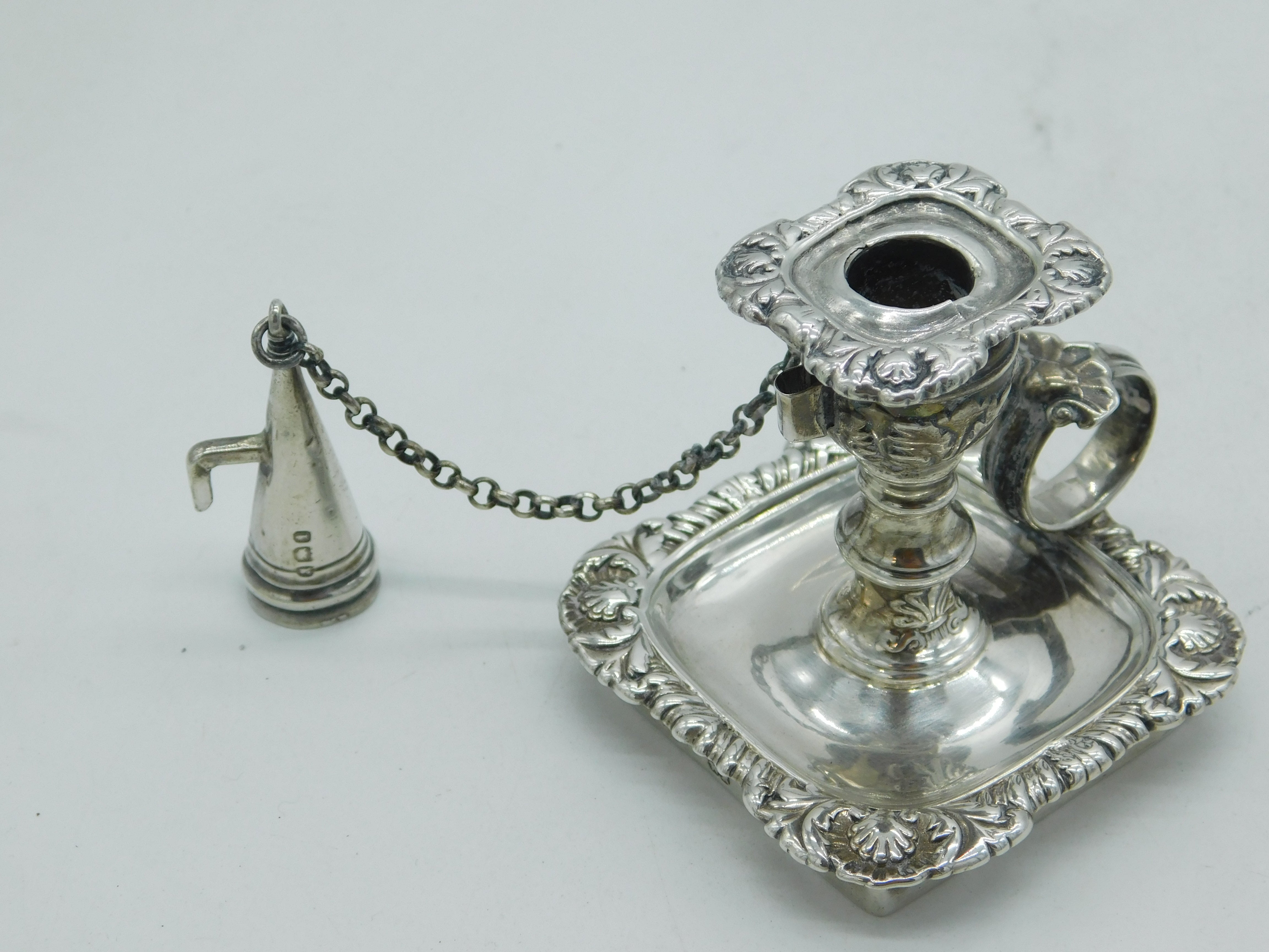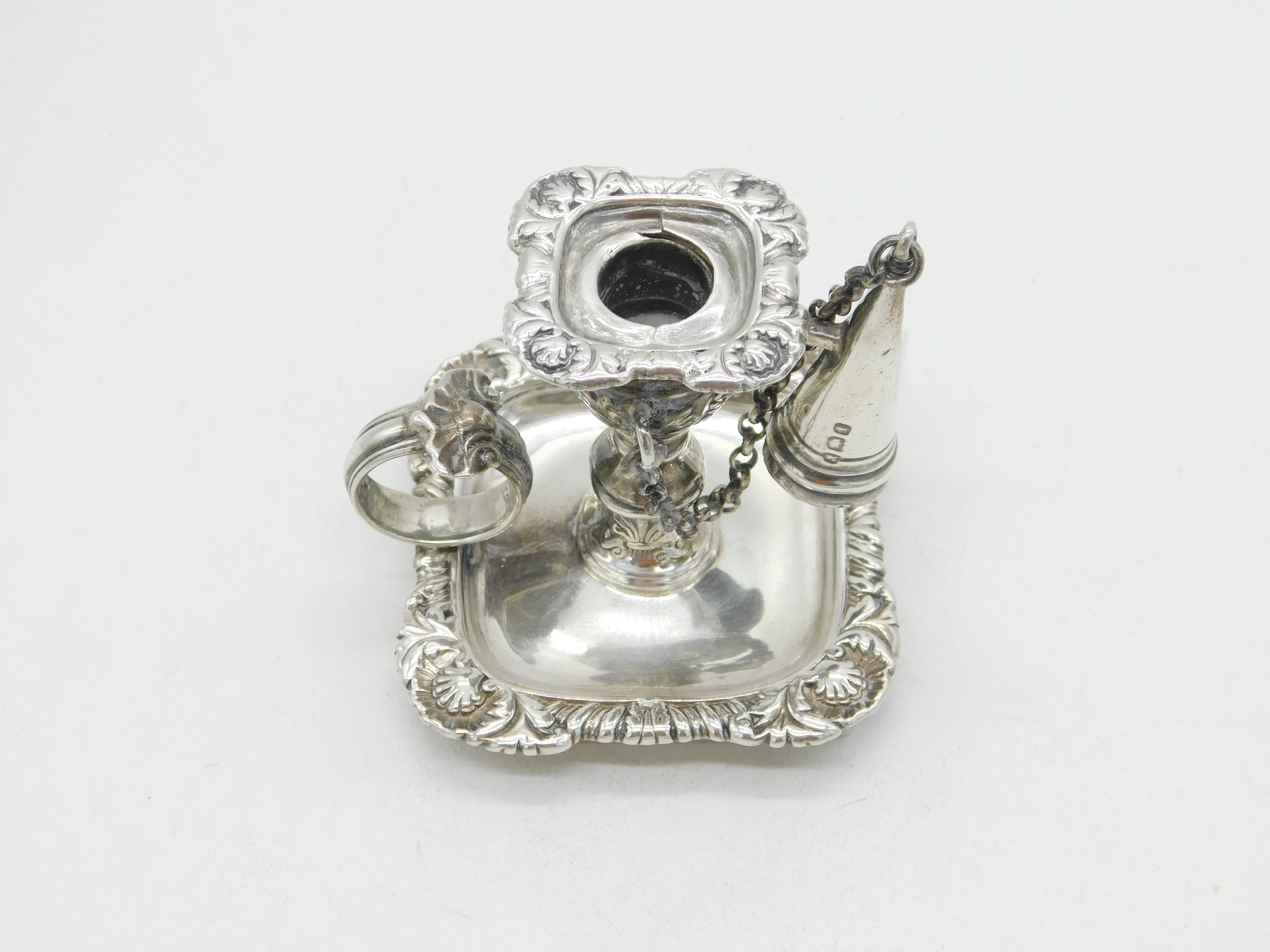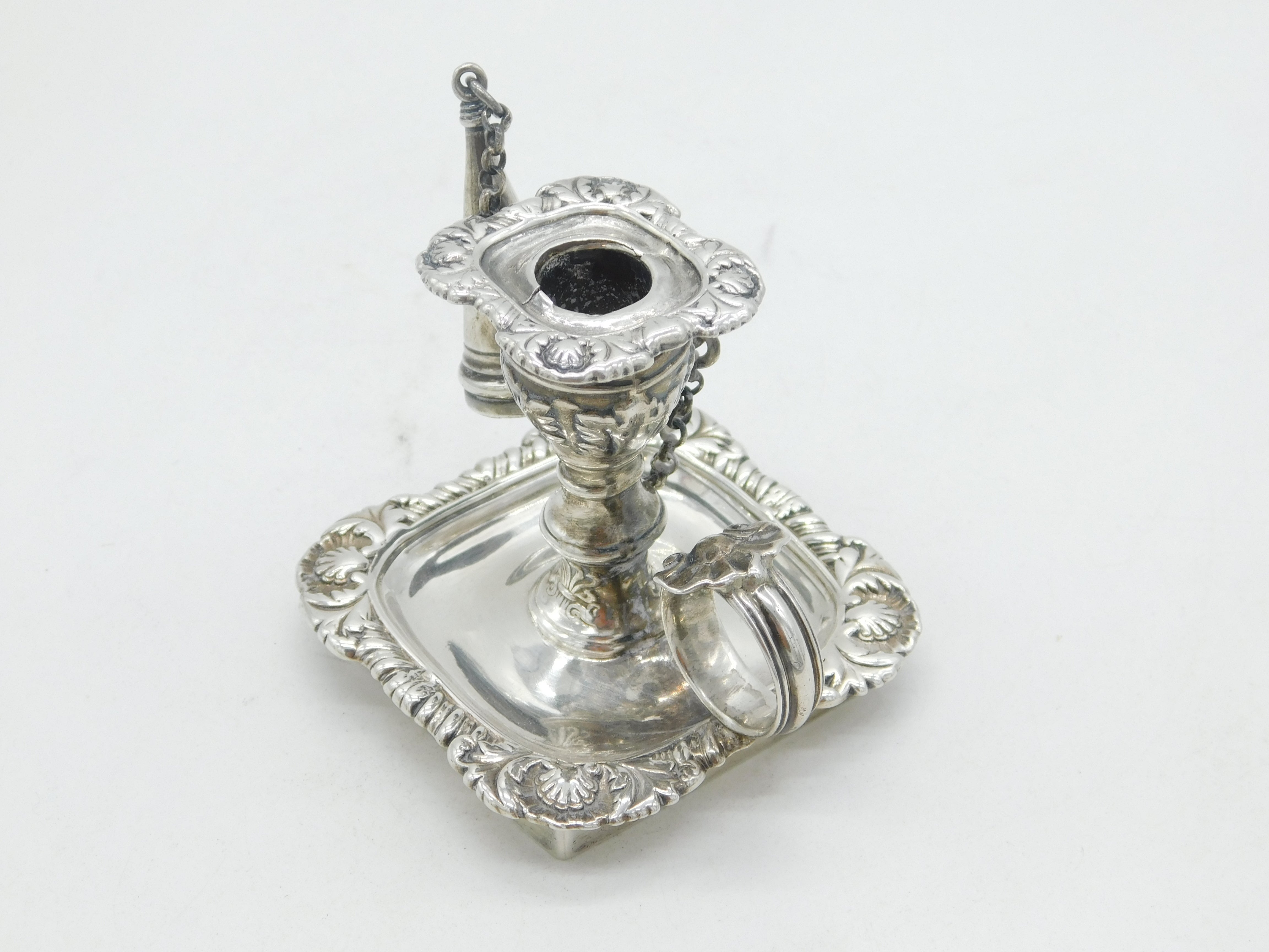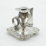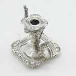 Details: A fantastic and wonderfully designed antique georgian sterling silver floral decorated miniature chamberstick, likely originally from a desk stand, with original snuffer and lovely detailing throughout hallmarked London 1824 by Joseph Craddock & William Ker Reid. Minor split to the silver on the top sconce. This is a wonderful item that would make a perfect gift or addition to any collection. We are more than happy to provide XRF reports for items upon request.