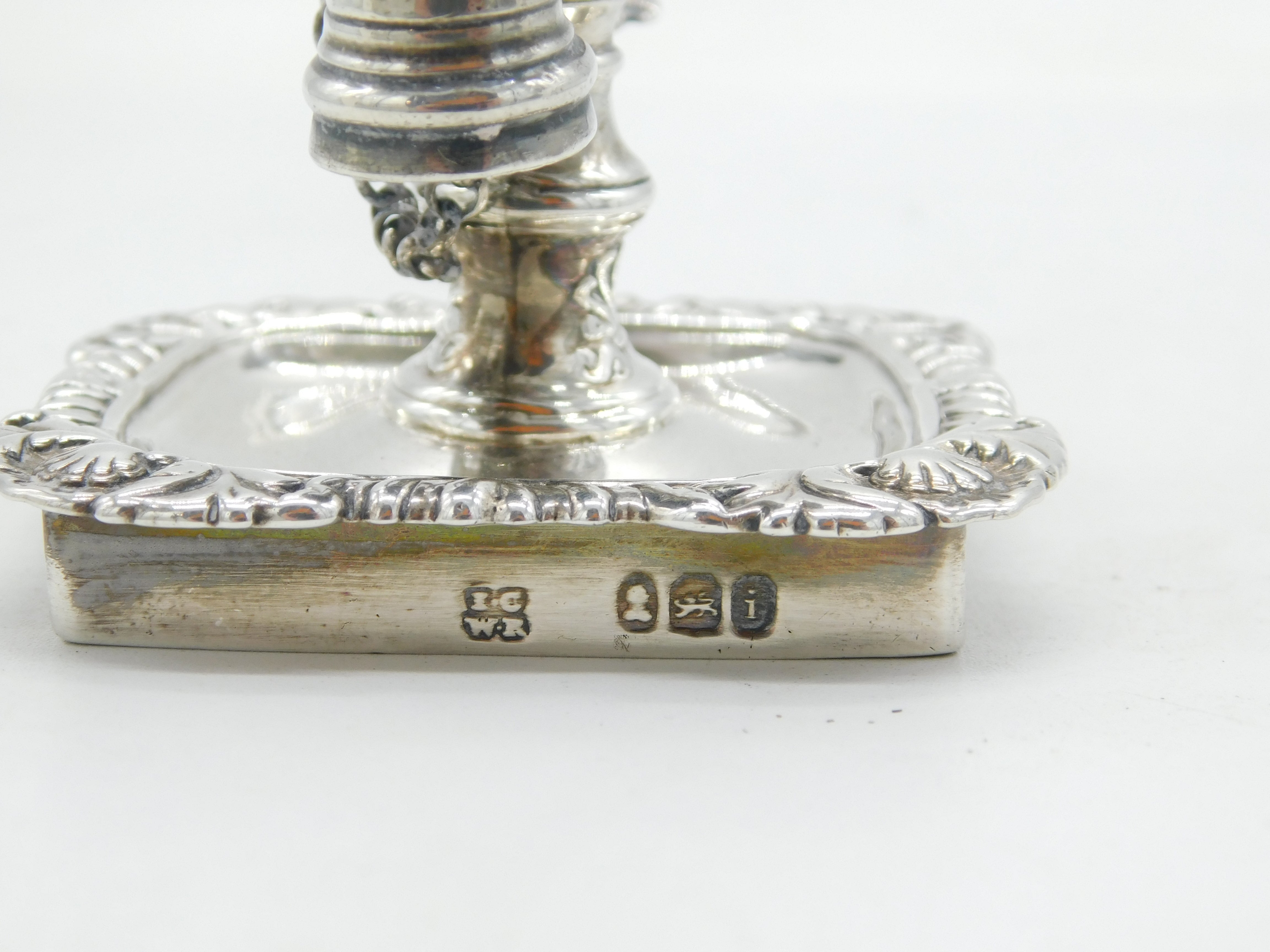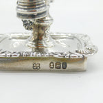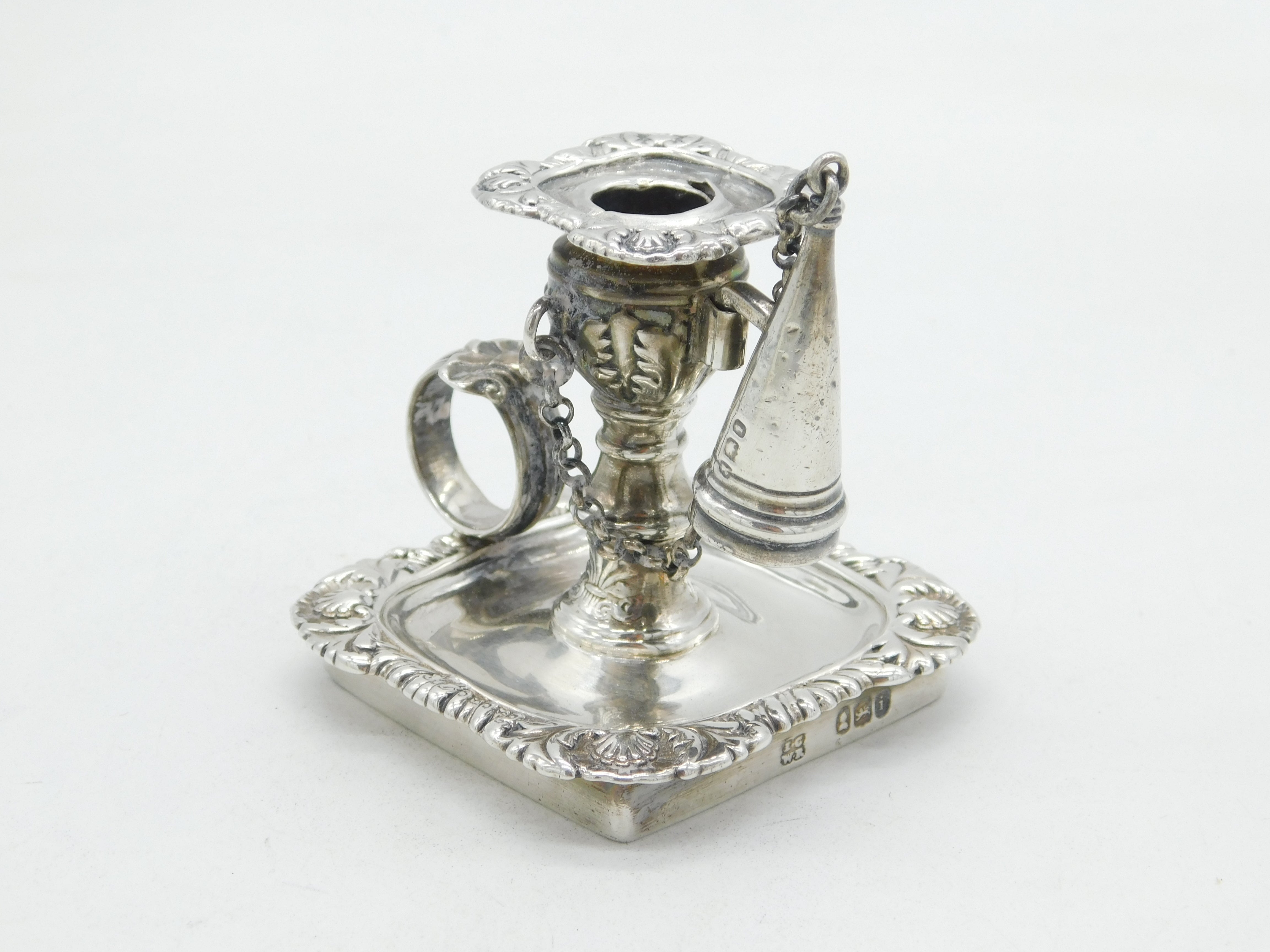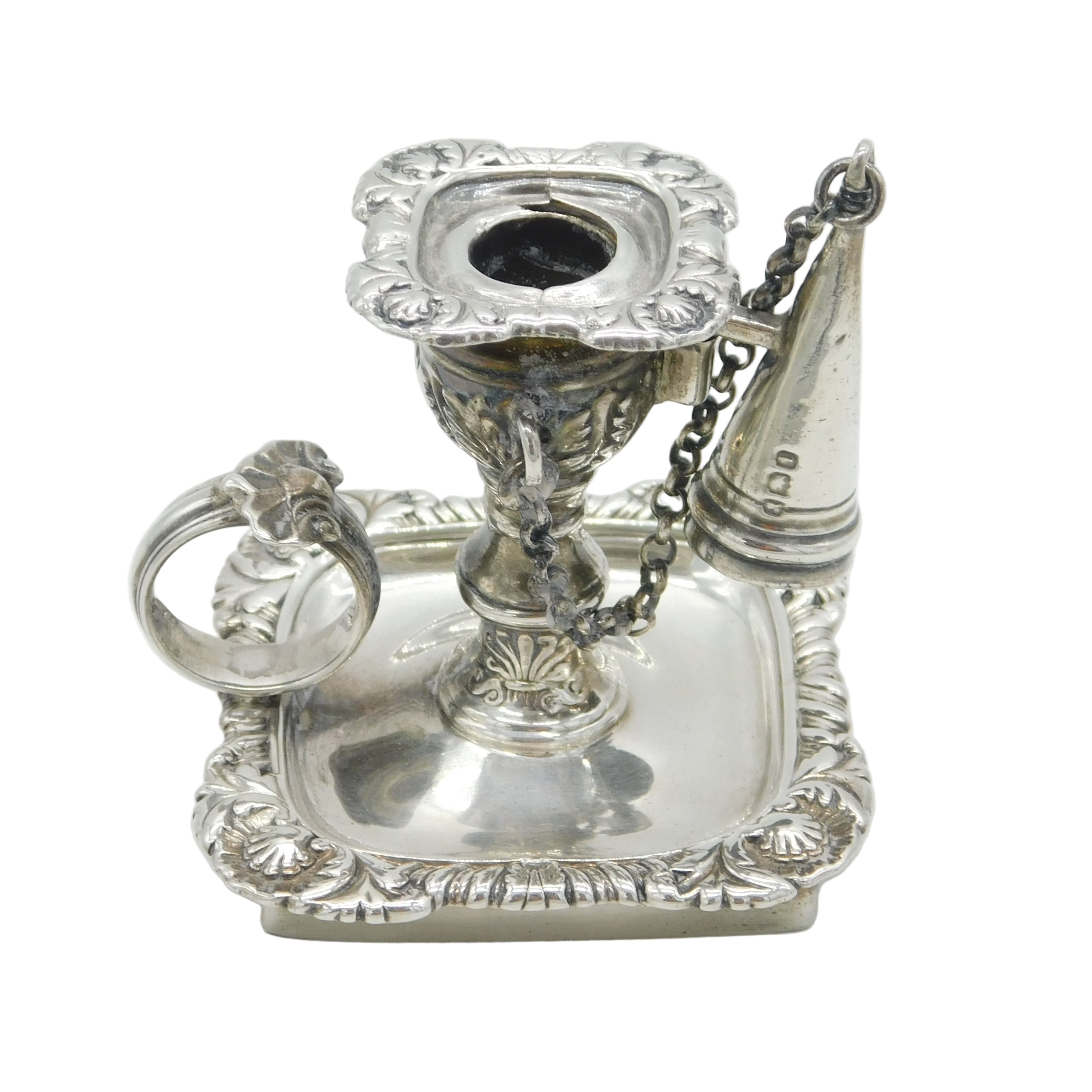 Details: A fantastic and wonderfully designed antique georgian sterling silver floral decorated miniature chamberstick, likely originally from a desk stand, with original snuffer and lovely detailing throughout hallmarked London 1824 by Joseph Craddock & William Ker Reid. Minor split to the silver on the top sconce. This is a wonderful item that would make a perfect gift or addition to any collection. We are more than happy to provide XRF reports for items upon request.
