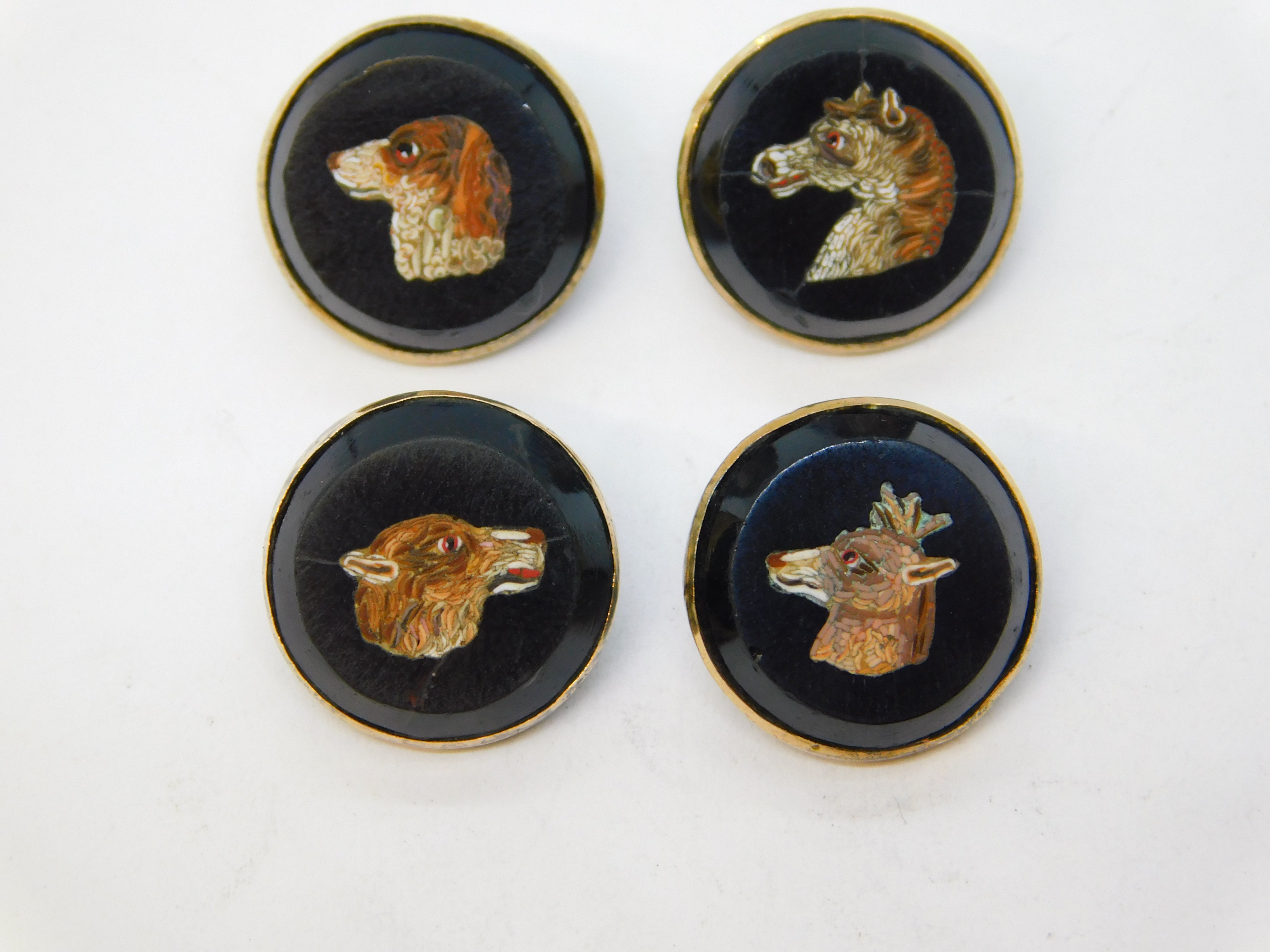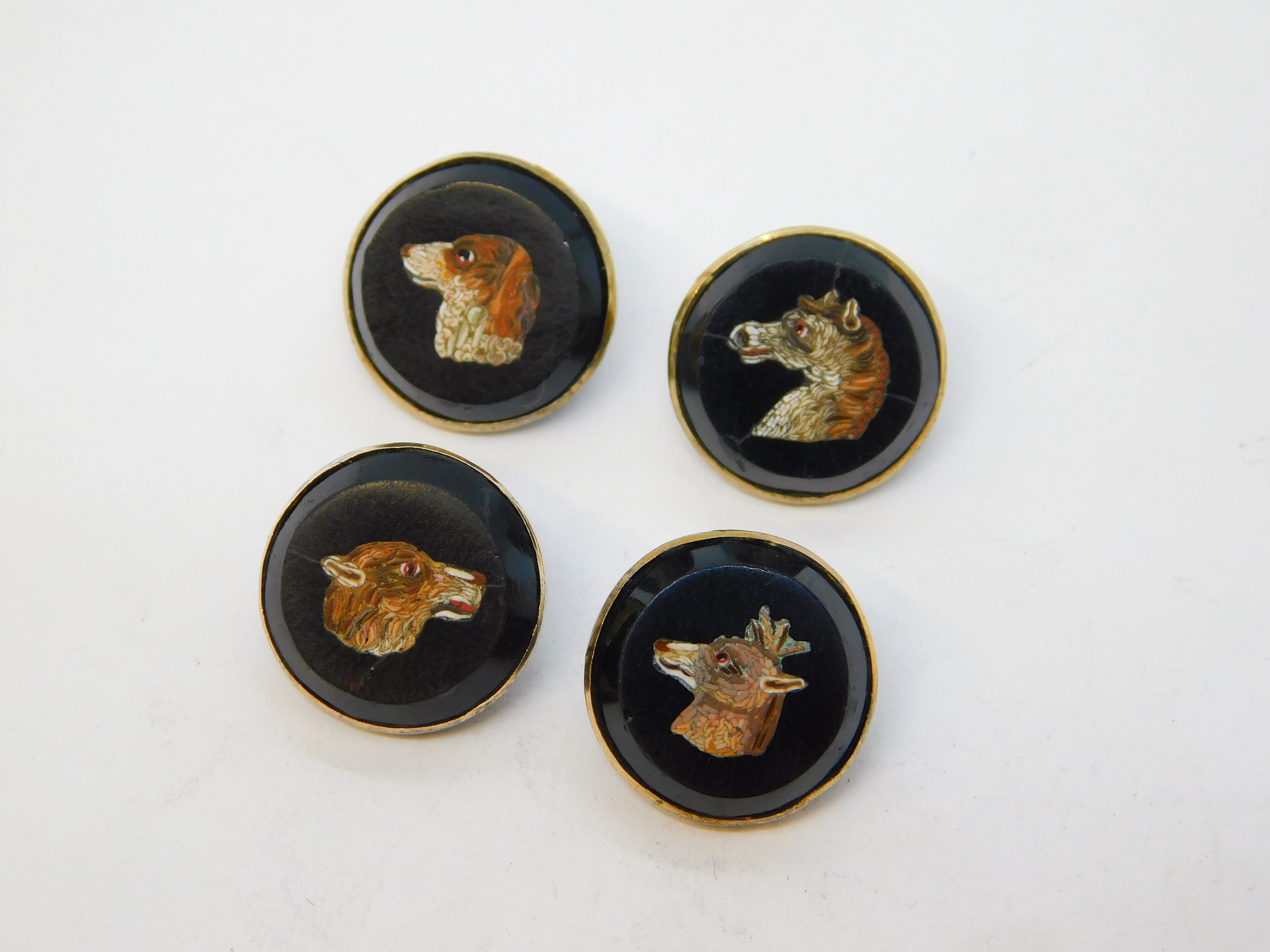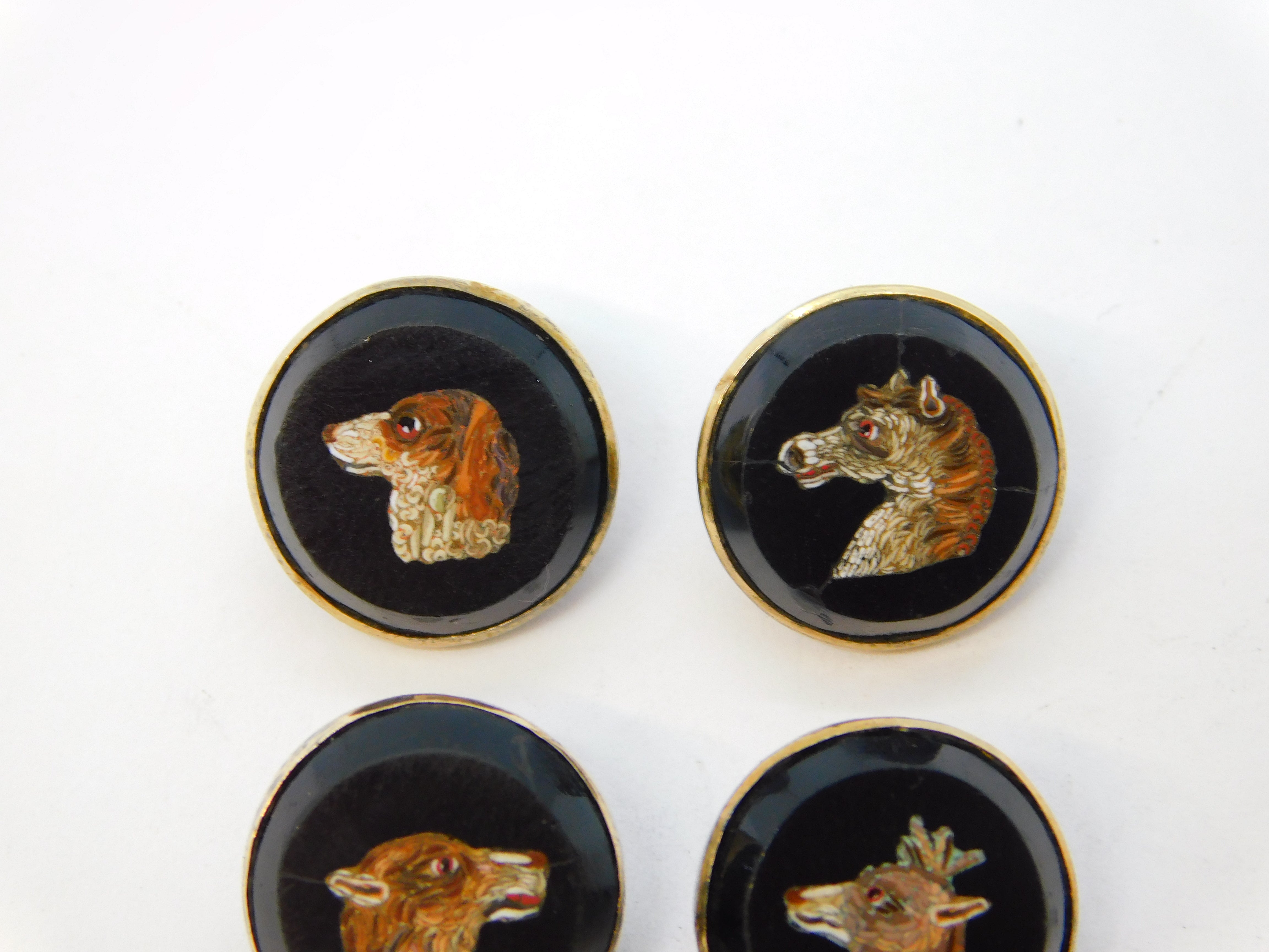 Details: A fantastic and wonderfully designed antique georgian regency period 9ct gold & sterling silver mounted set of four dress buttons each example set with superb micro mosaics each depicting a different animal to include a dog, horse, deer and wolf. The buttons are likely a grand tour souvenir and are beautifully crafted - two of the micro mosaics feature hairline cracks (the horse & wolf), the other two micro mosaics are in good condition. The gold and silver has been XRF tested. These buttons would look amazing each crafted into individual rings. This is a wonderful item that would make a perfect gift or addition to any collection. We are more than happy to provide XRF reports for items upon request.