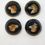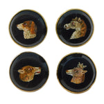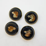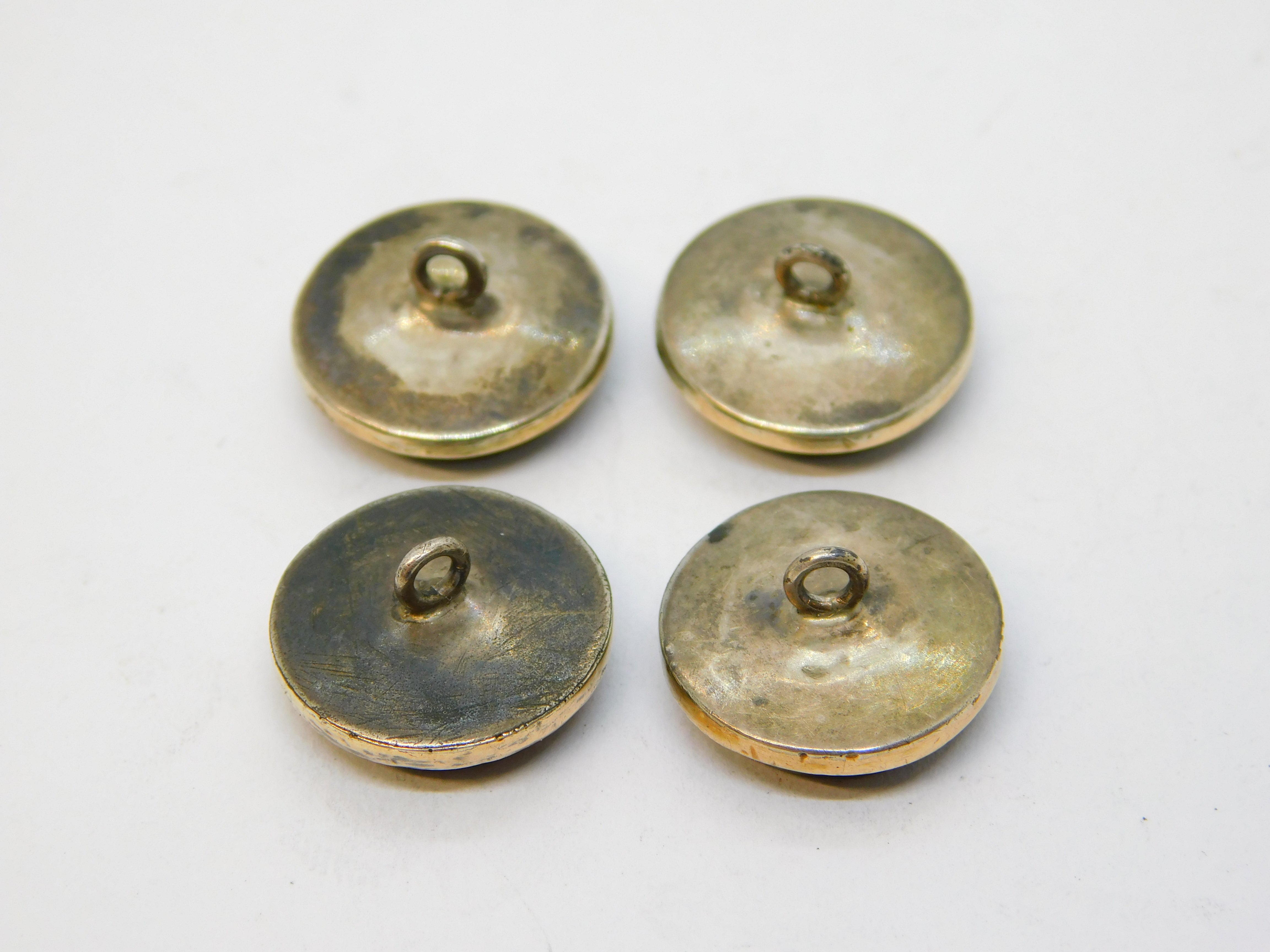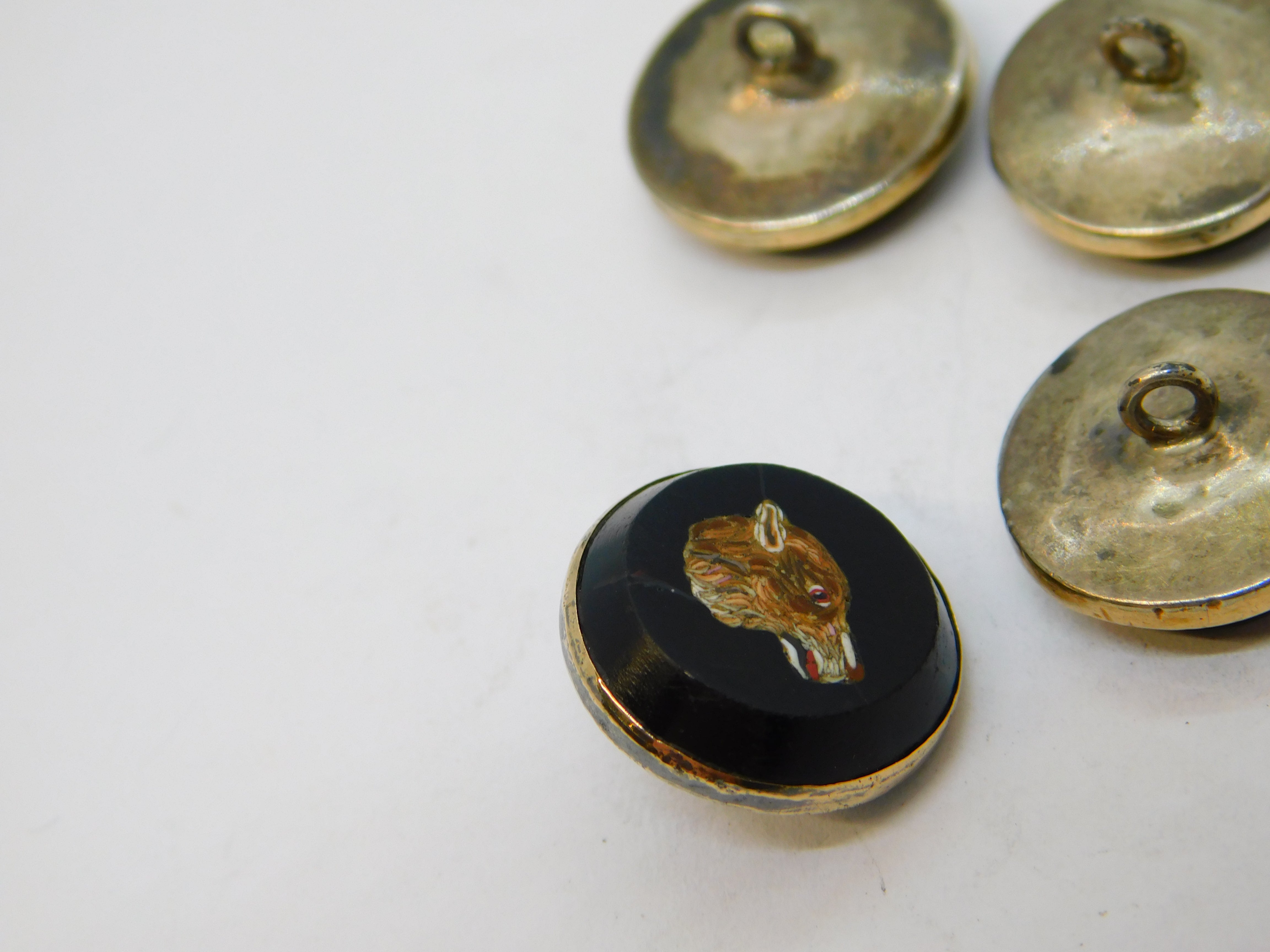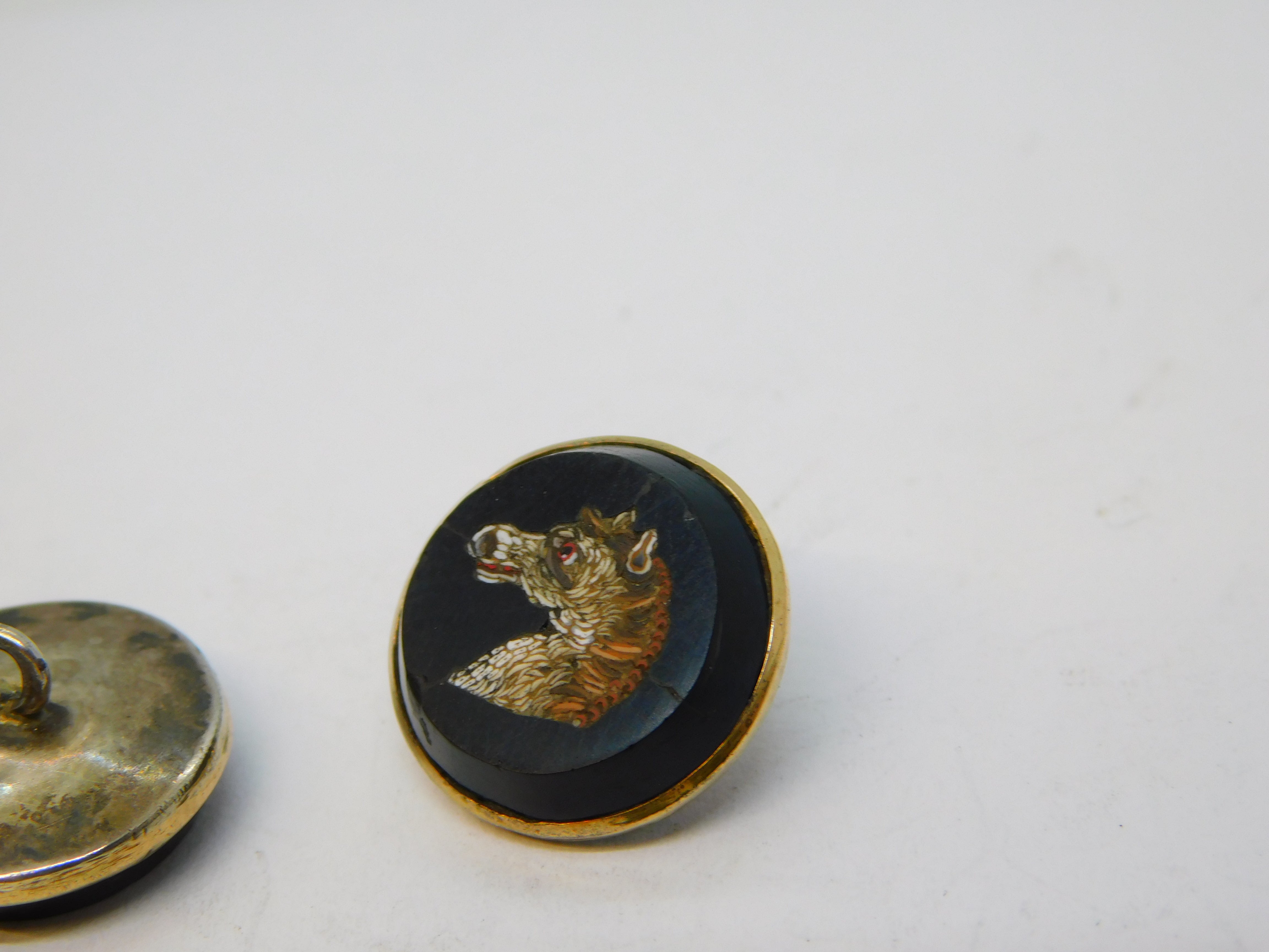Details: A fantastic and wonderfully designed antique georgian regency period 9ct gold & sterling silver mounted set of four dress buttons each example set with superb micro mosaics each depicting a different animal to include a dog, horse, deer and wolf. The buttons are likely a grand tour souvenir and are beautifully crafted - two of the micro mosaics feature hairline cracks (the horse & wolf), the other two micro mosaics are in good condition. The gold and silver has been XRF tested. These buttons would look amazing each crafted into individual rings. This is a wonderful item that would make a perfect gift or addition to any collection. We are more than happy to provide XRF reports for items upon request.