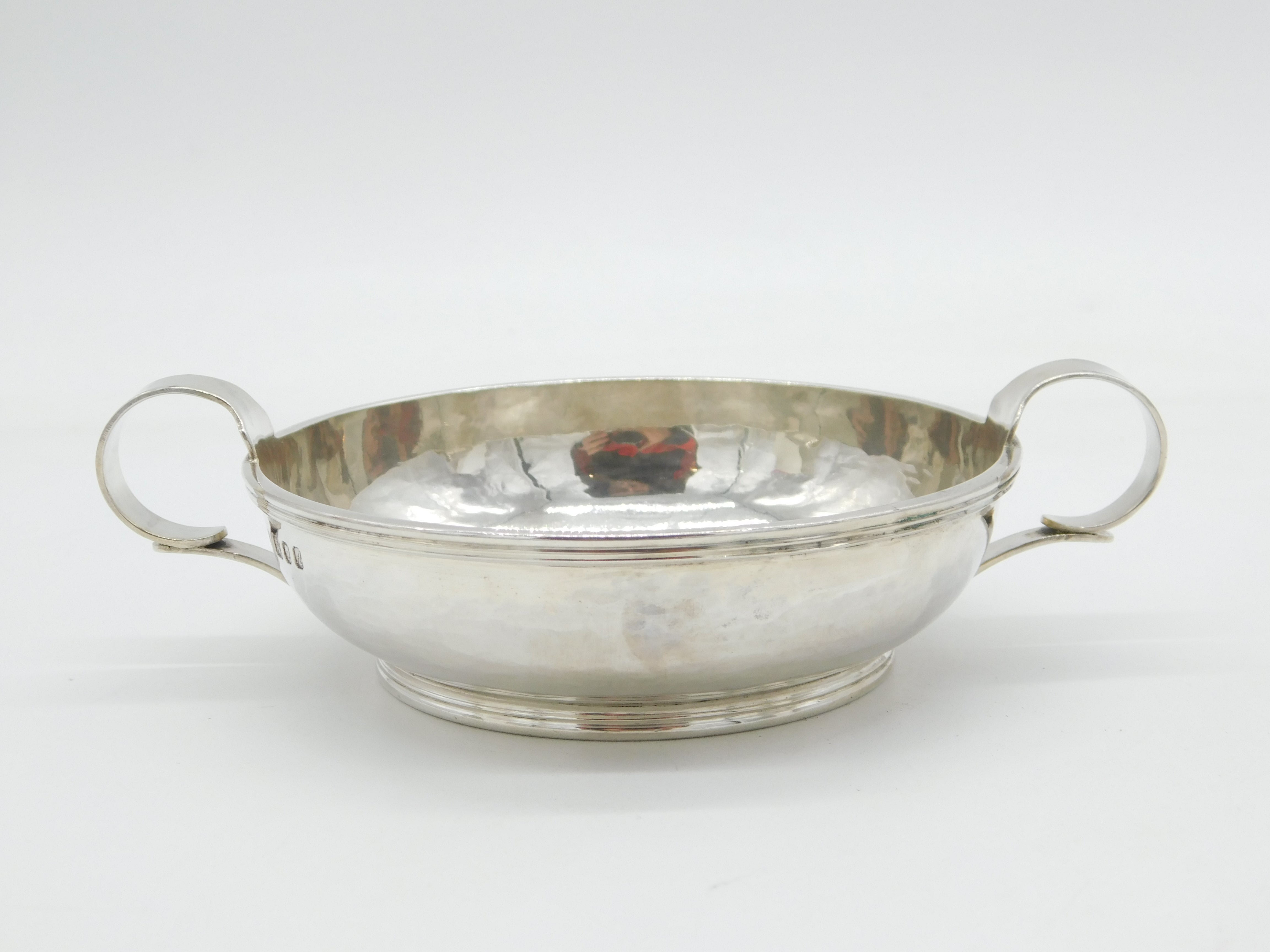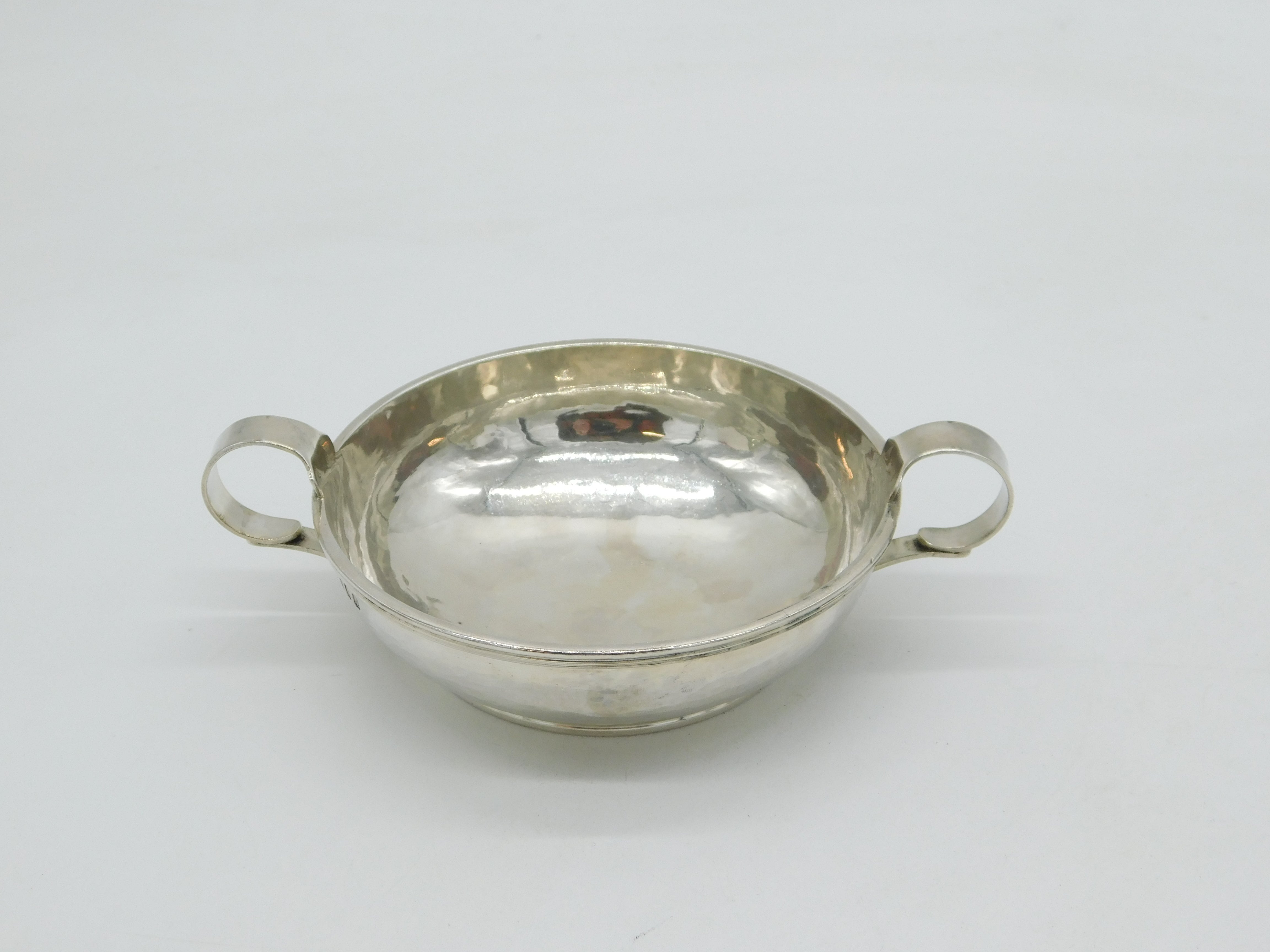 Details: A fantastic and wonderfully designed vintage arts & crafts style planished sterling silver two-handled quaich cup by important makers Guild of Handicraft, London 1975. This is a wonderful item that would make a perfect gift or addition to any collection. We are more than happy to provide XRF reports for items upon request.
