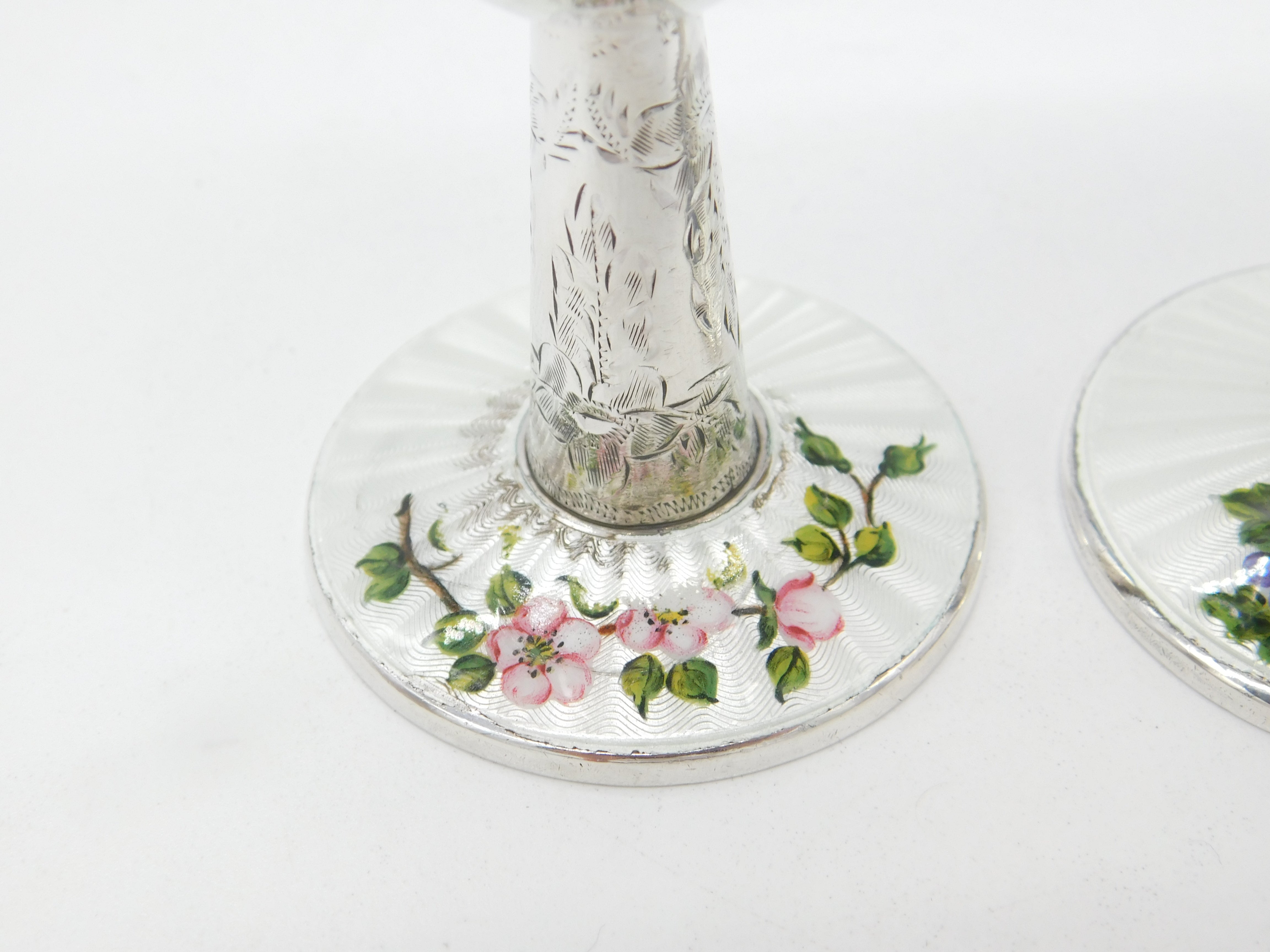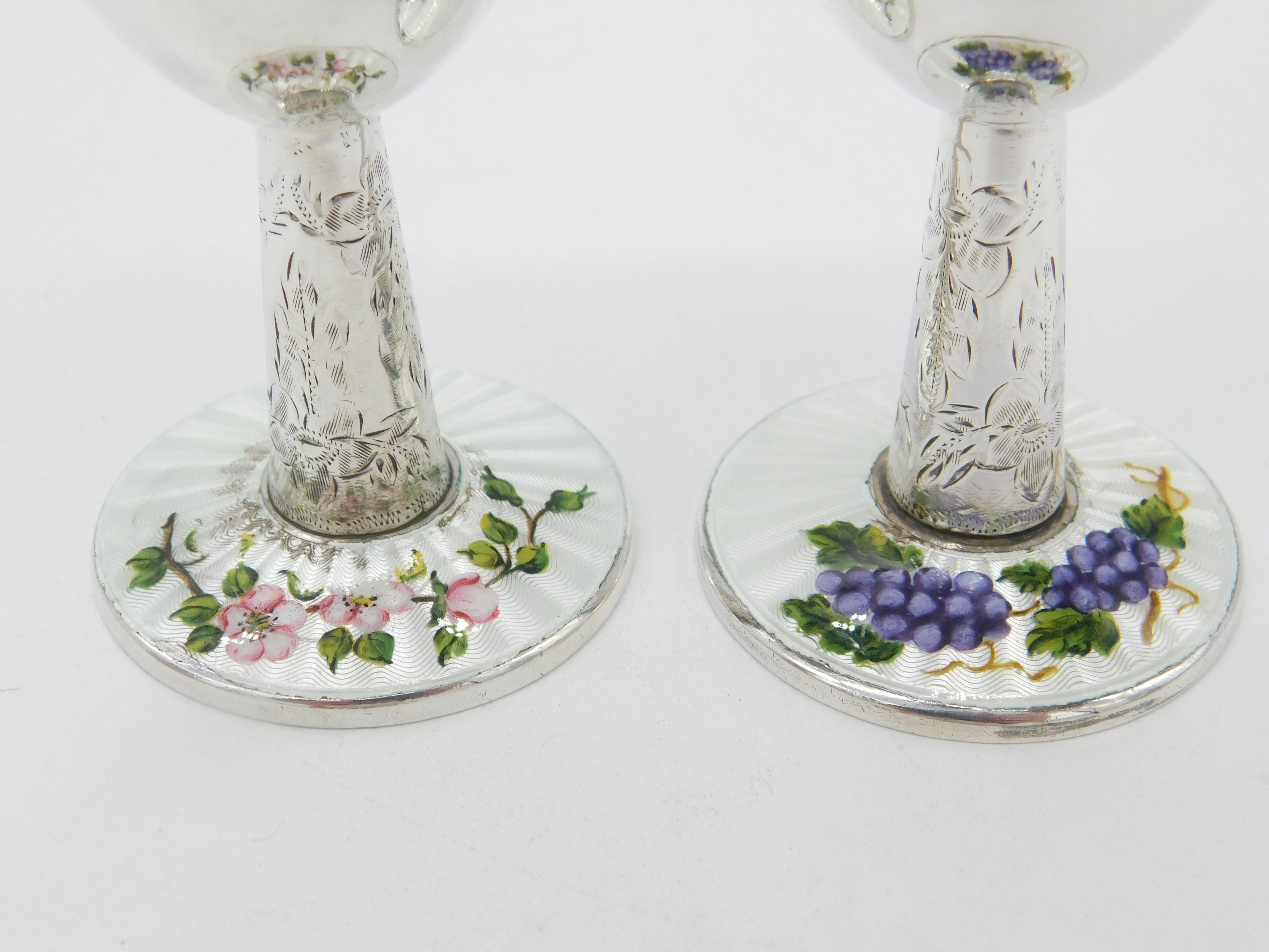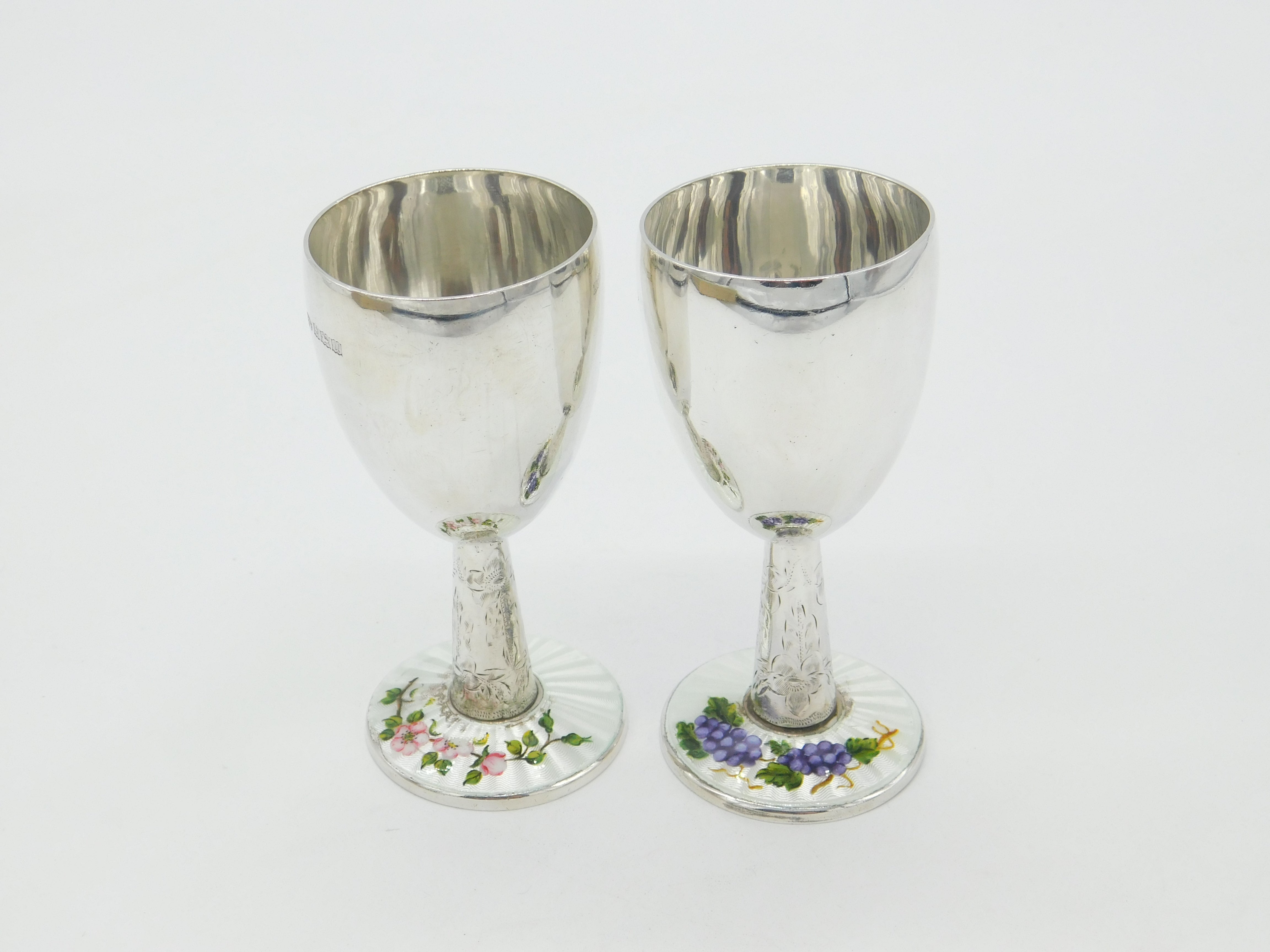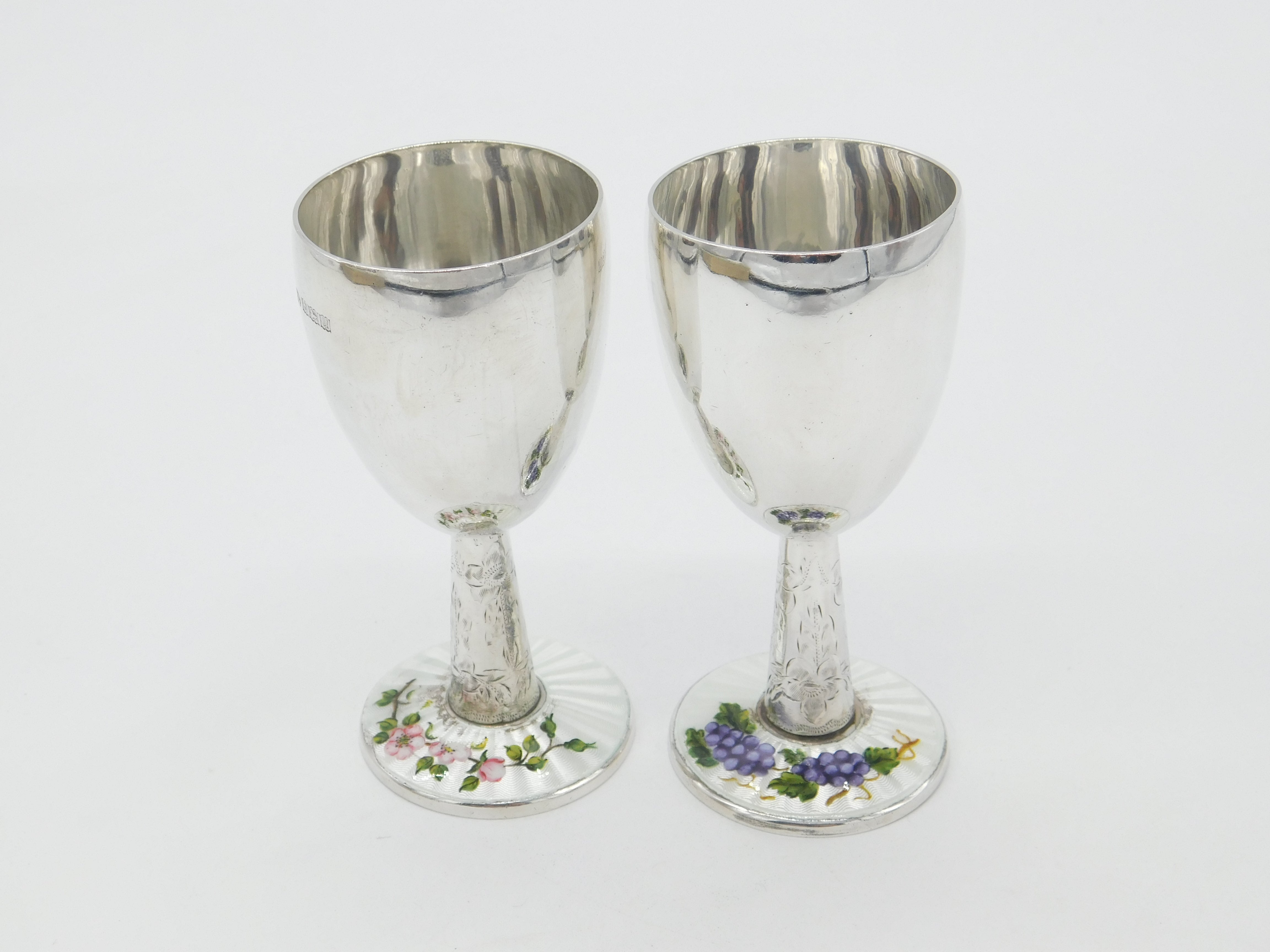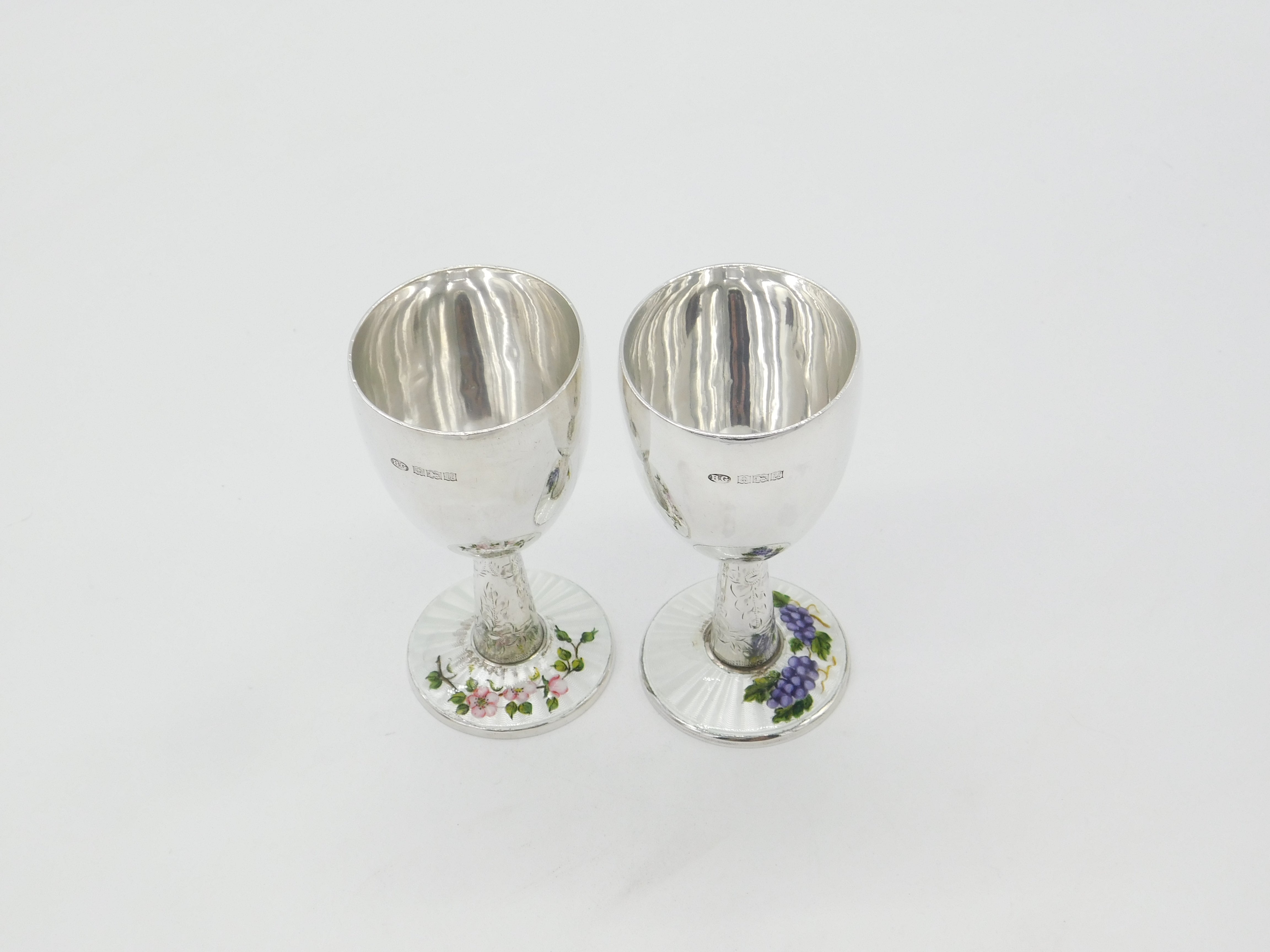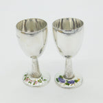 Pair Sterling Silver Floral Guilloche Enamel Base Wine Goblets 1969 Birmingham