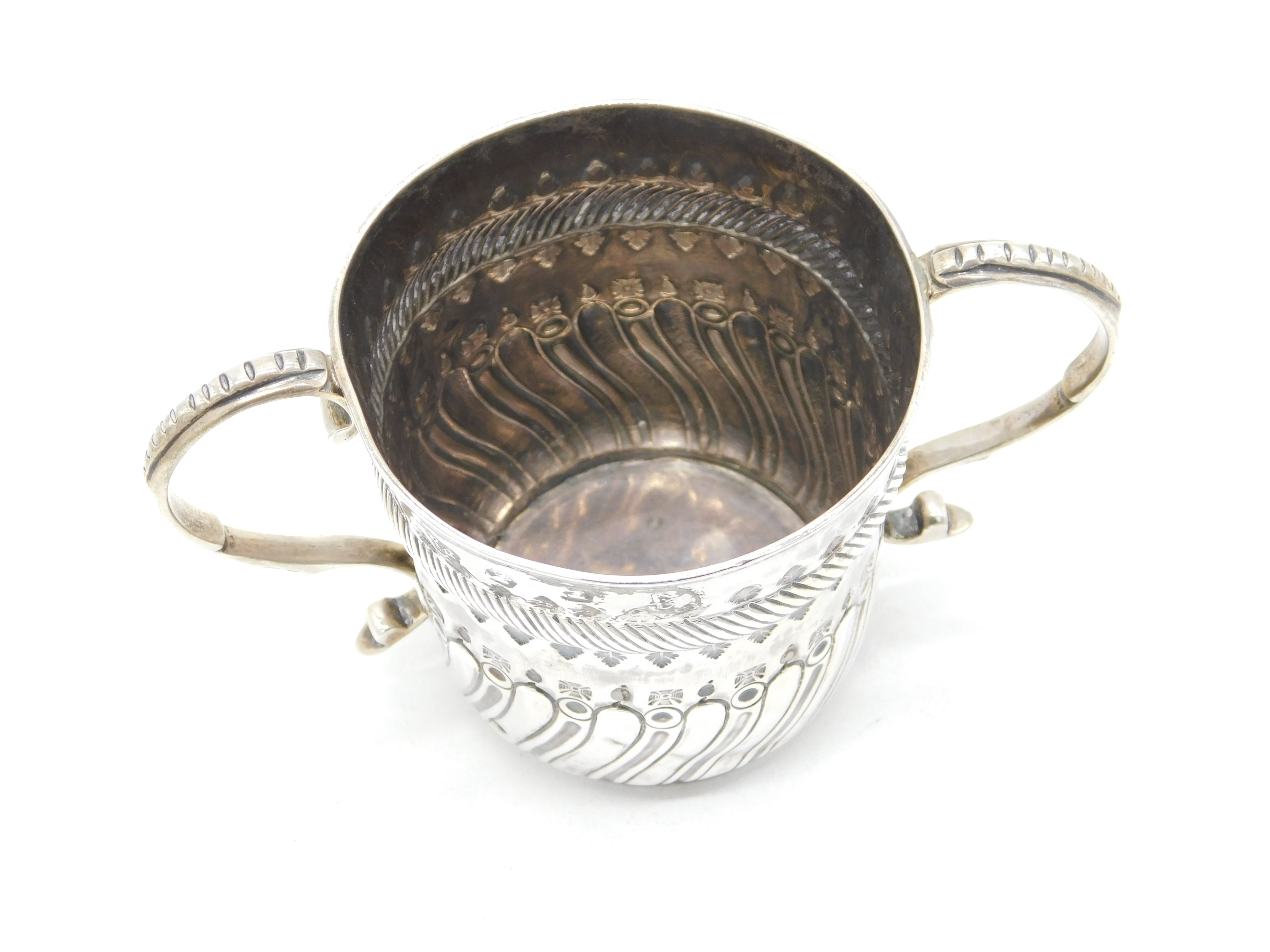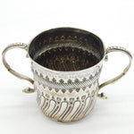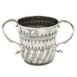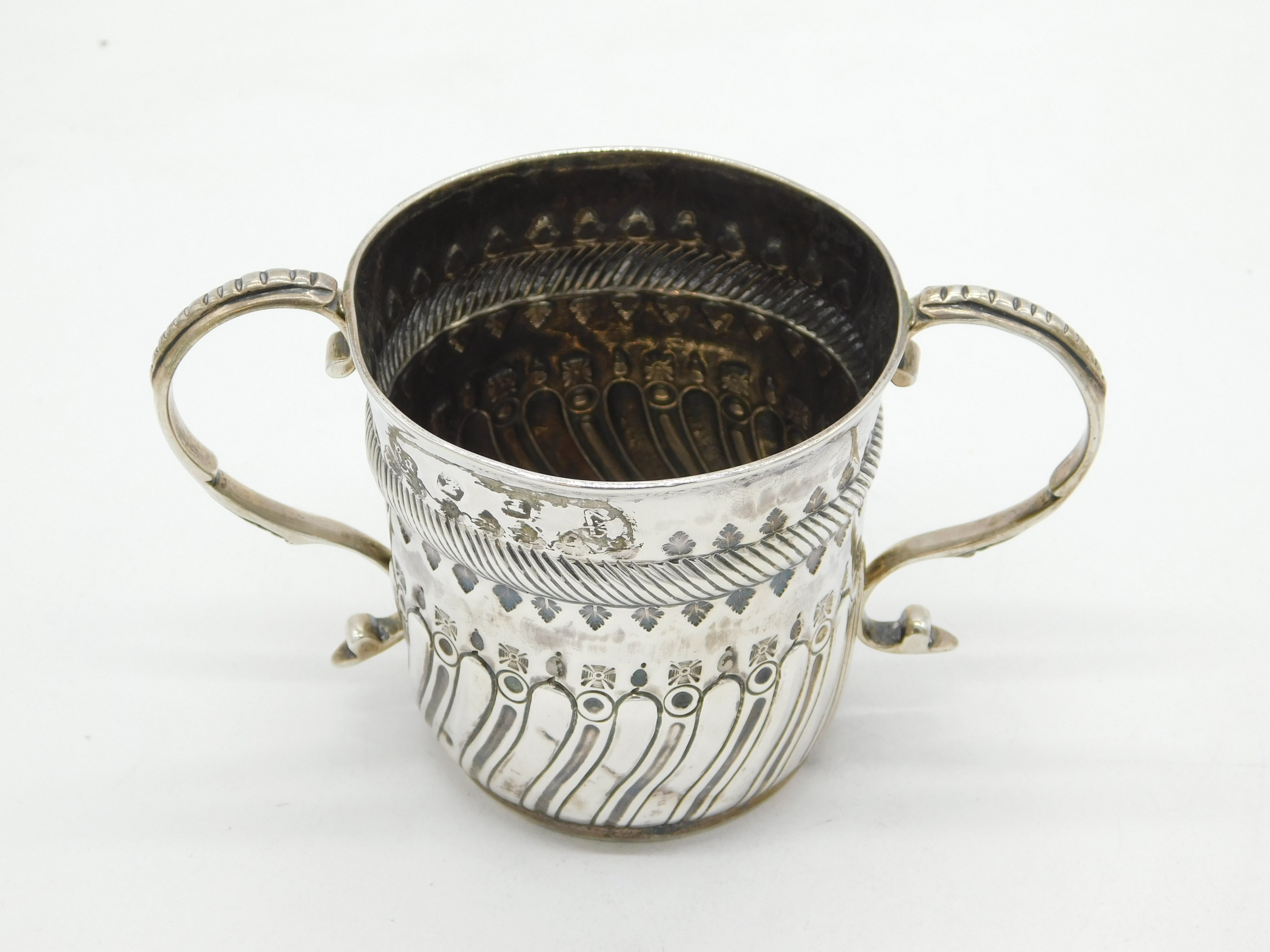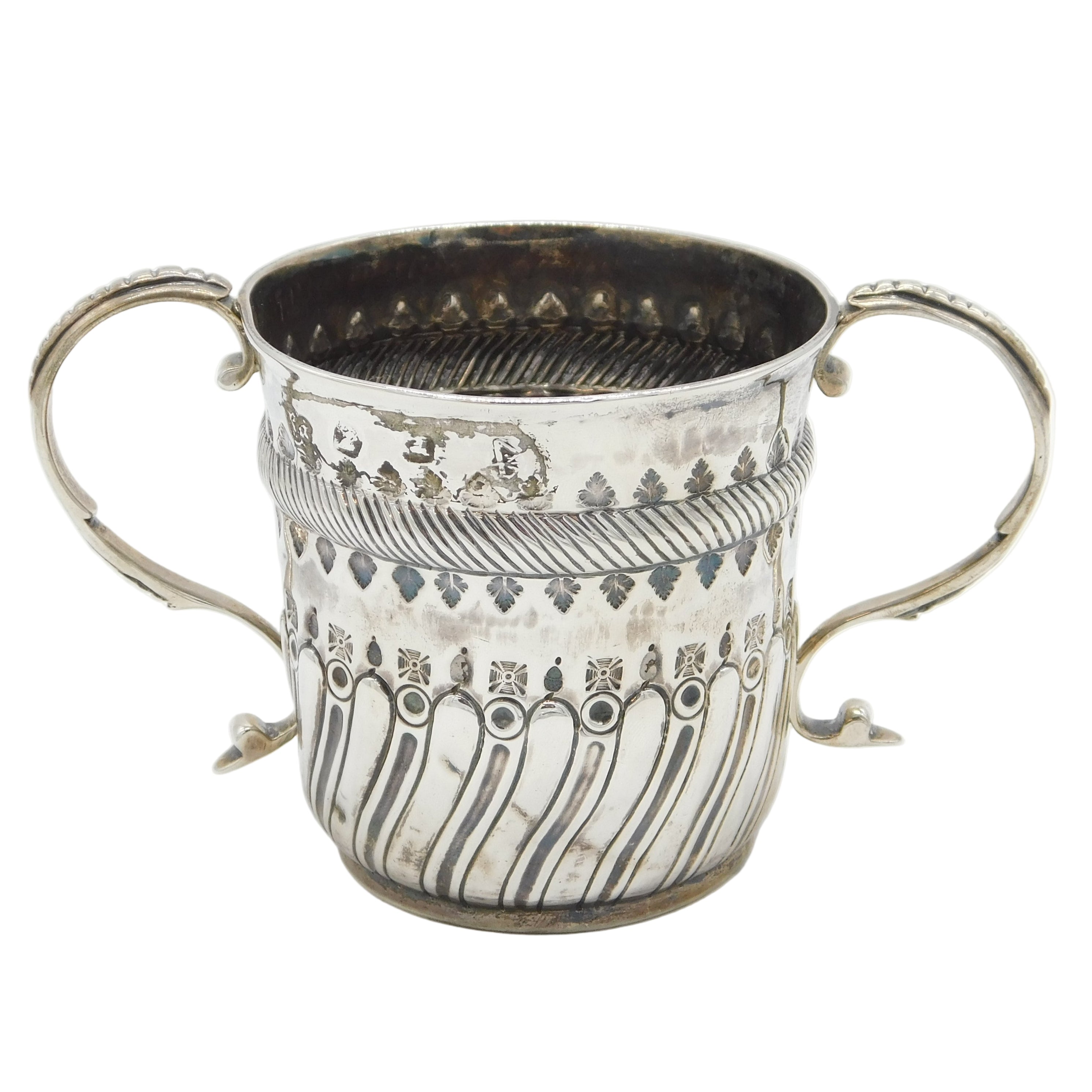 Details: A fantastic and wonderfully designed antique early britannia grade silver two-handled porringer cup with ropework design and floral patterns nicely hallmarked to the top edge London 1705 by John Rand. Lovely condition with no obvious repairs or damage. This is a wonderful item that would make a perfect gift or addition to any collection. We are more than happy to provide XRF reports for items upon request.