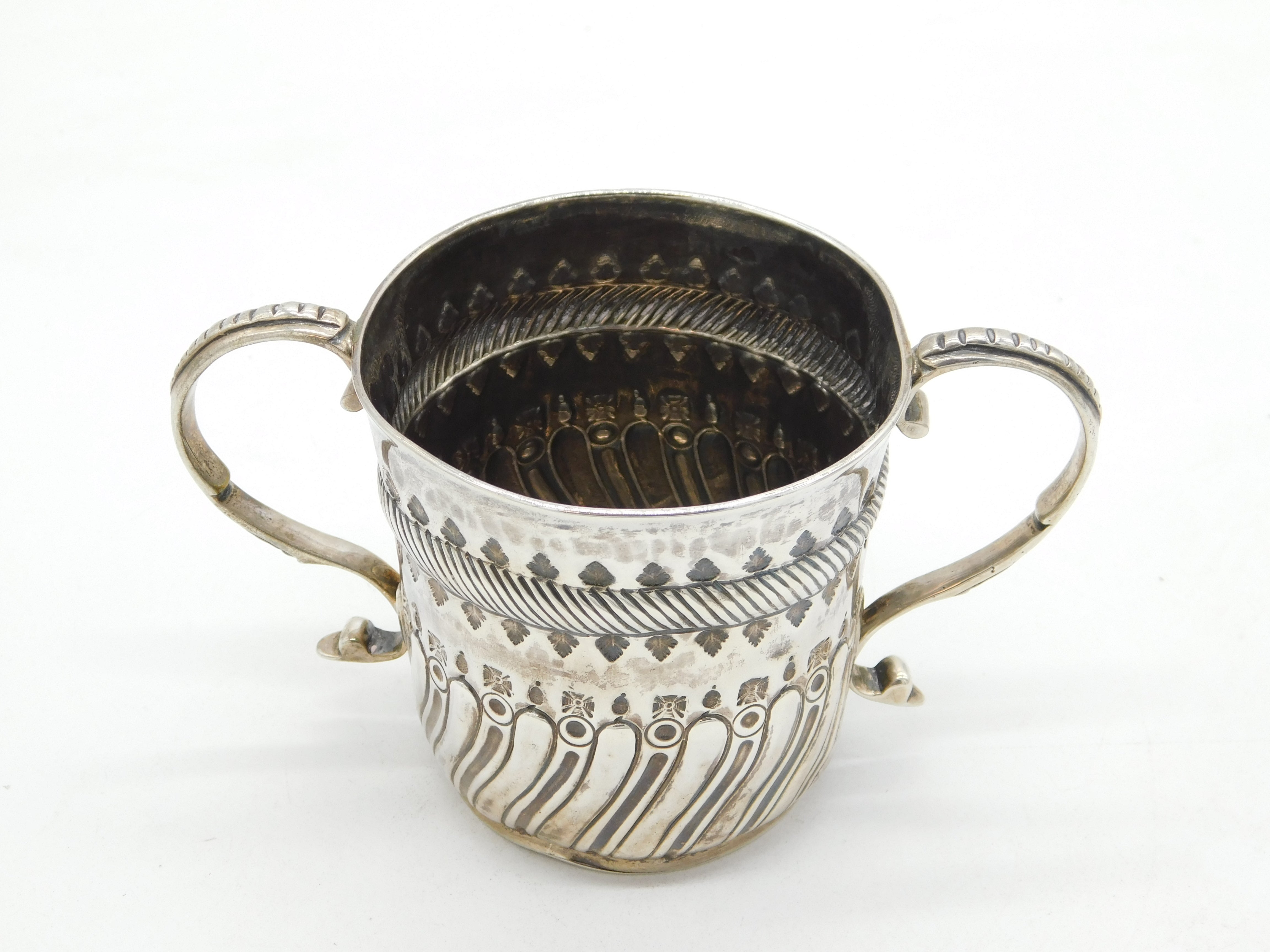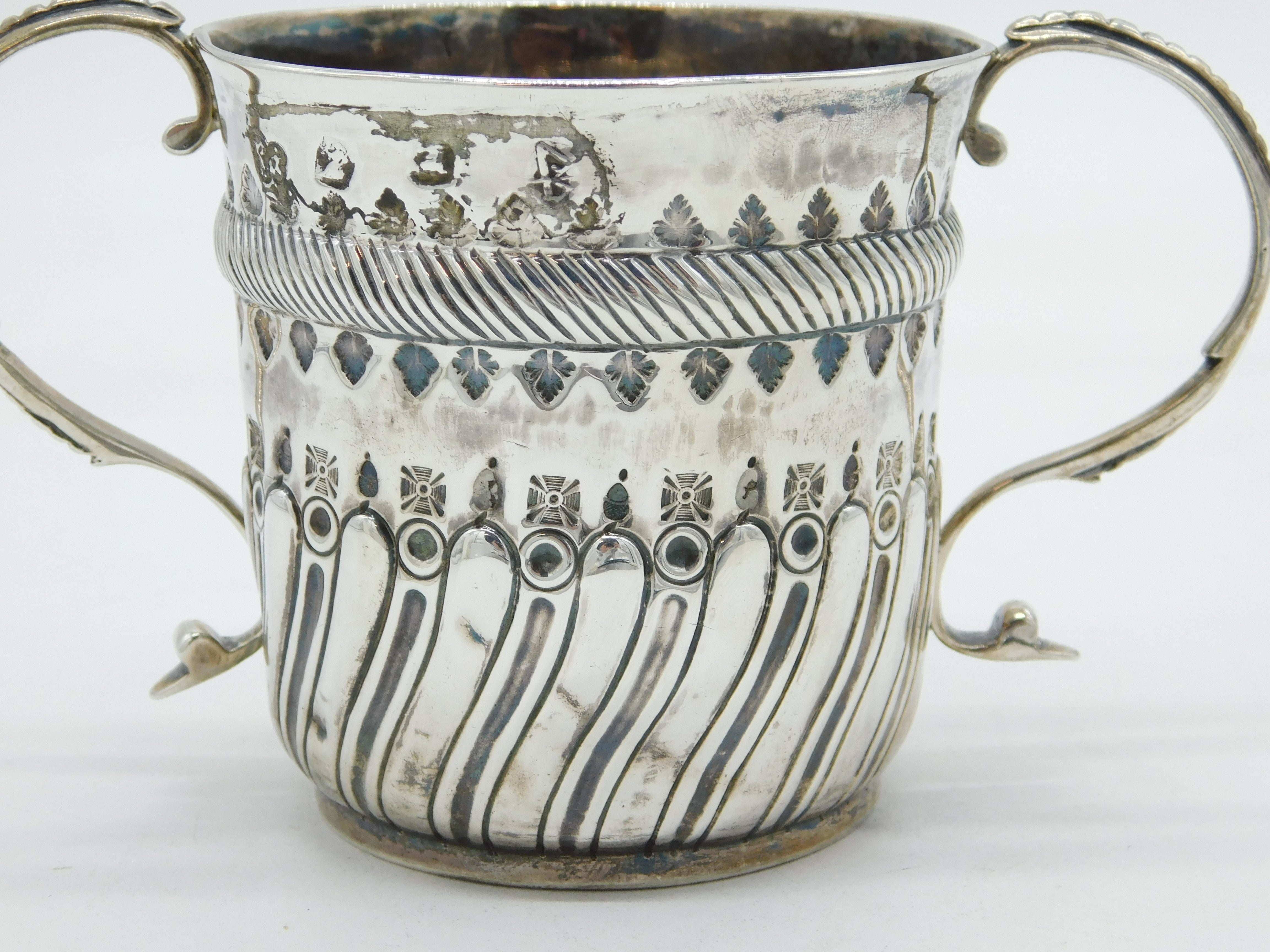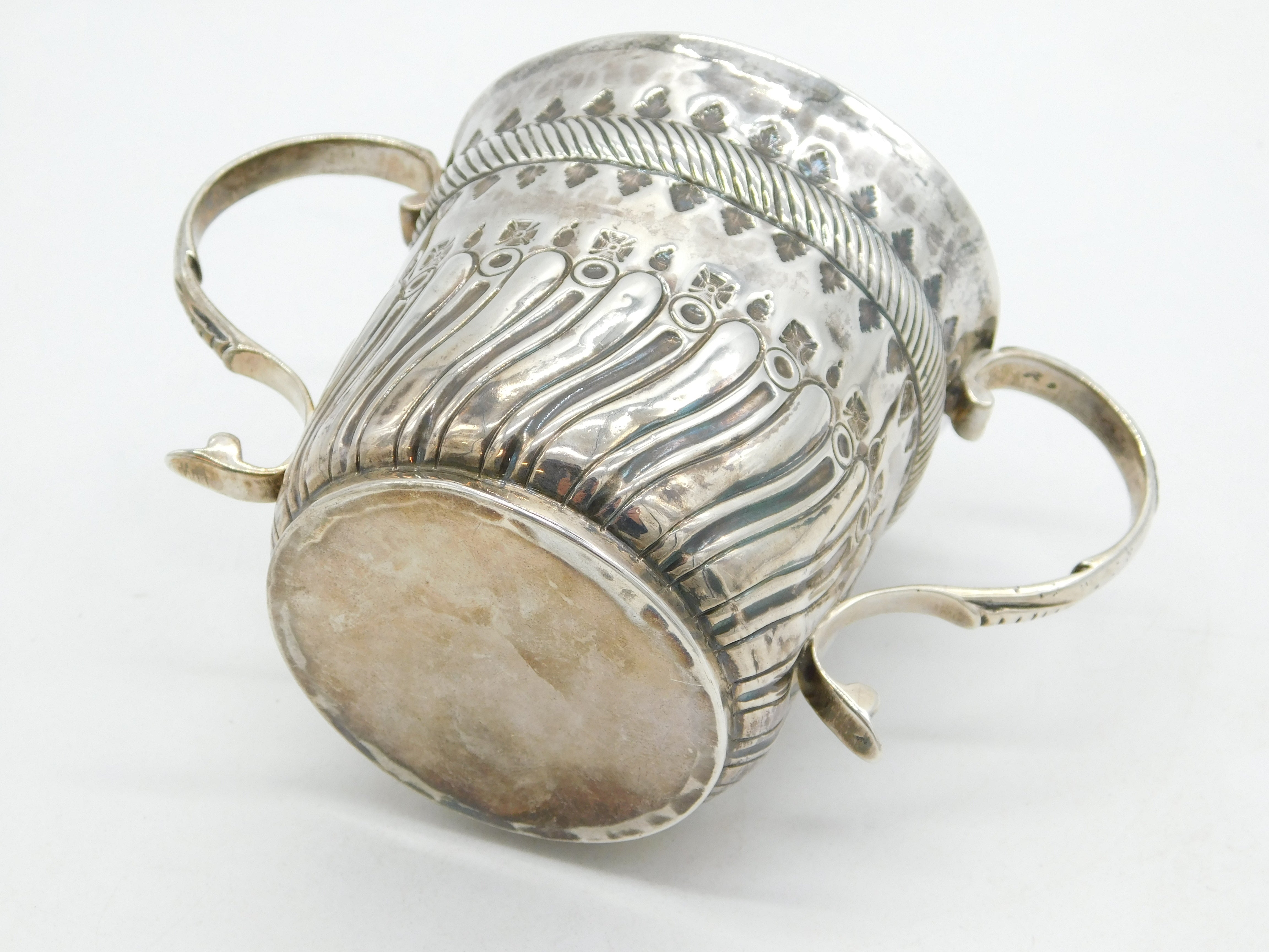 Details: A fantastic and wonderfully designed antique early britannia grade silver two-handled porringer cup with ropework design and floral patterns nicely hallmarked to the top edge London 1705 by John Rand. Lovely condition with no obvious repairs or damage. This is a wonderful item that would make a perfect gift or addition to any collection. We are more than happy to provide XRF reports for items upon request.