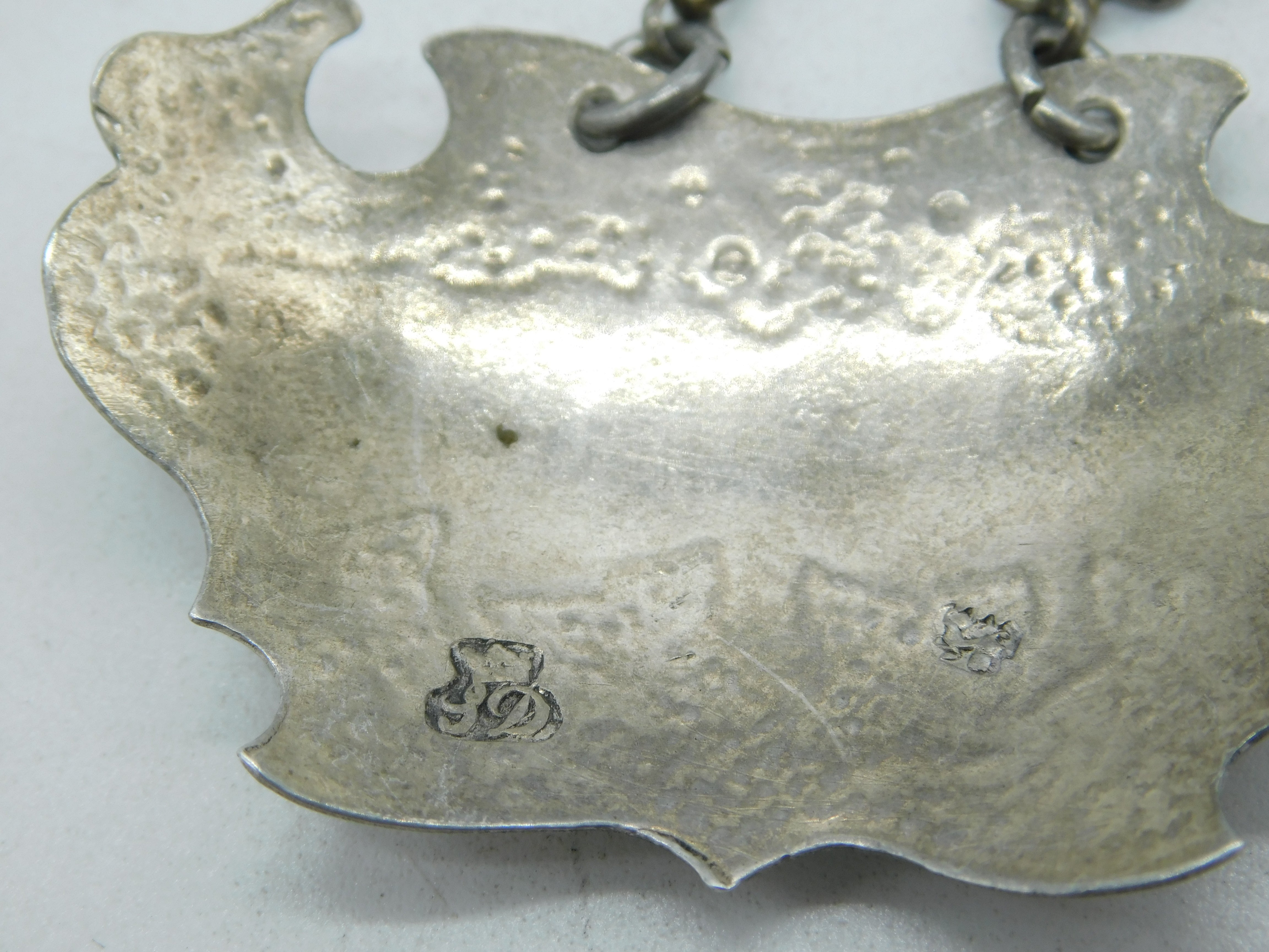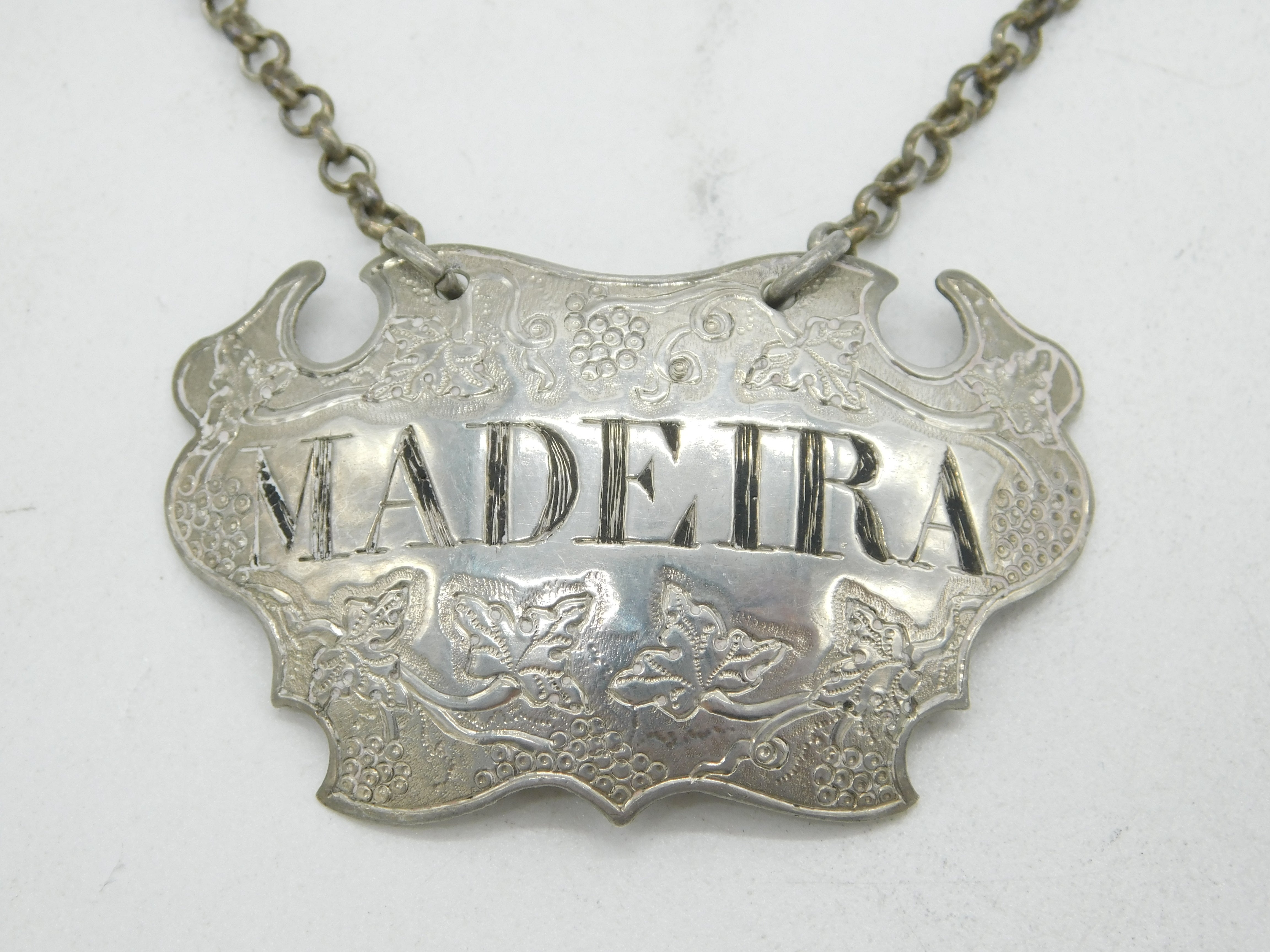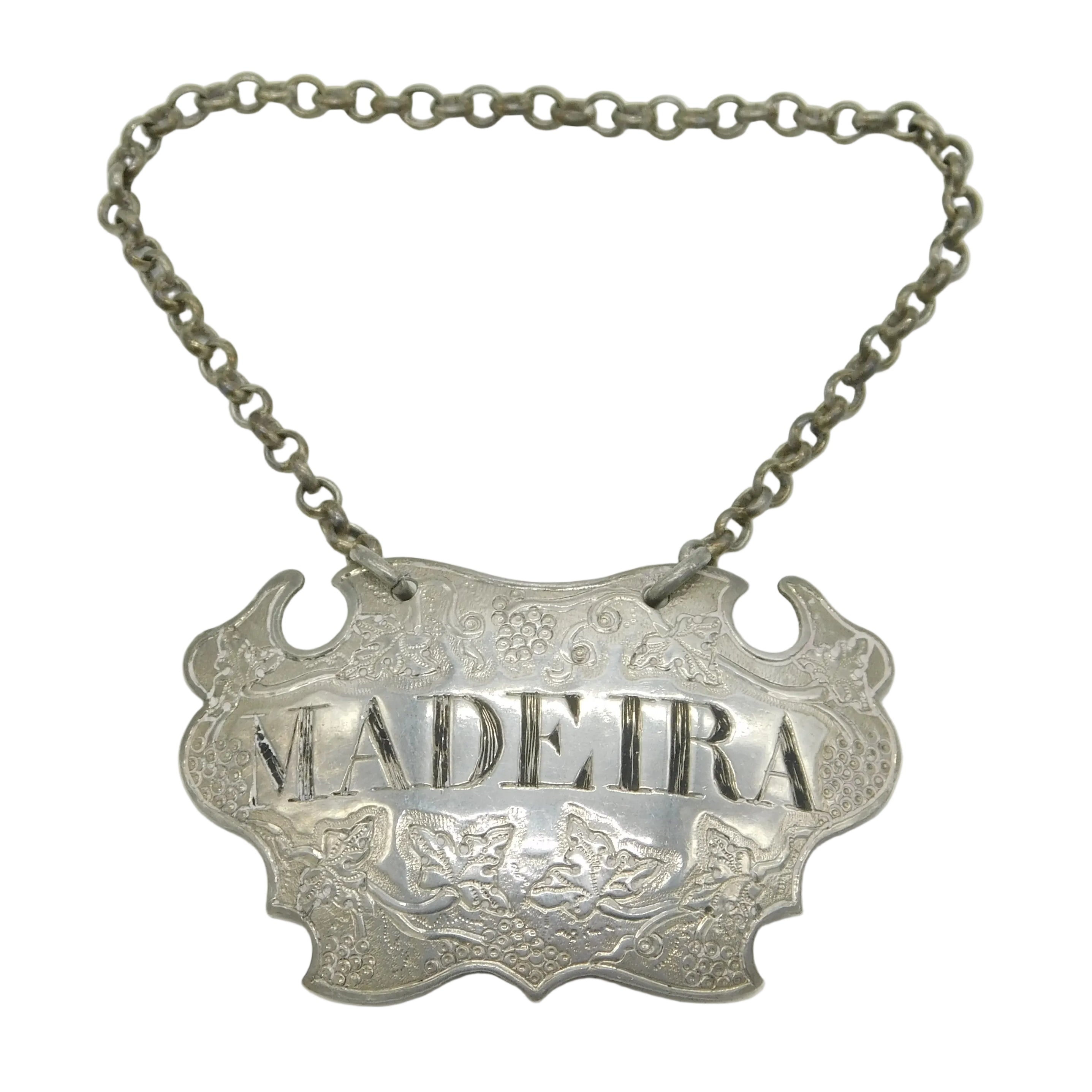 Details: A fantastic and wonderfully designed antique early-georgian sterling silver Madeira decanter label in lovely escutcheon form hallmarked to the reverse by known label maker Sandylands Drinkwater c1745. The labels are hallmarked by important silversmith Sandylands Drinkwater known to be one of the earliest produces of decanter labels beginning in the mid-1720s. These particular labels bear the Drinkwater makers mark dating them to around 1745. This is a wonderful item that would make a perfect gift or addition to any collection. We are more than happy to provide XRF reports for items upon request.