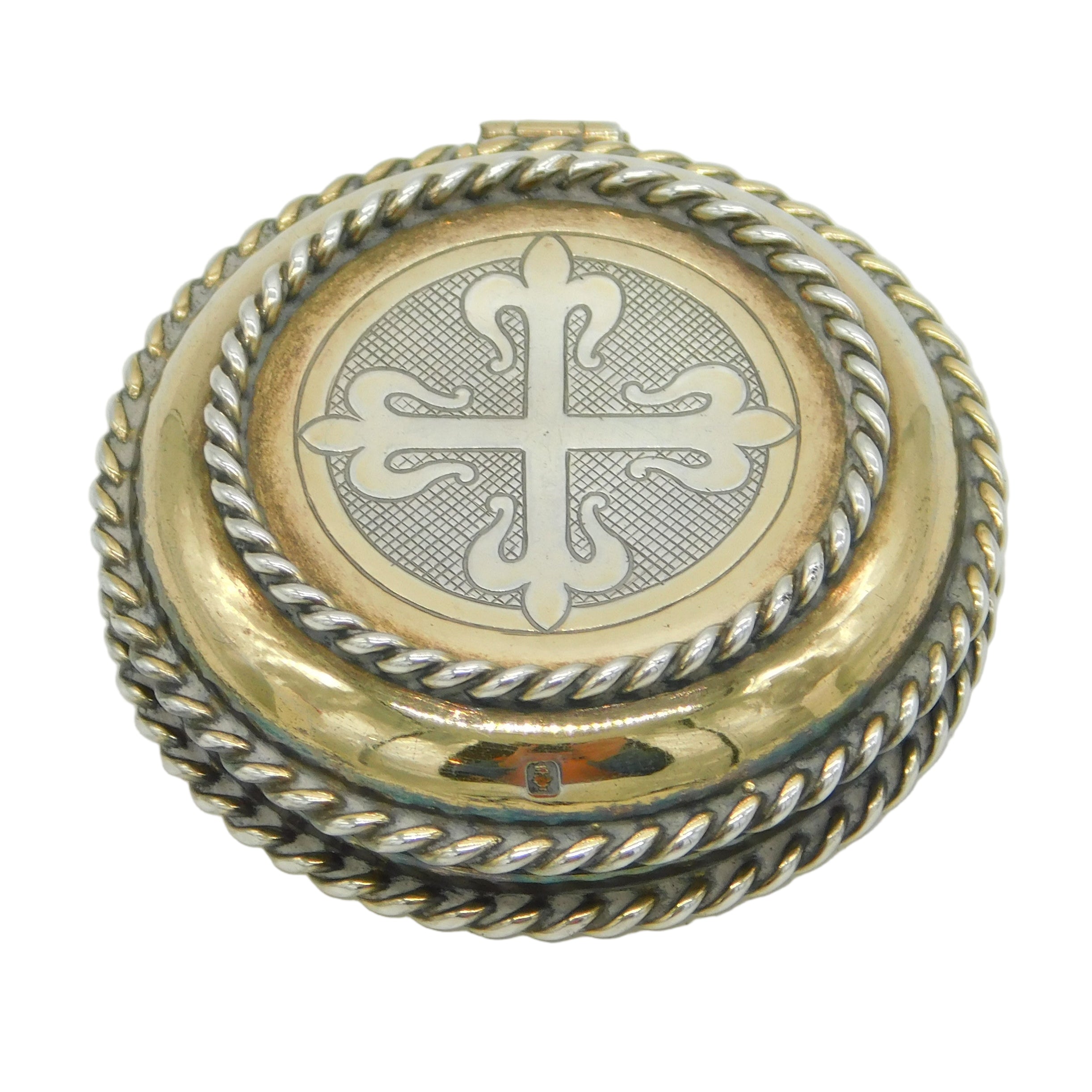 Details: A fantastic and wonderfully designed antique art deco Scottish sterling silver gilt religious travelling communion wafer holder or pyx with lovely cros to the lid, hallmarked Glasgow 1921 by John Fettes. This is a wonderful item that would make a perfect gift or addition to any collection. We are more than happy to provide XRF reports for items upon request.