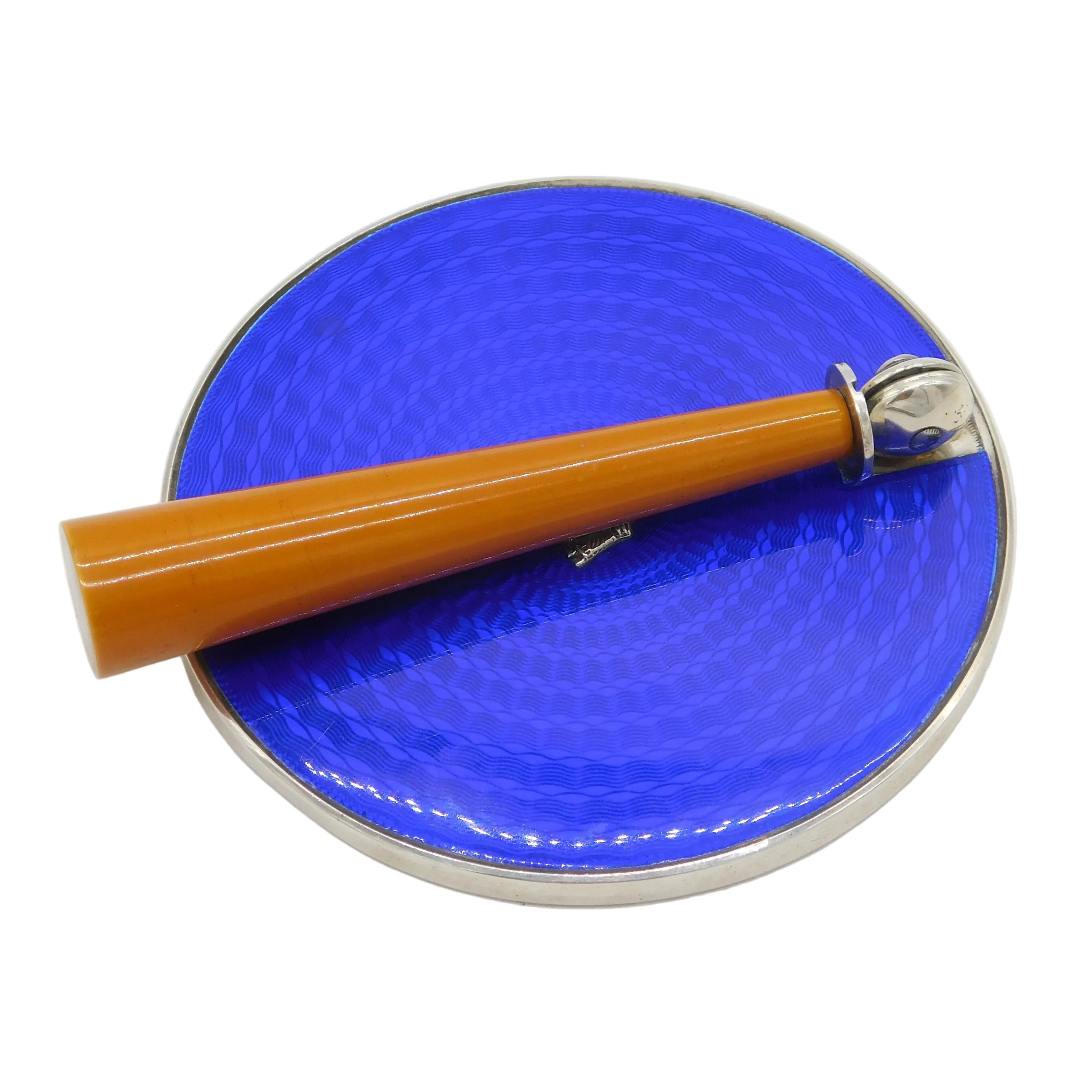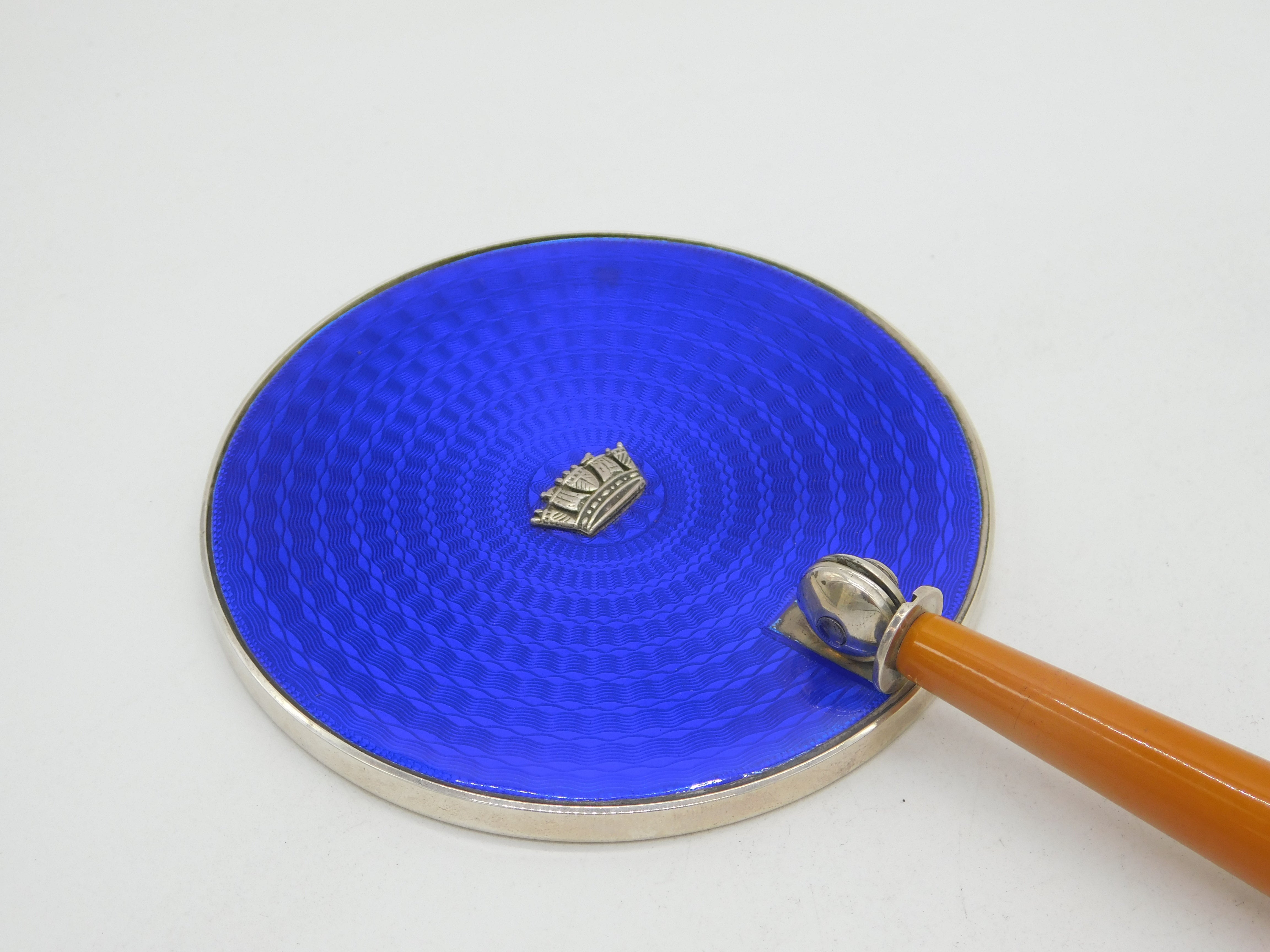 Details: A fantastic and wonderfully designed antique art deco sterling silver & blue guilloche enamel folding travelling mirror bearing the insignia of the Royal Navy. Hallmarked to the edge for Birmingham 1938 by Adie Bros. The handle is crafted from bakelite and the enamel is in excellent condition. The item can be propped up to stand up on a ship! This is a wonderful item that would make a perfect gift or addition to any collection. We are more than happy to provide XRF reports for items upon request.