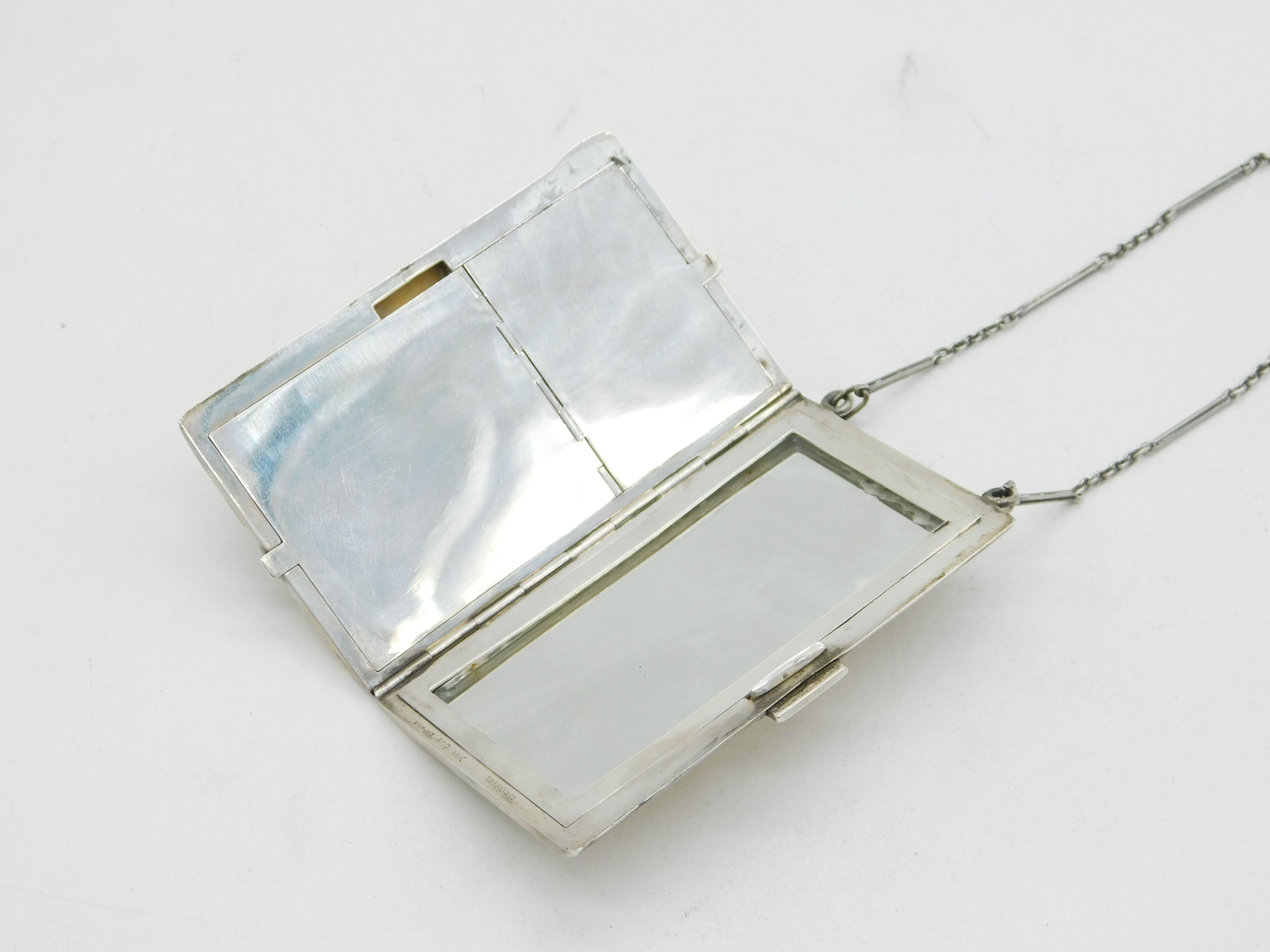 Details: A fantastic and wonderfully designed antique art deco Tiffany & Co. 14ct bi-colour gold and sterling silver mirror compact with twin section for makeup and interior mirror, hallmarked 'Sterling & 14K, Tiffany & Co' c1920s. Minor chipping to the interior mirror. The compact is suspended on a sterling silver chain. This is a wonderful item that would make a perfect gift or addition to any collection. We are more than happy to provide XRF reports for items upon request.