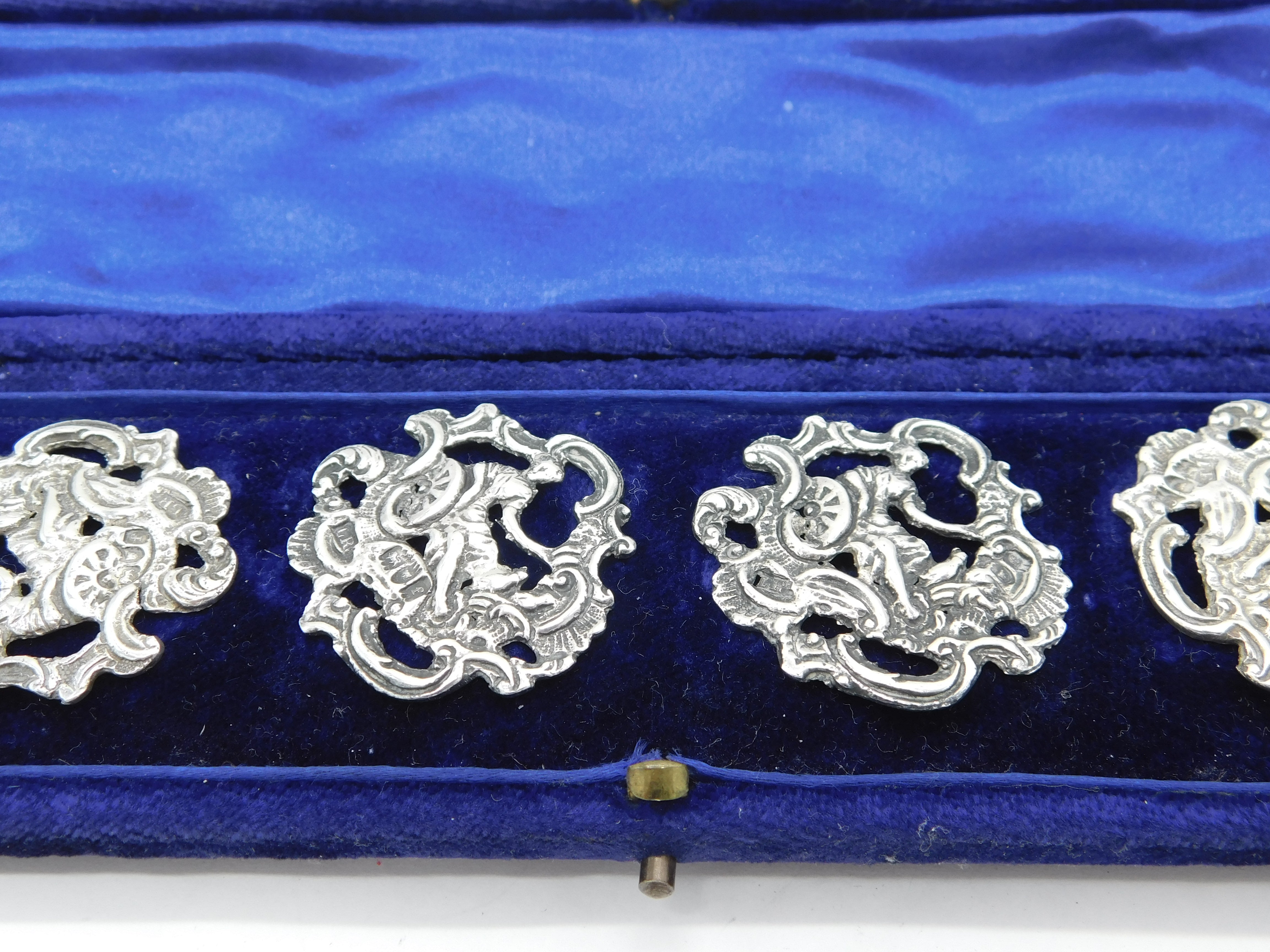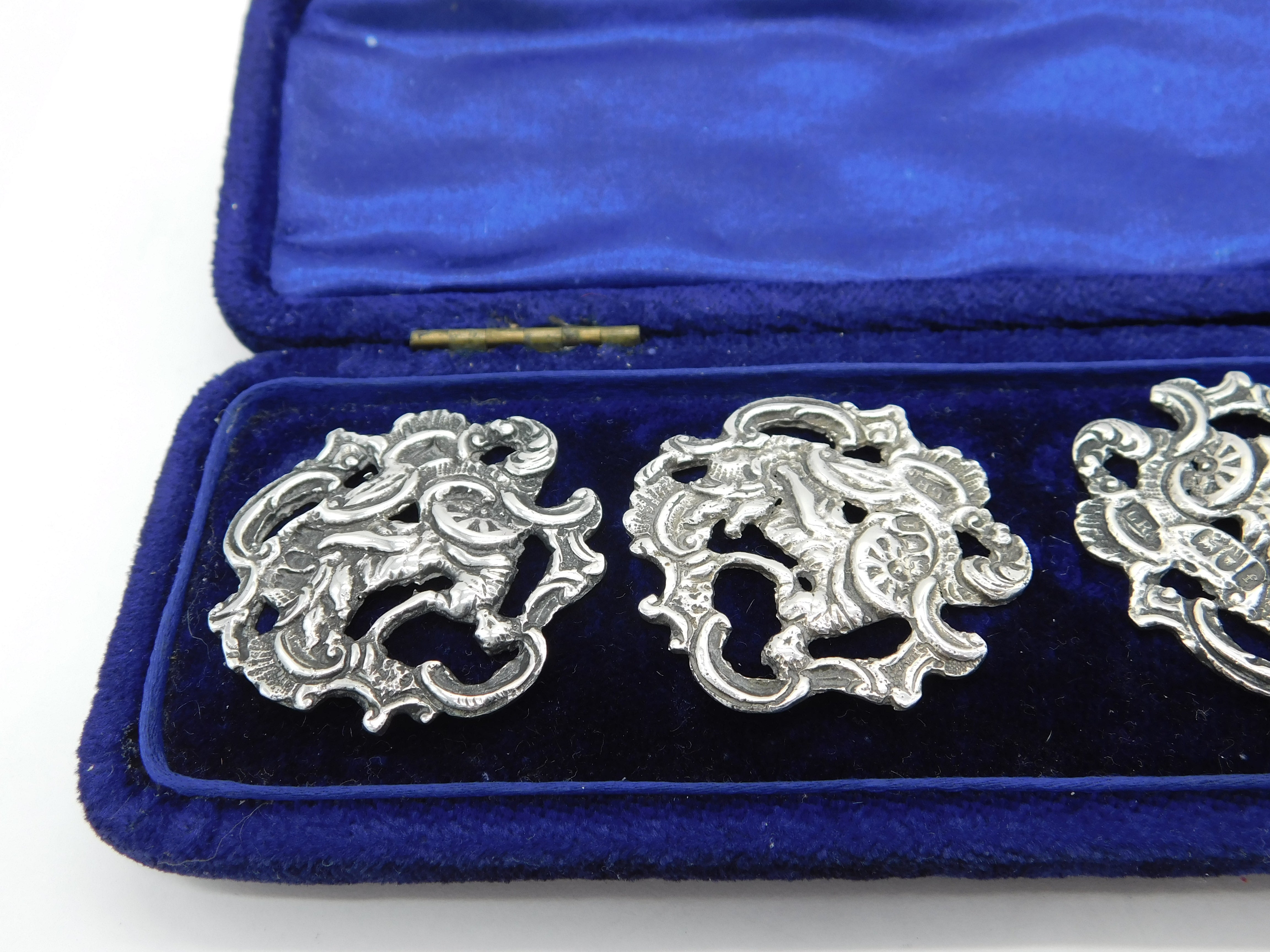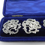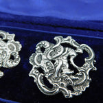 Details: A fantastic and wonderfully designed antique boxed Victorian set of sterling silver large dress buttons depicting Britannia with floral patterns, hallmarked for London 1901 by Loewe Rosenthal. This is a wonderful item that would make a perfect gift or addition to any collection. We are more than happy to provide XRF reports for items upon request.