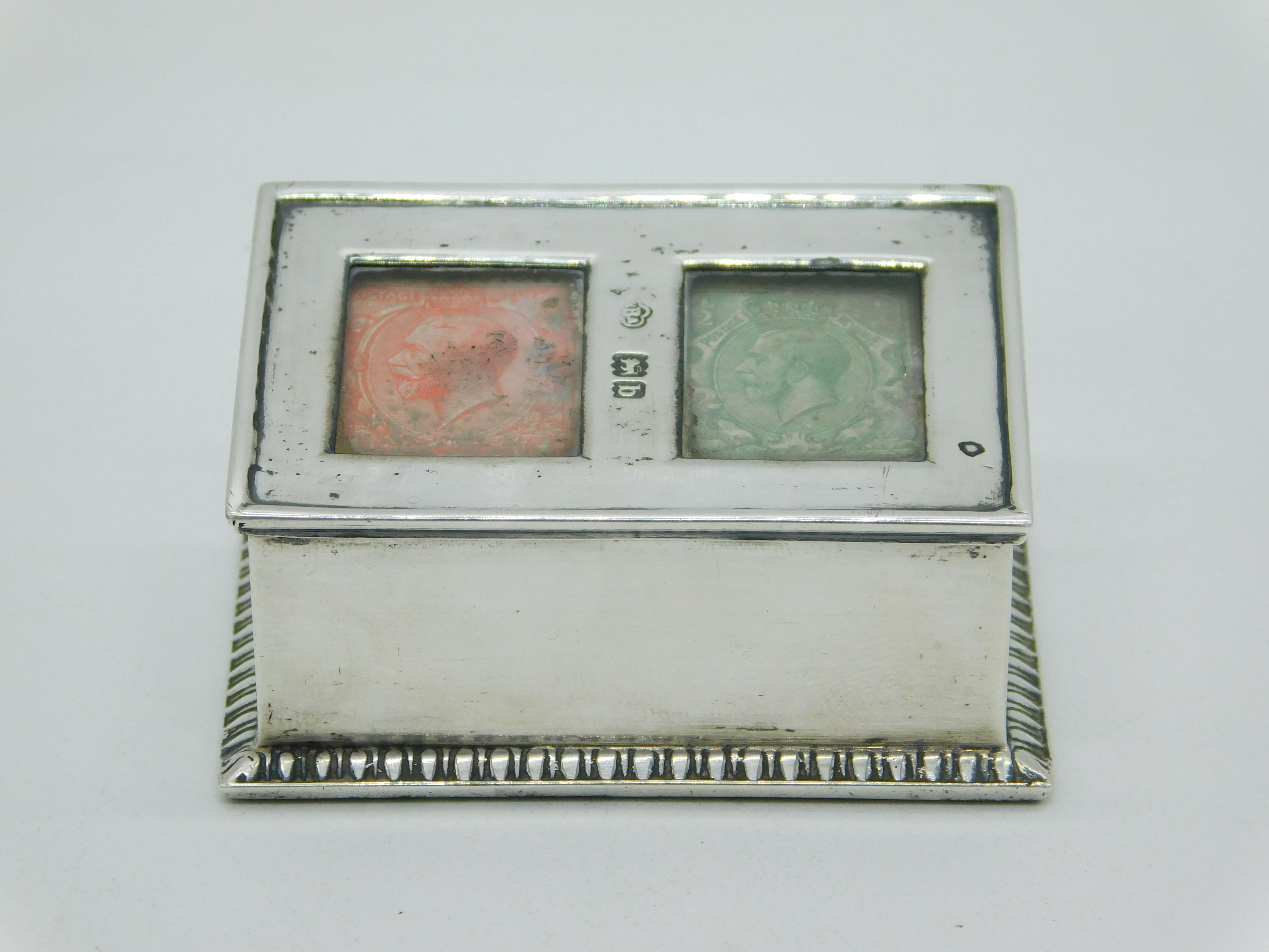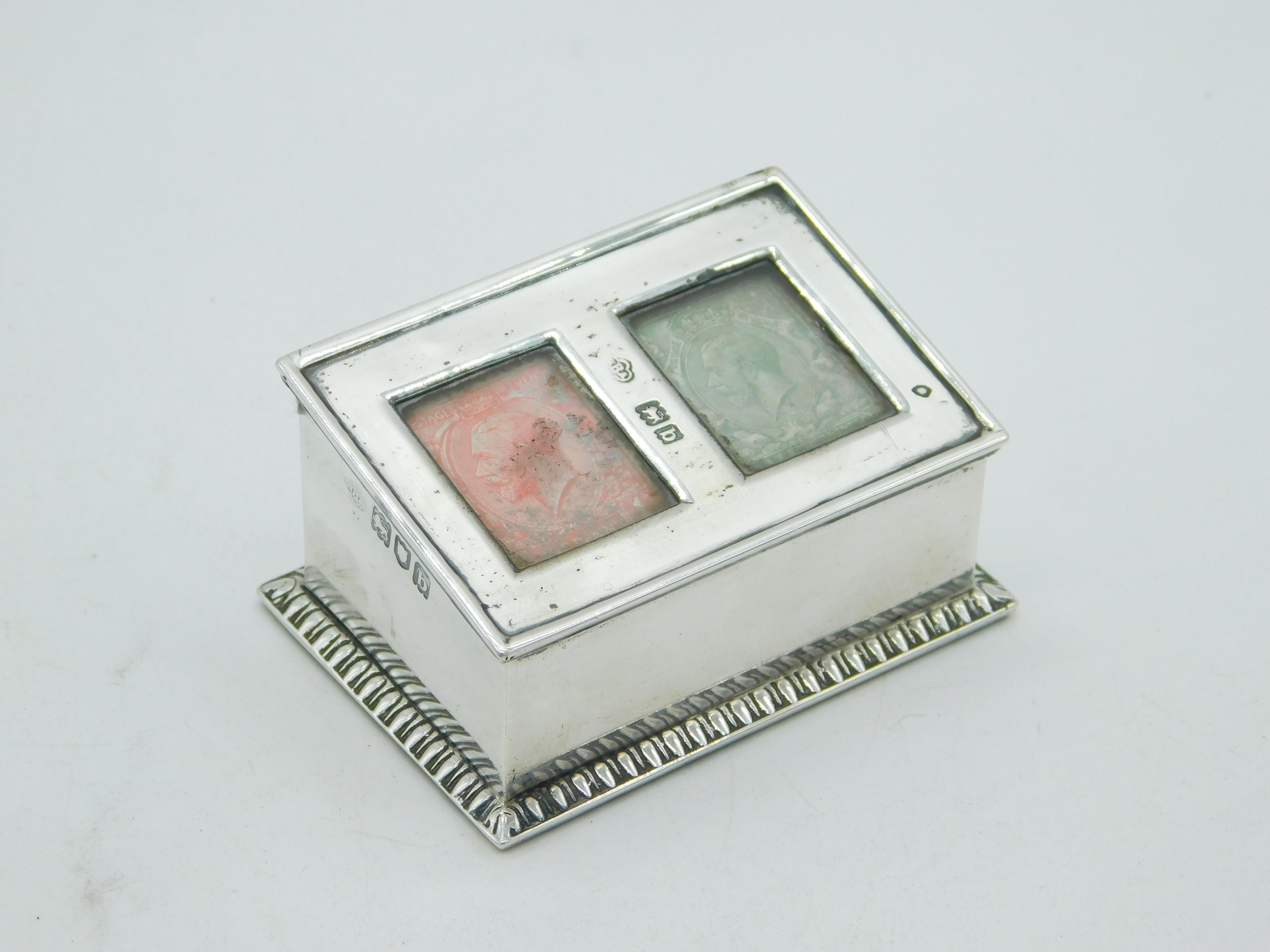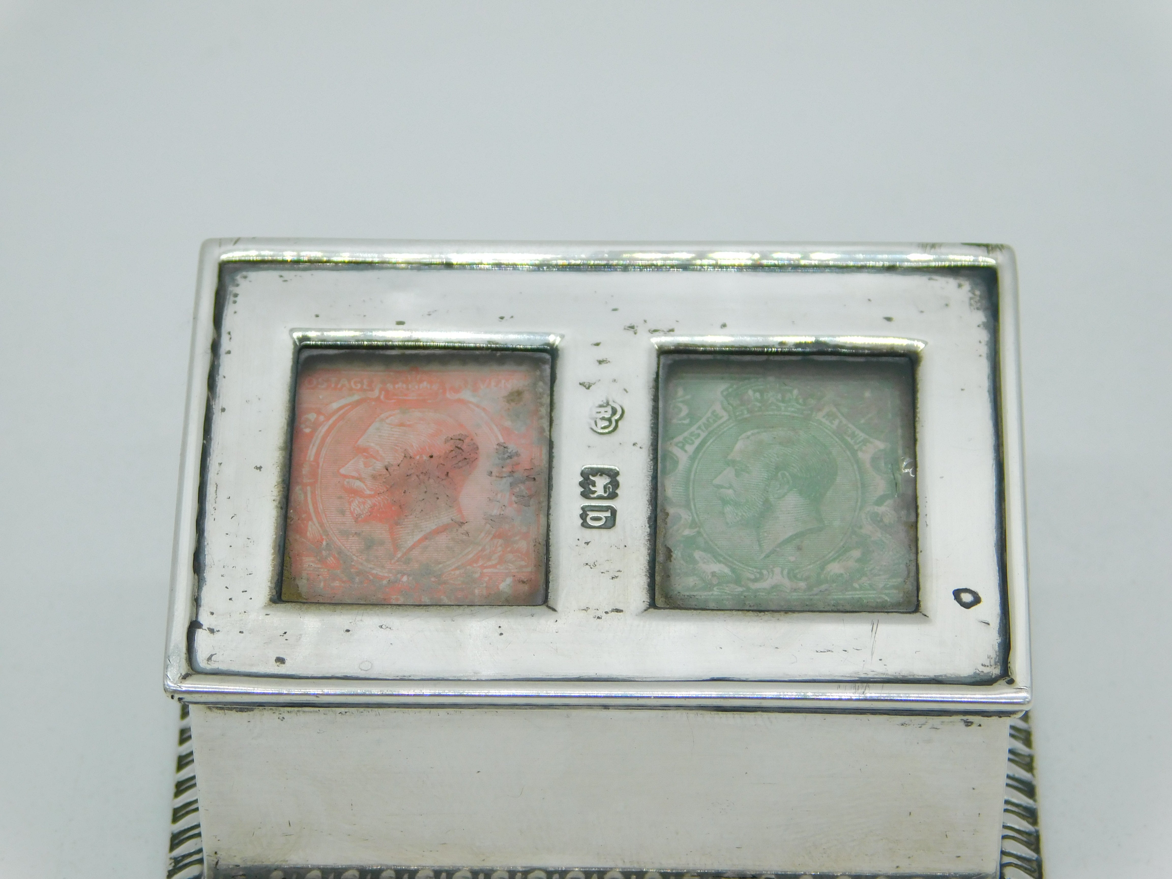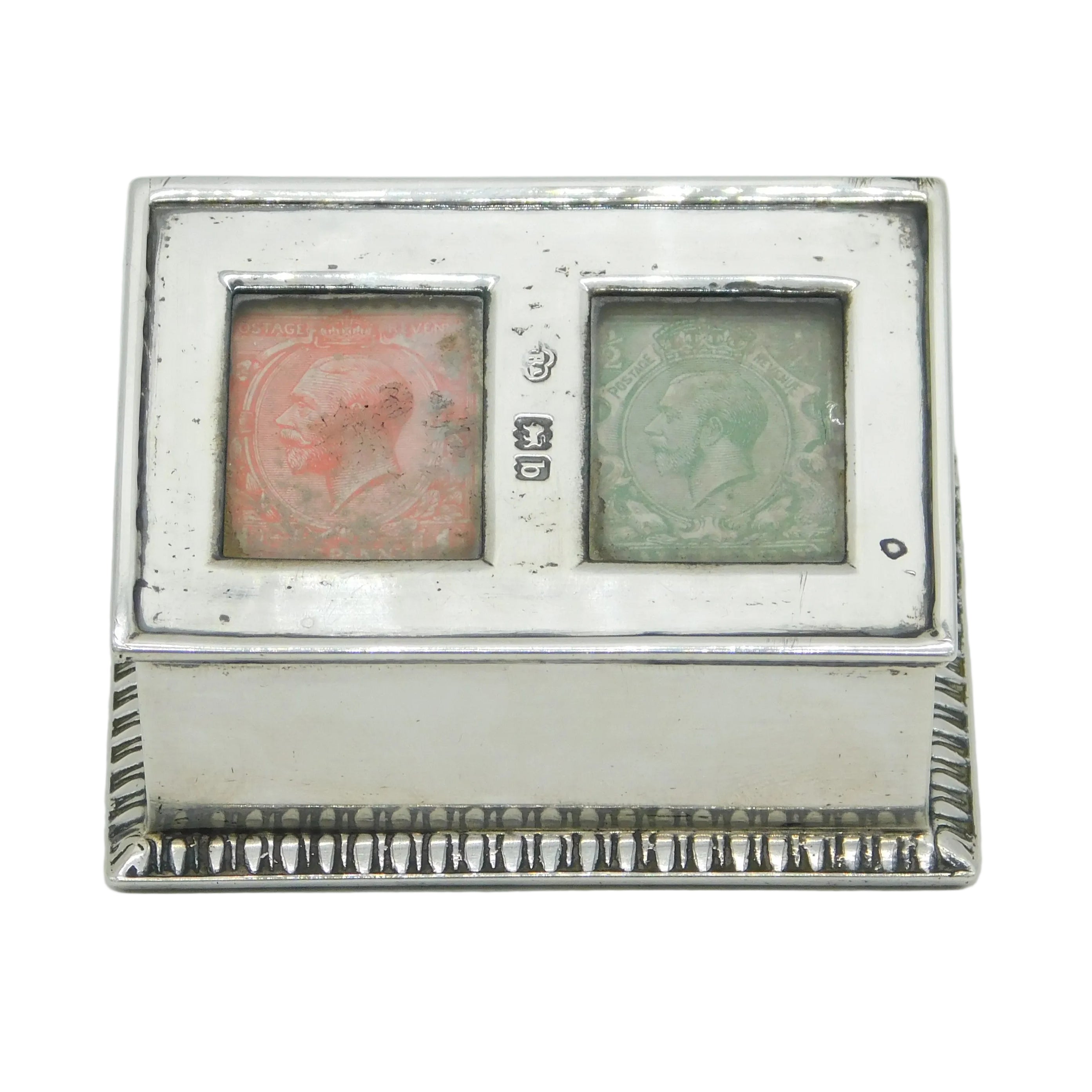 Details: A fantastic and wonderfully designed antique late-Victorian sterling silver double compartment stamp box set with two George V stamps hallmarked in multiple places for London 1898. Weighted to the base please note. This is a wonderful item that would make a perfect gift or addition to any collection. We are more than happy to provide XRF reports for items upon request.