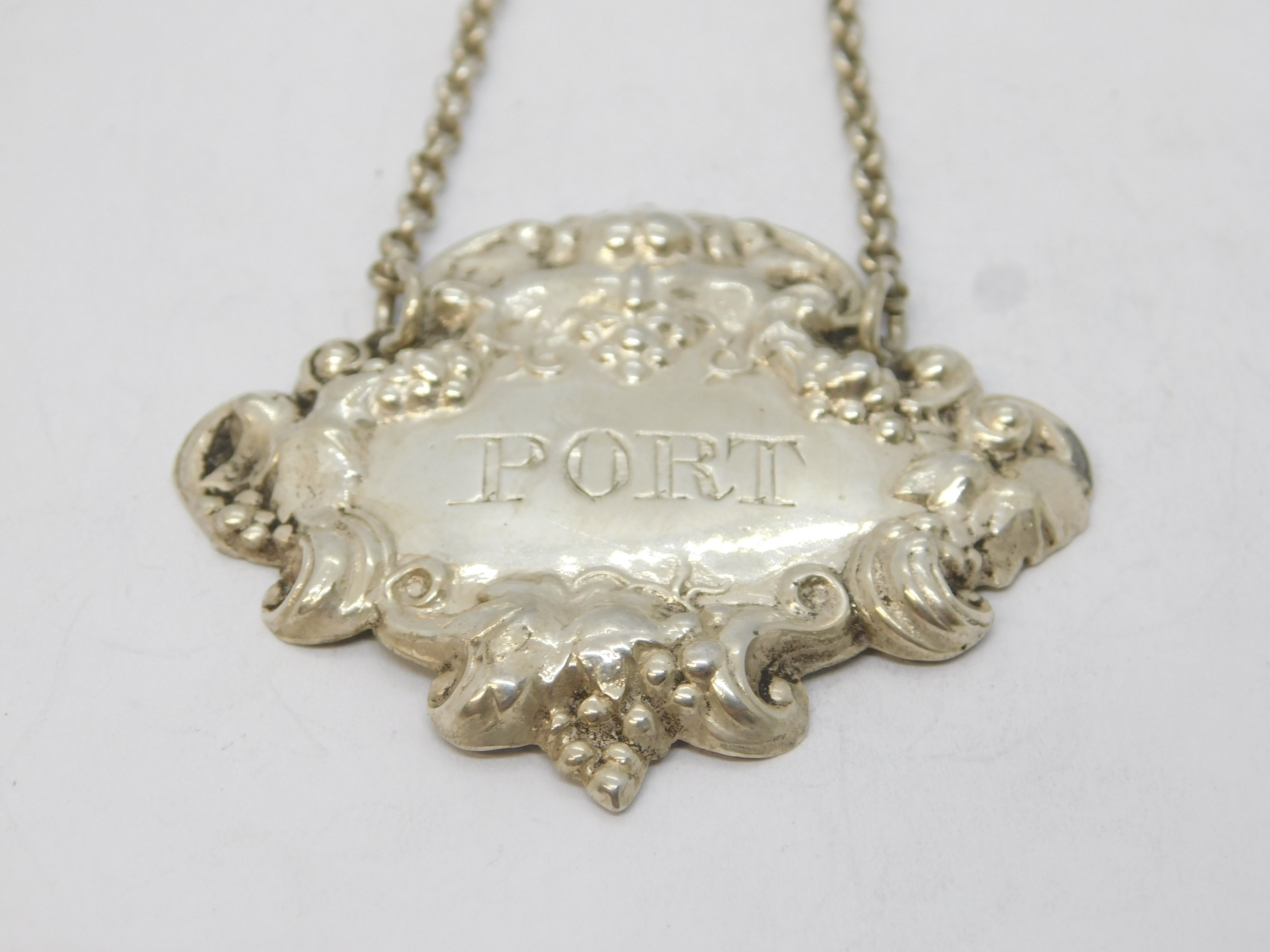 Details: A fantastic and wonderfully designed antique Victorian sterling silver floral pattern Port decanter label hallmarked Birmingham 1897 by George Unite. This is a wonderful item that would make a perfect gift or addition to any collection. We are more than happy to provide XRF reports for items upon request.