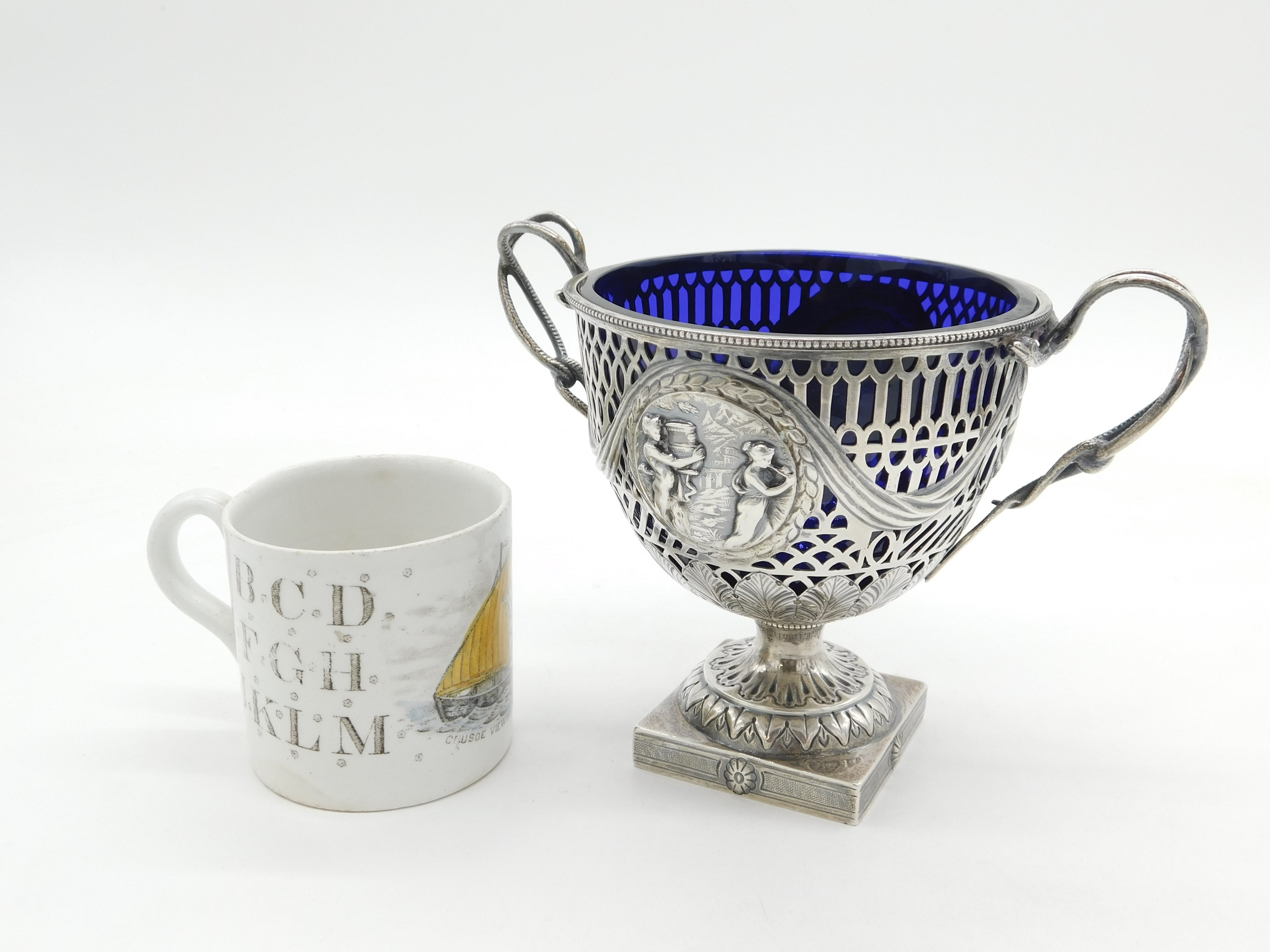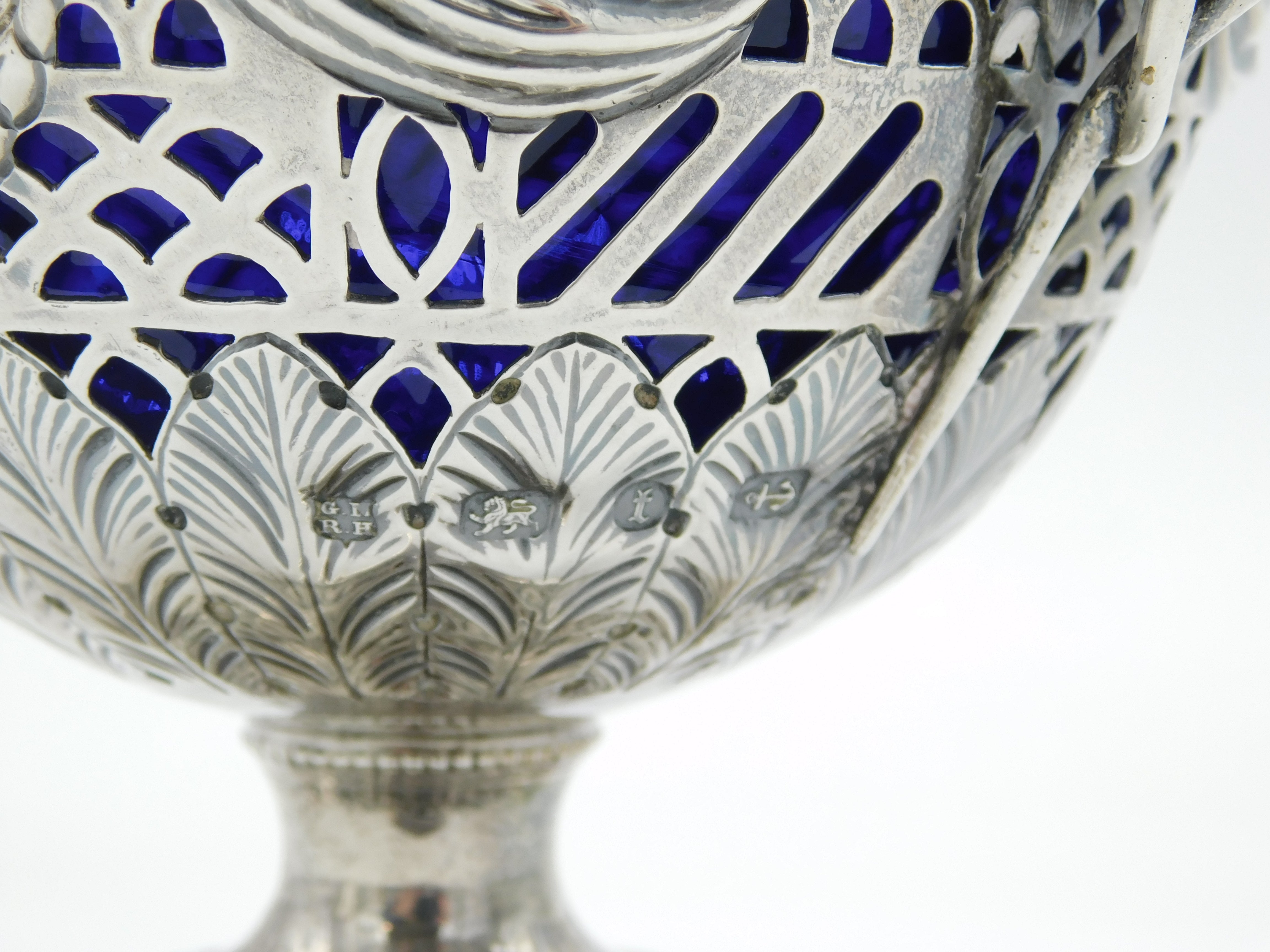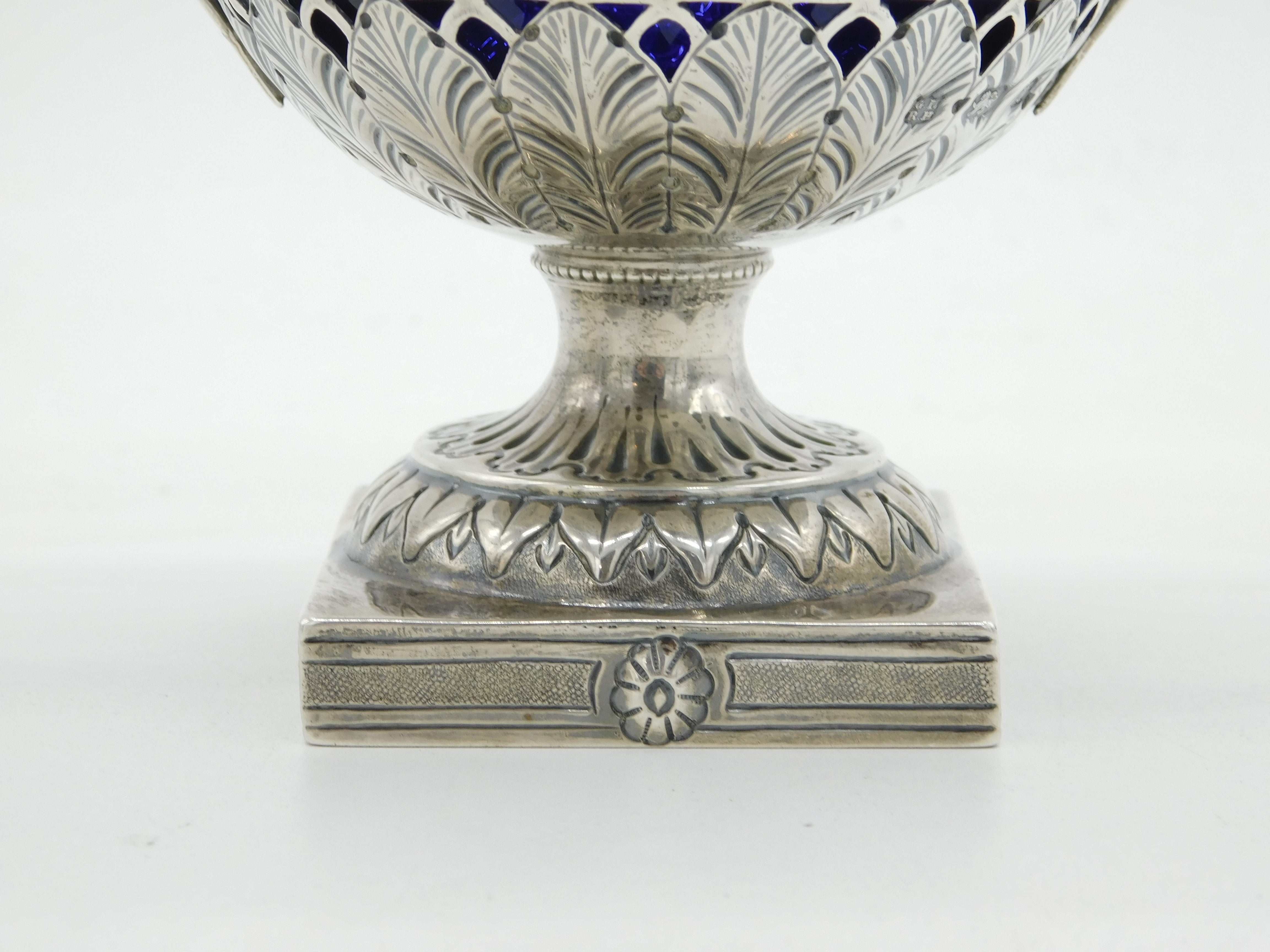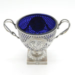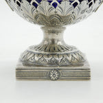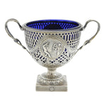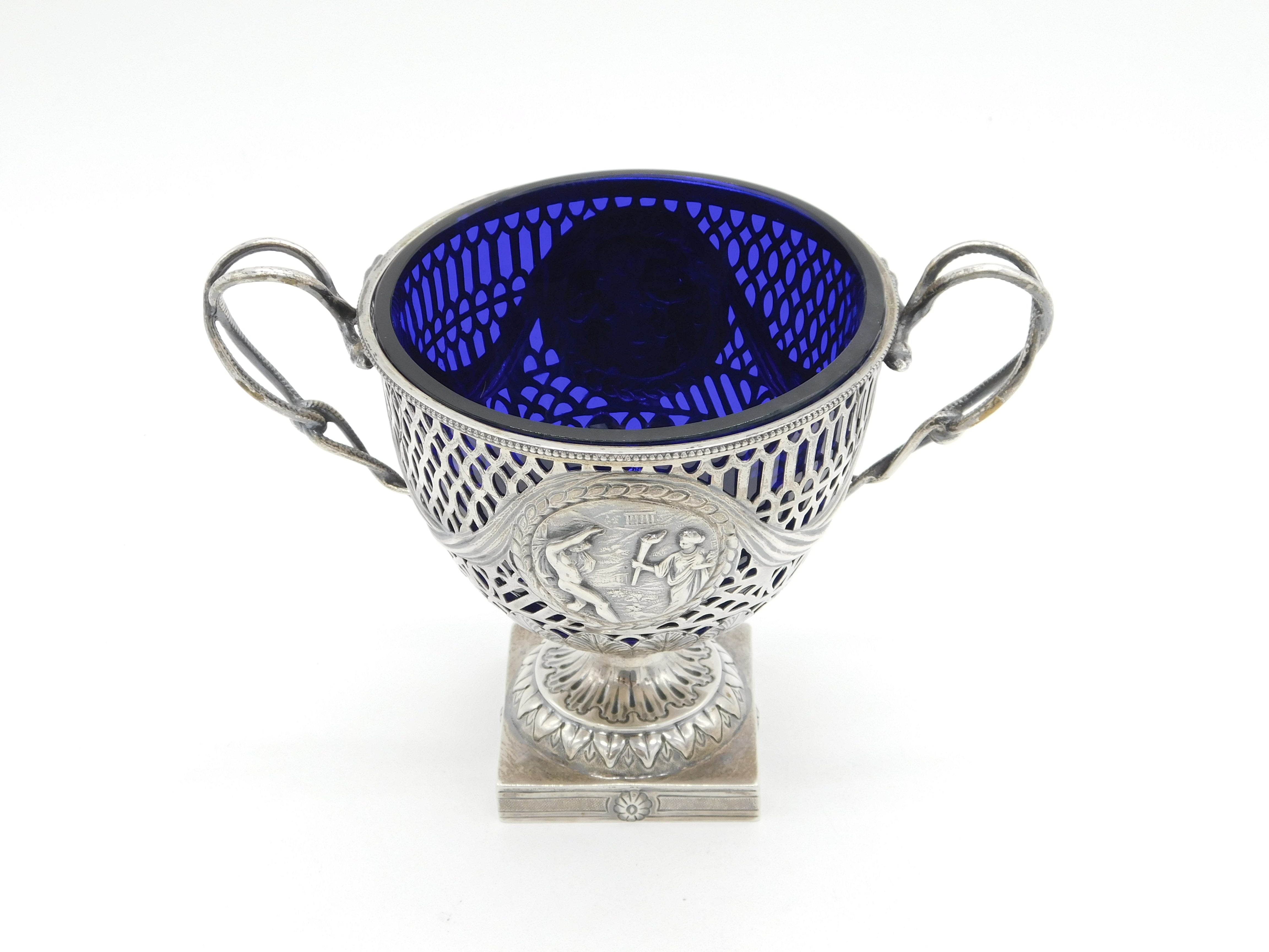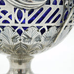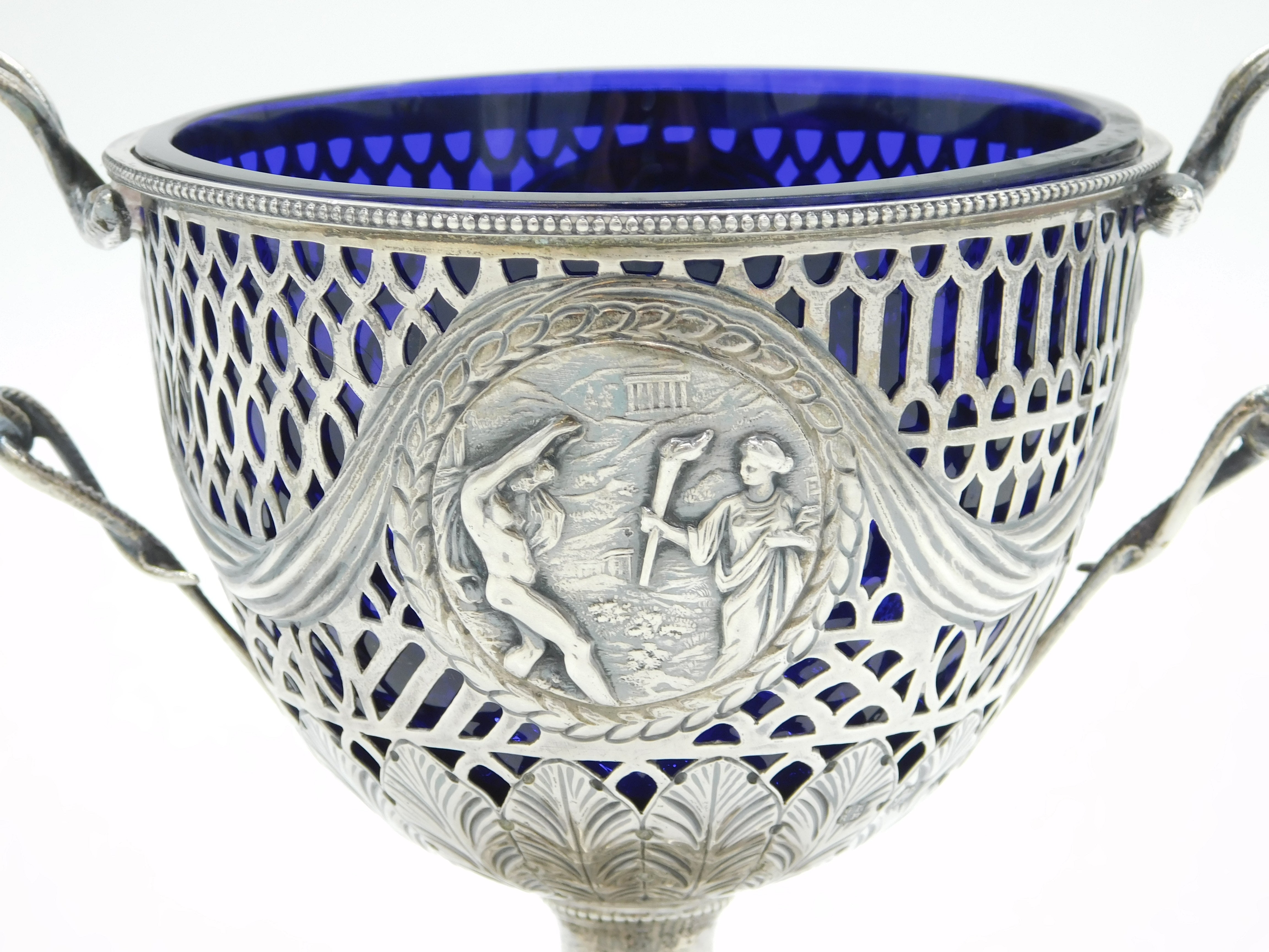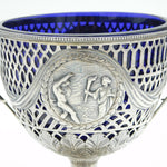 Details: A fantastic and wonderfully designed antique late-Victorian ornate sterling silver pedestal sugar bowl with blue glass fitted liner, decorated with charming olympic style classical scenes hallmarked Birmingham 1894 by George Nathan & Ridley Hayes. This is a wonderful item that would make a perfect gift or addition to any collection. We are more than happy to provide XRF reports for items upon request.