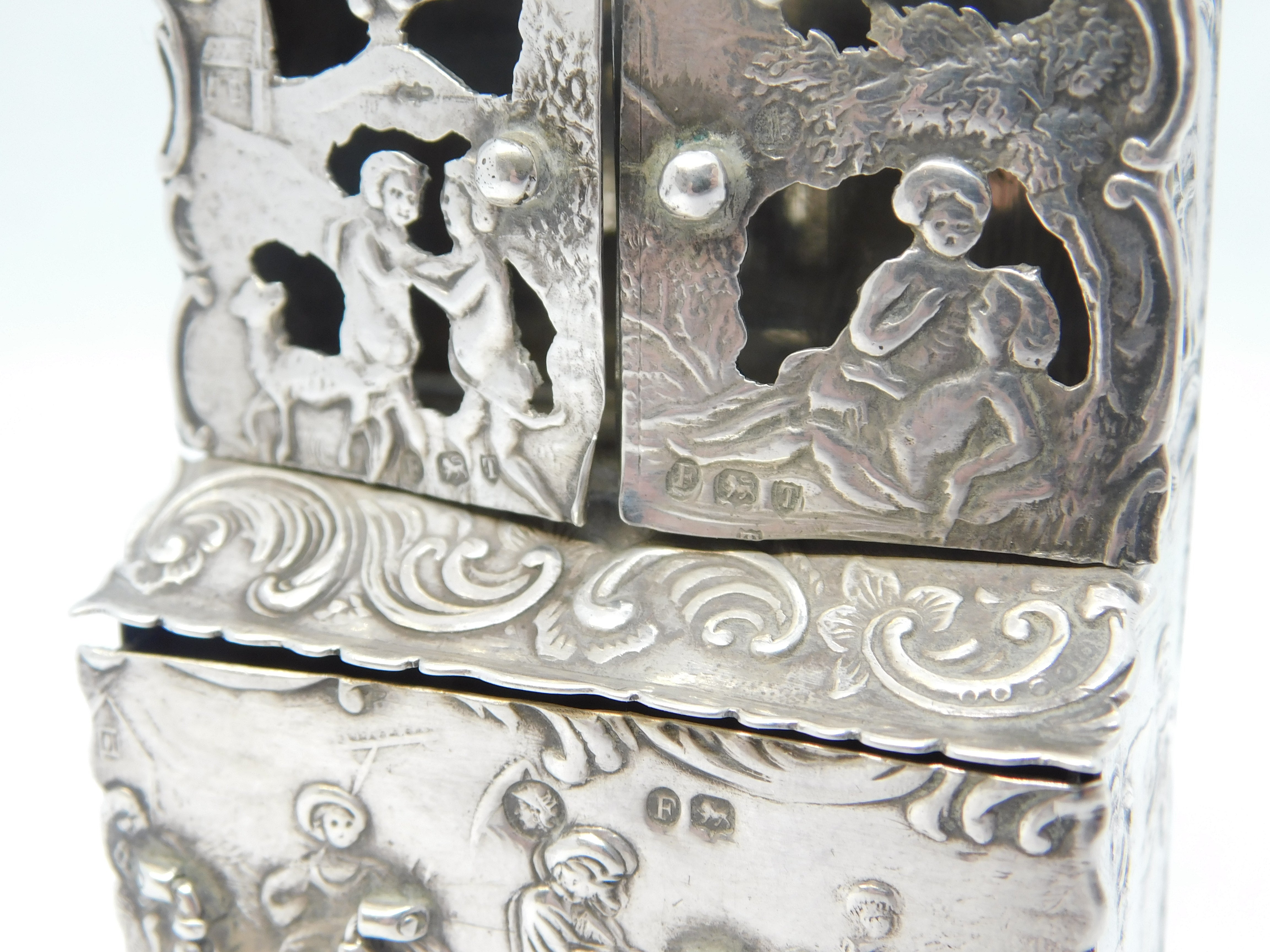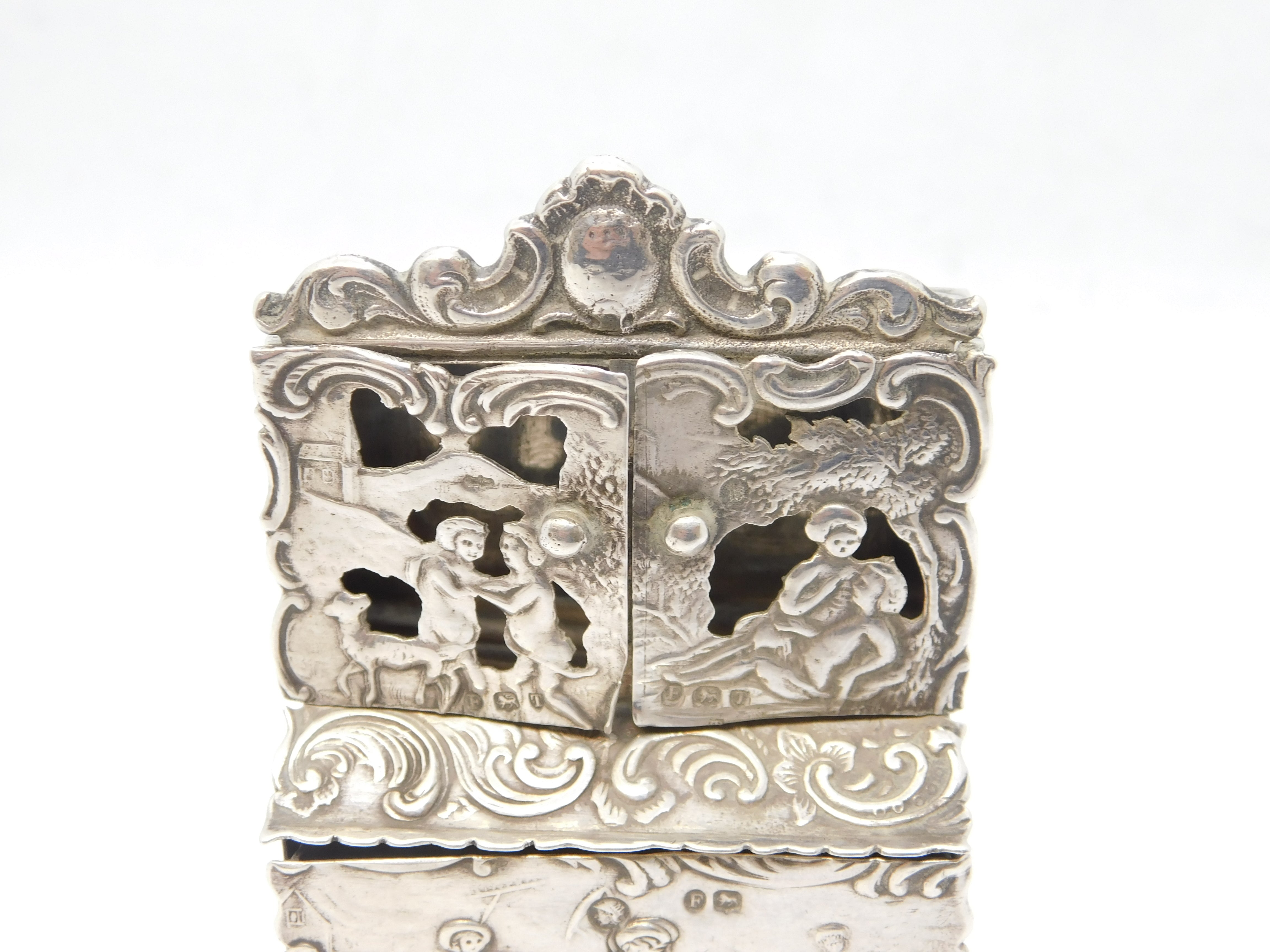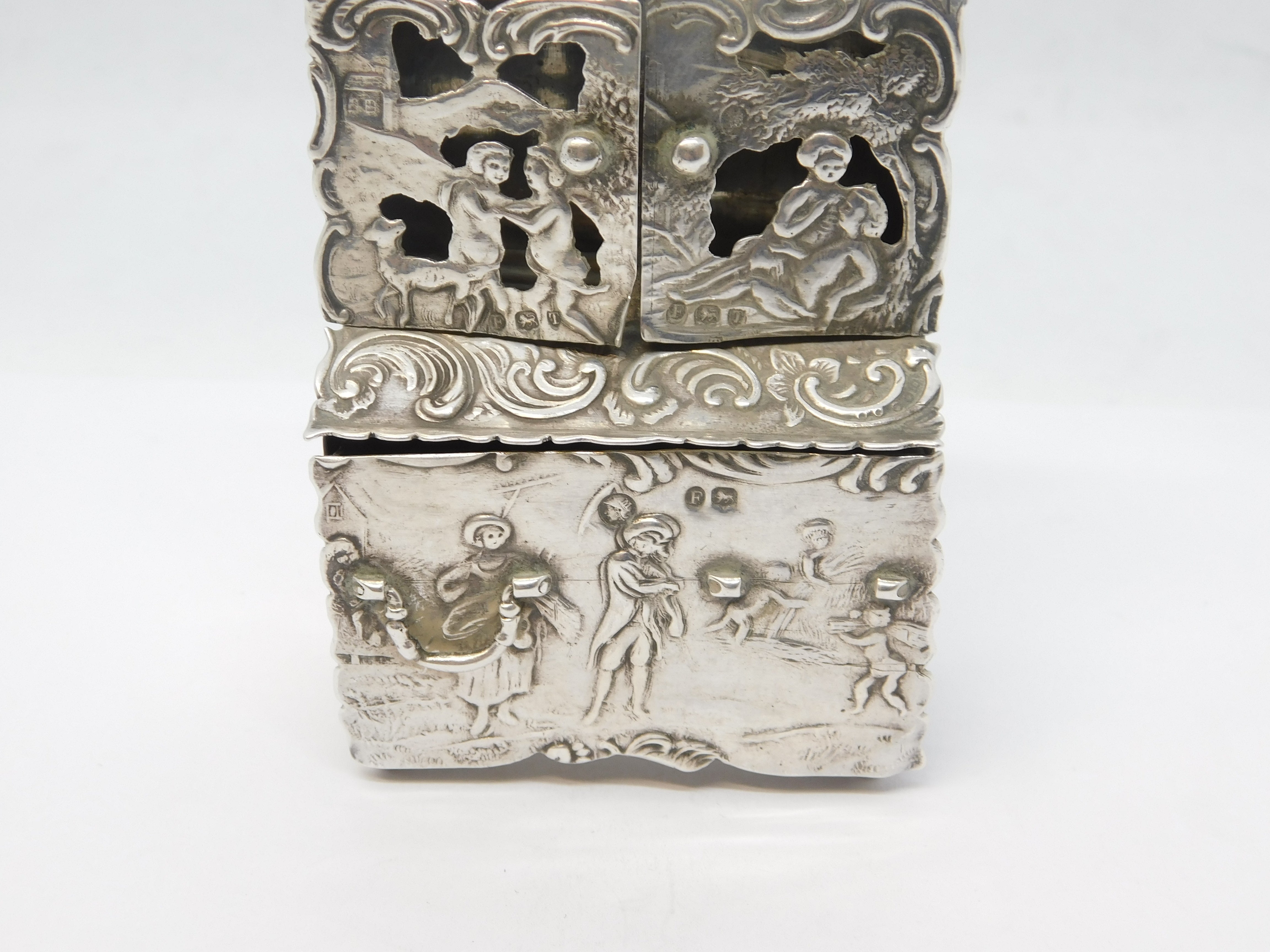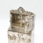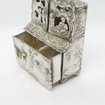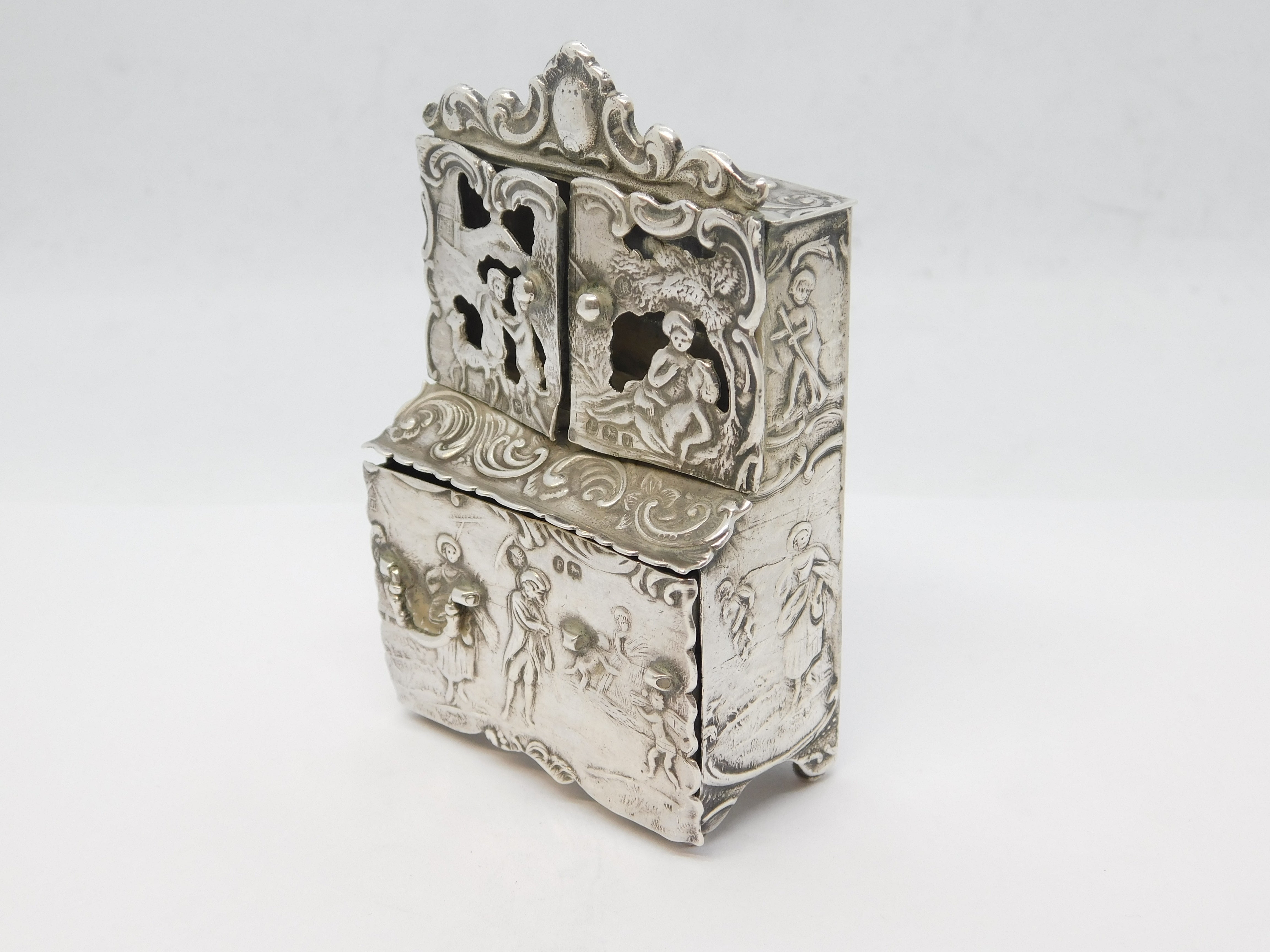 Details: A fantastic and wonderfully designed antique late-Victorian sterling silver miniature wardrobe with heavily decorated embossed details - two opening doors to the top and drawer to the bottom, one of the draw handles has broken please note and the top doors don't close flush, hallmarked London 1894 to the base with import hallmarks. This is a wonderful item that would make a perfect gift or addition to any collection. We are more than happy to provide XRF reports for items upon request.