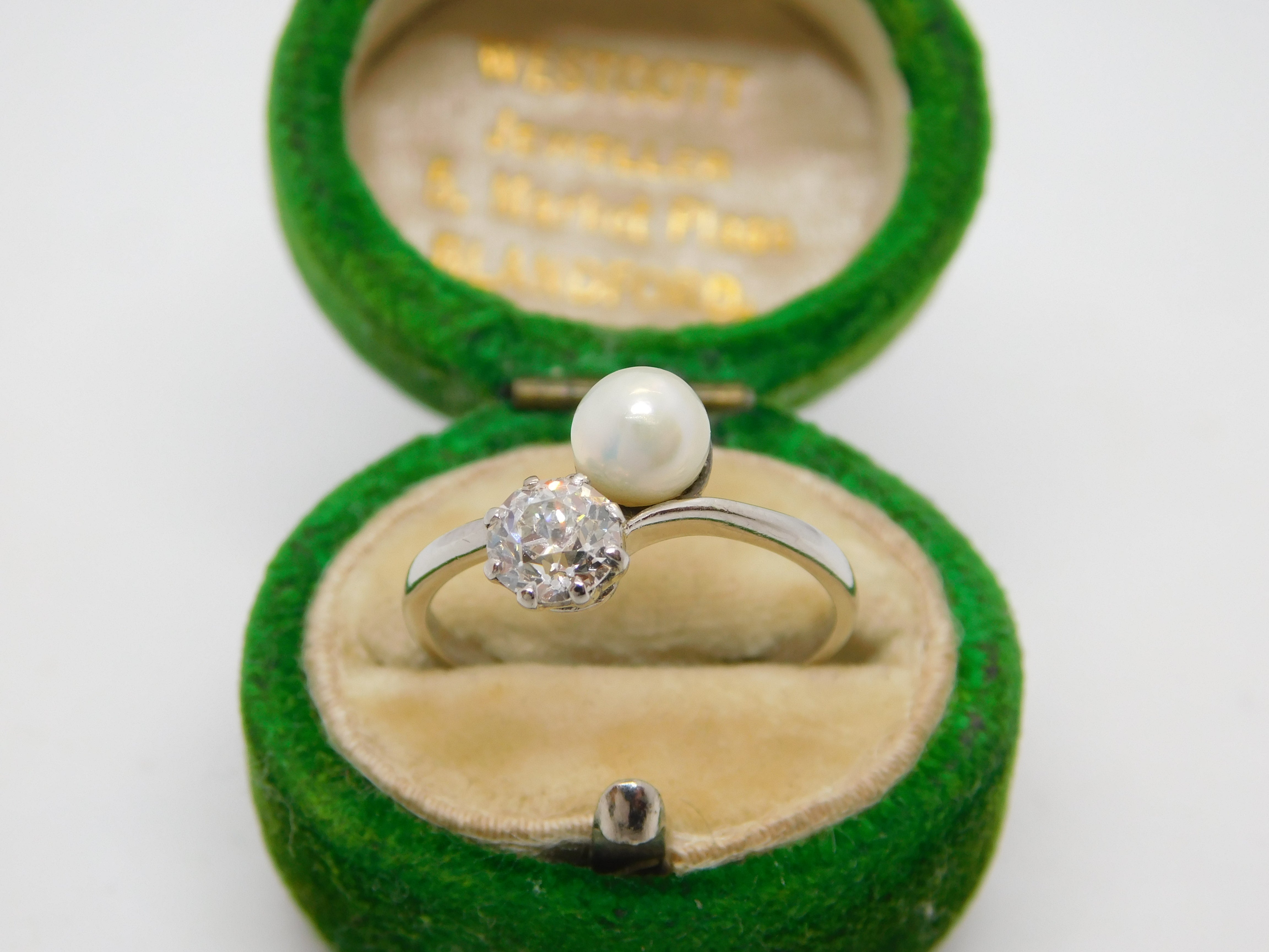 Platinum 0.6ct Claw Set European Cut Diamond & Pearl Crossover Ring Antique Art Deco
