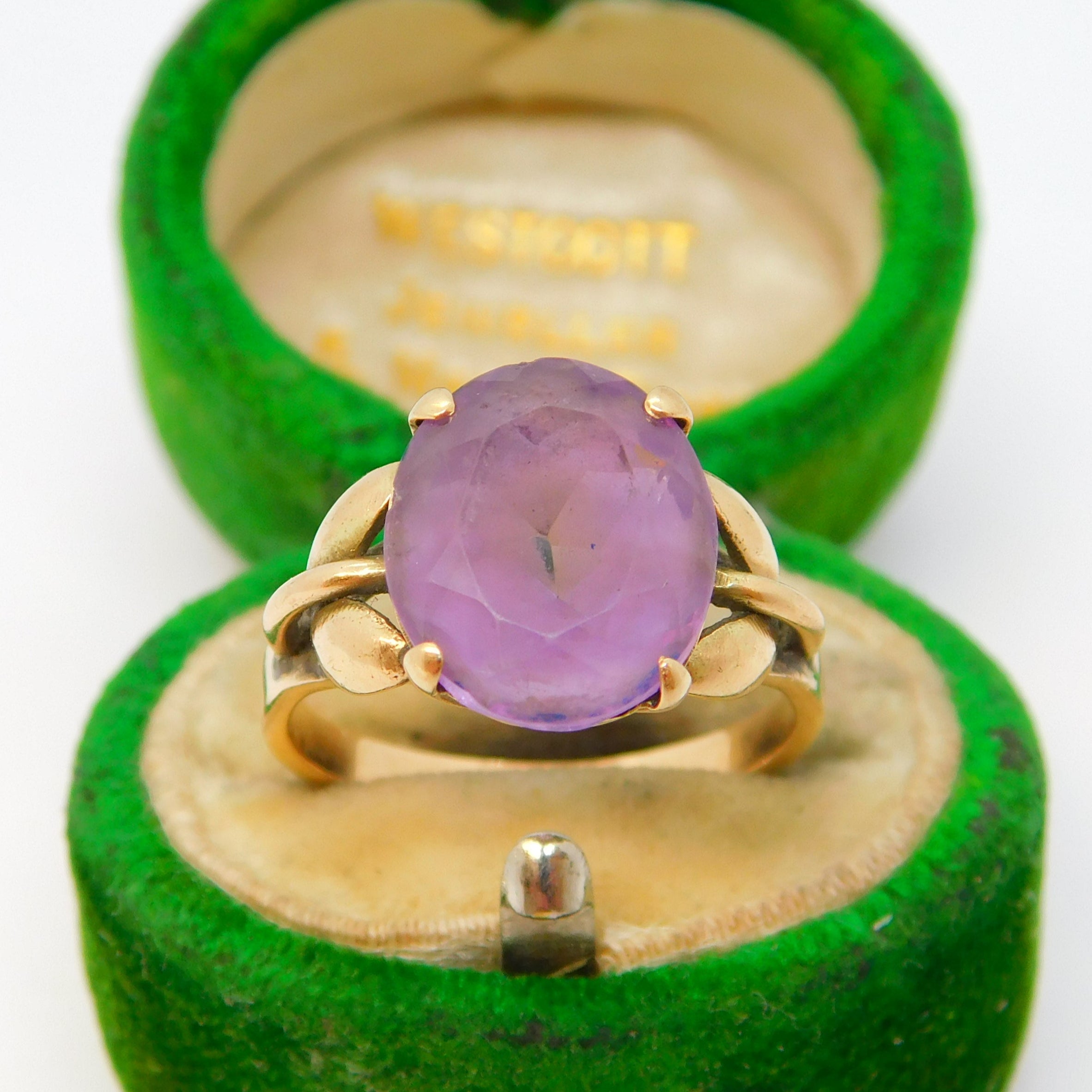 14ct Yellow Gold & Amethyst Set Leaf Pattern Dress Ring Antique c1940 Art Deco