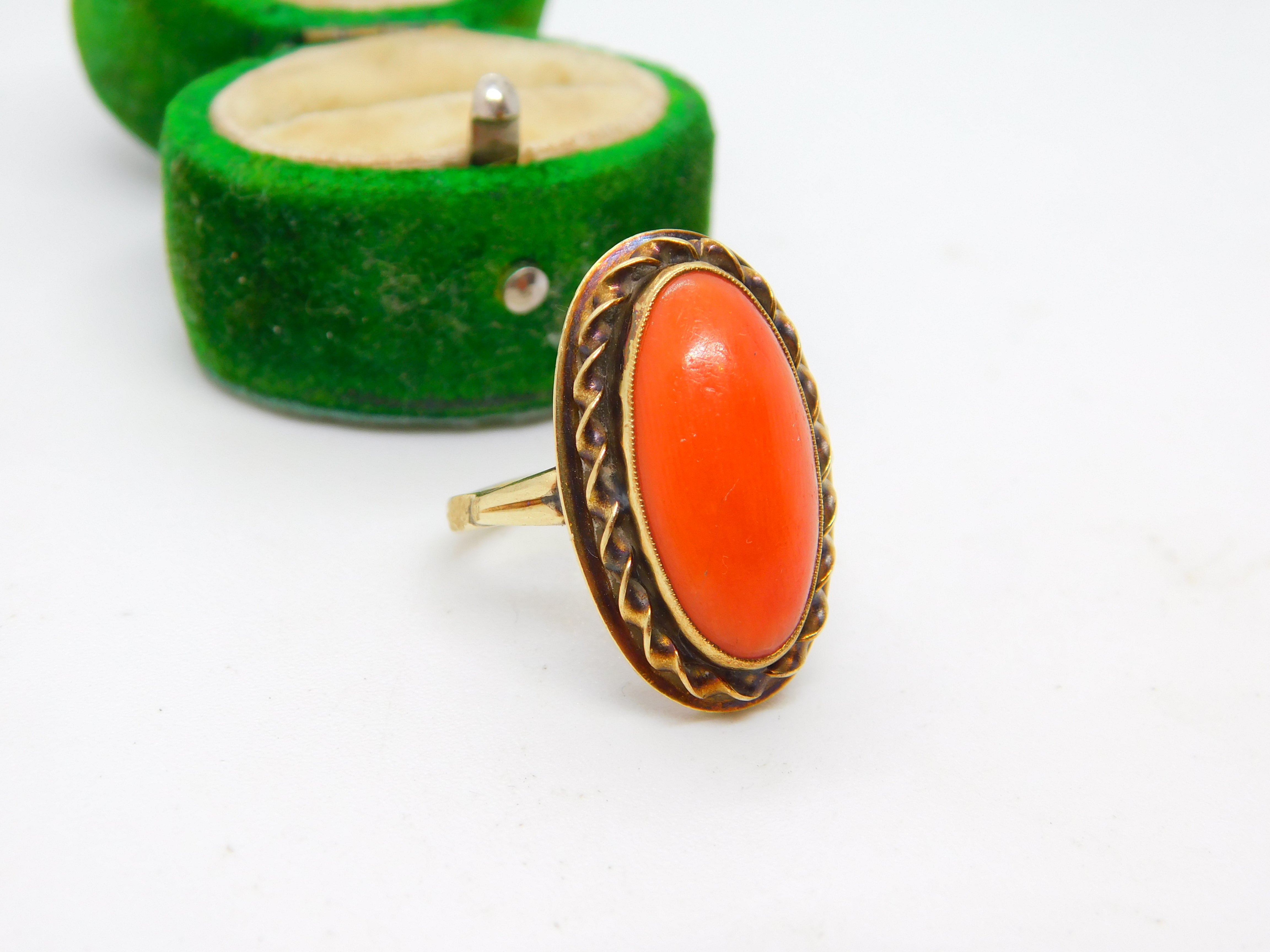 14ct Yellow Gold & Cabochon Red Coral Dress Ring Antique c1920 Art Deco