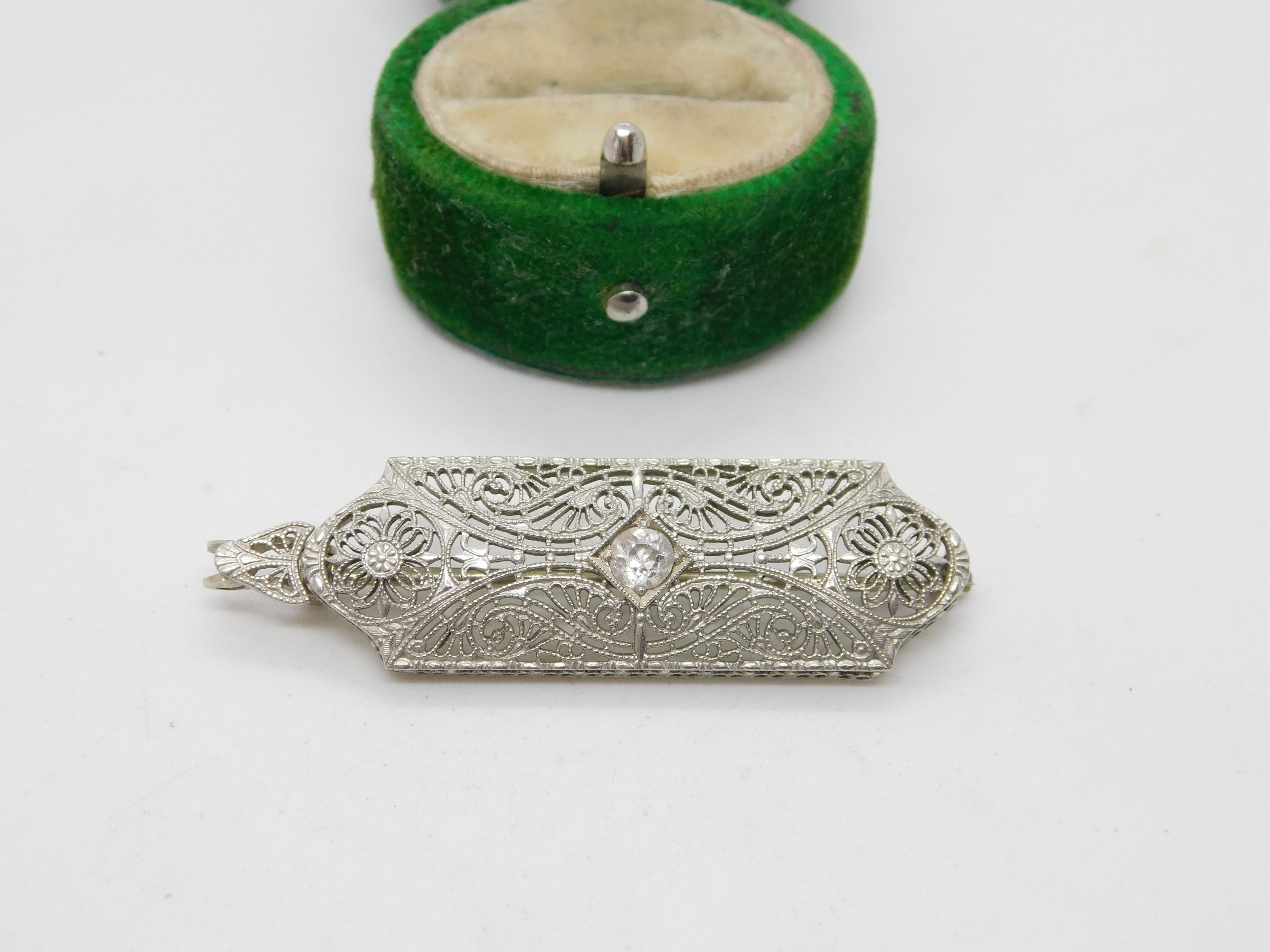 14ct White Gold & 0.25ct Diamond Art Deco Style Brooch Vintage c1970