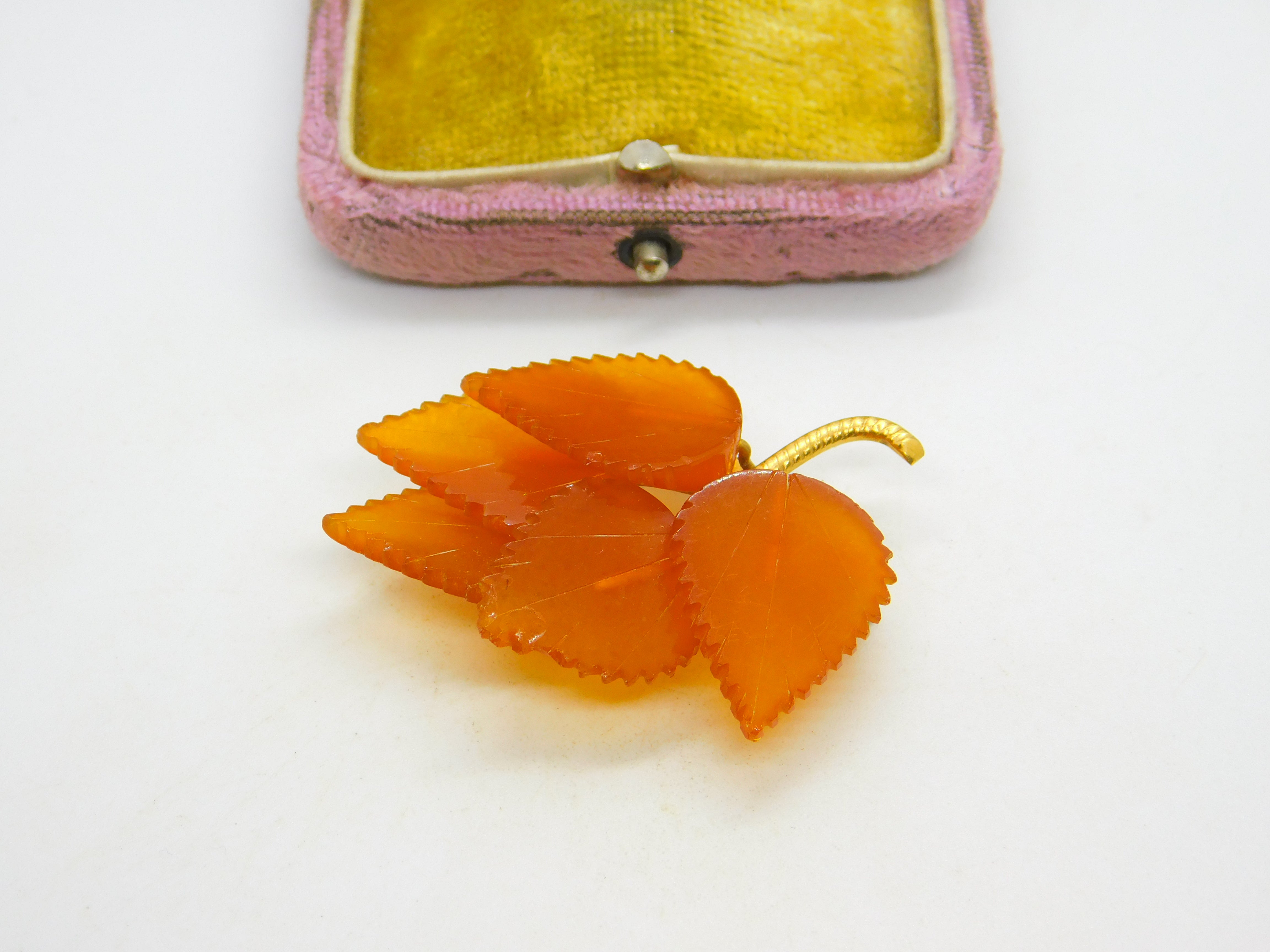 Baltic 18ct Yellow Gold & Amber Leaf Form Brooch Pin Antique c1930 Art Deco