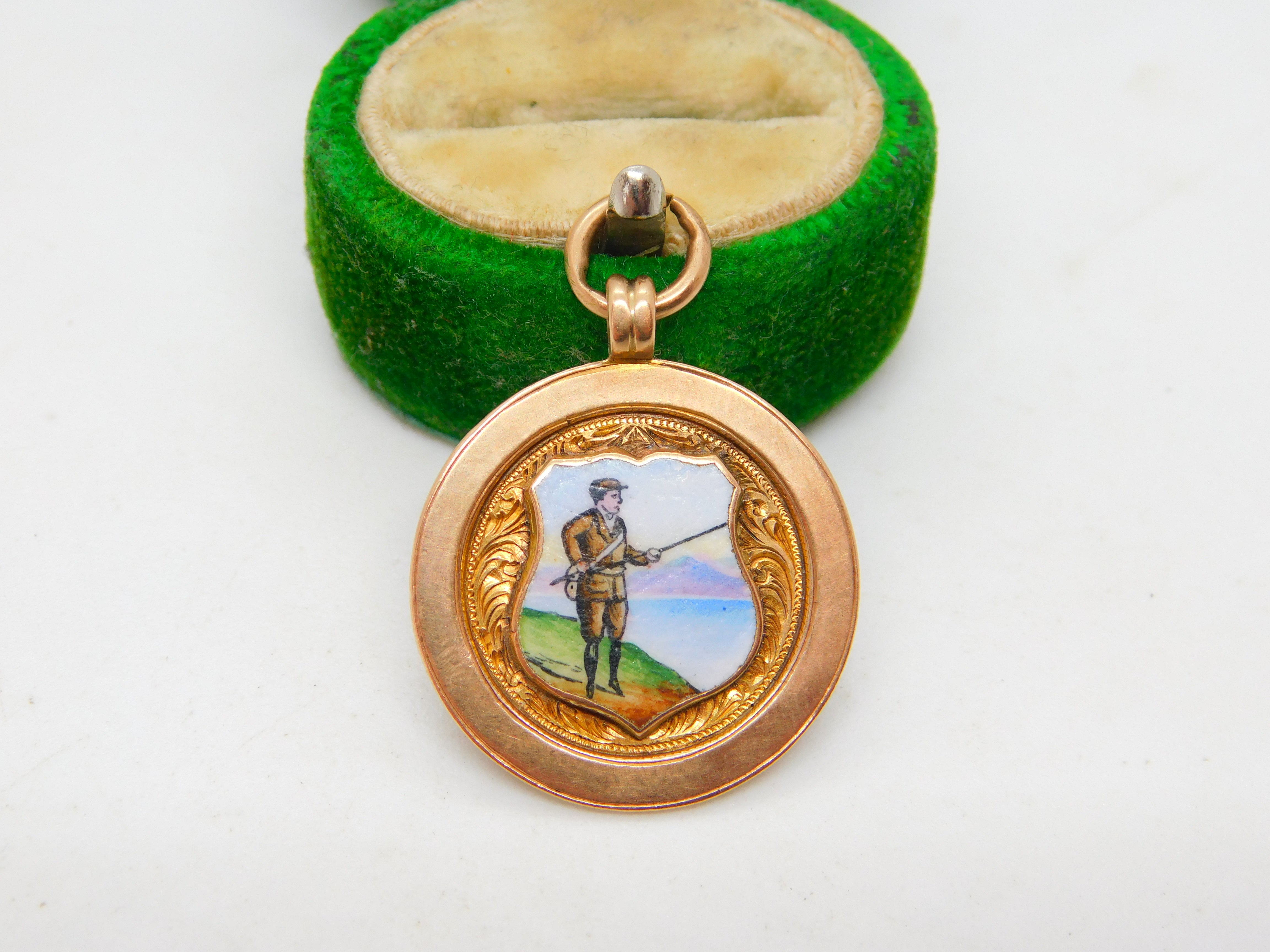 9ct Yellow Gold Enamel Angling Fishing Fob Antique 1921 Chester Art Deco