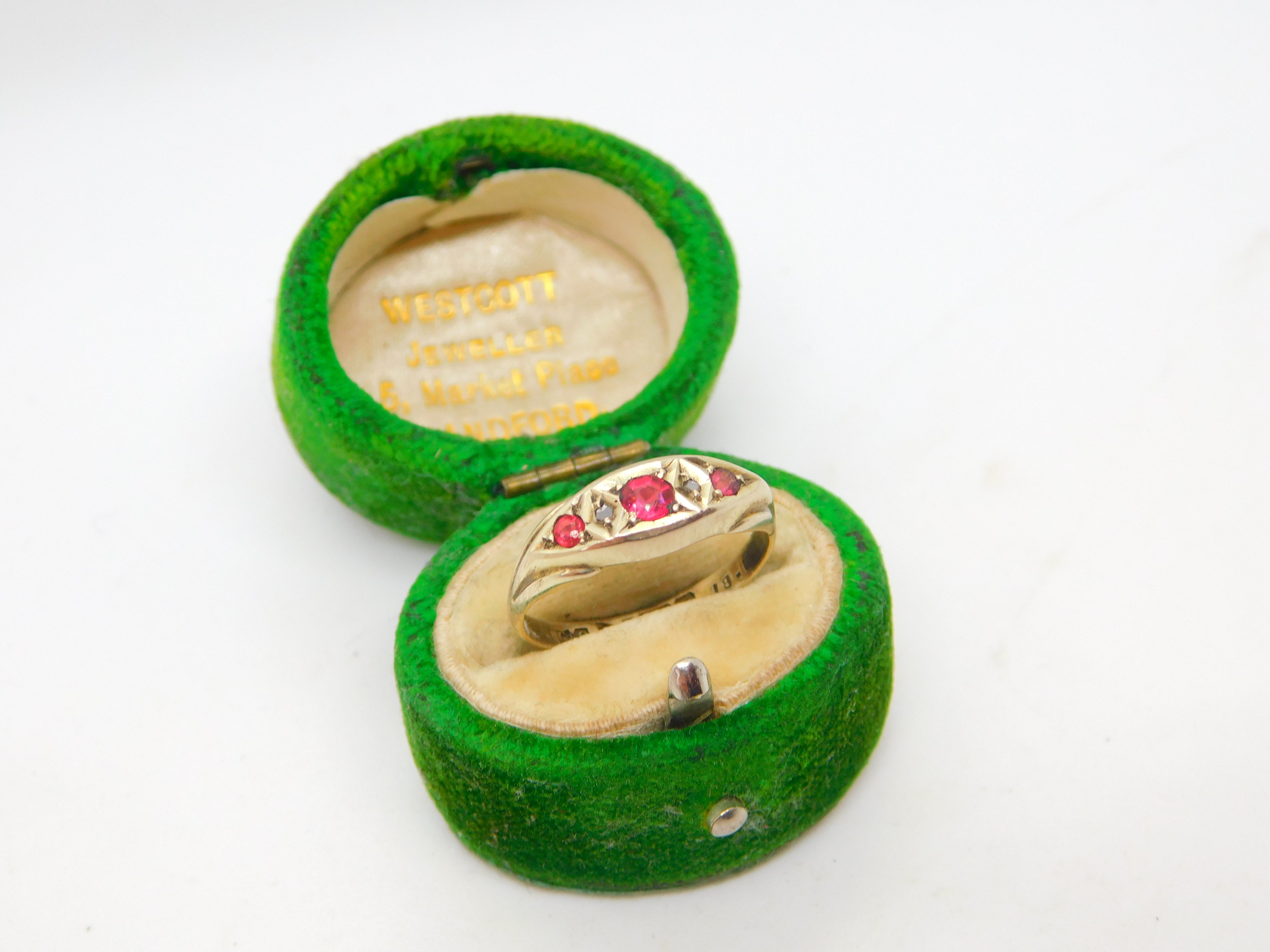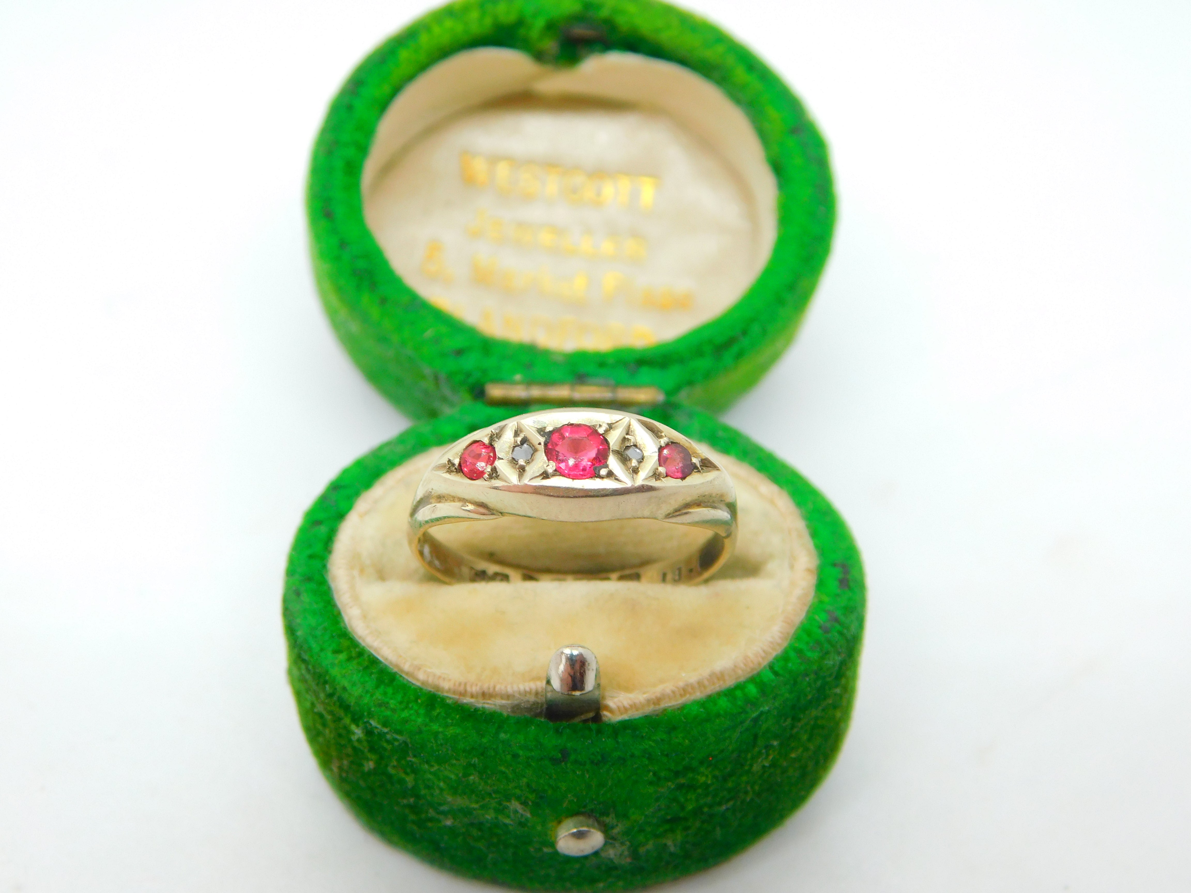 9ct Yellow Gold, Ruby & Seed Pearl Boat Ring Antique 1912 Chester Art Deco