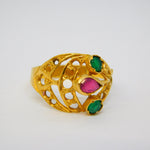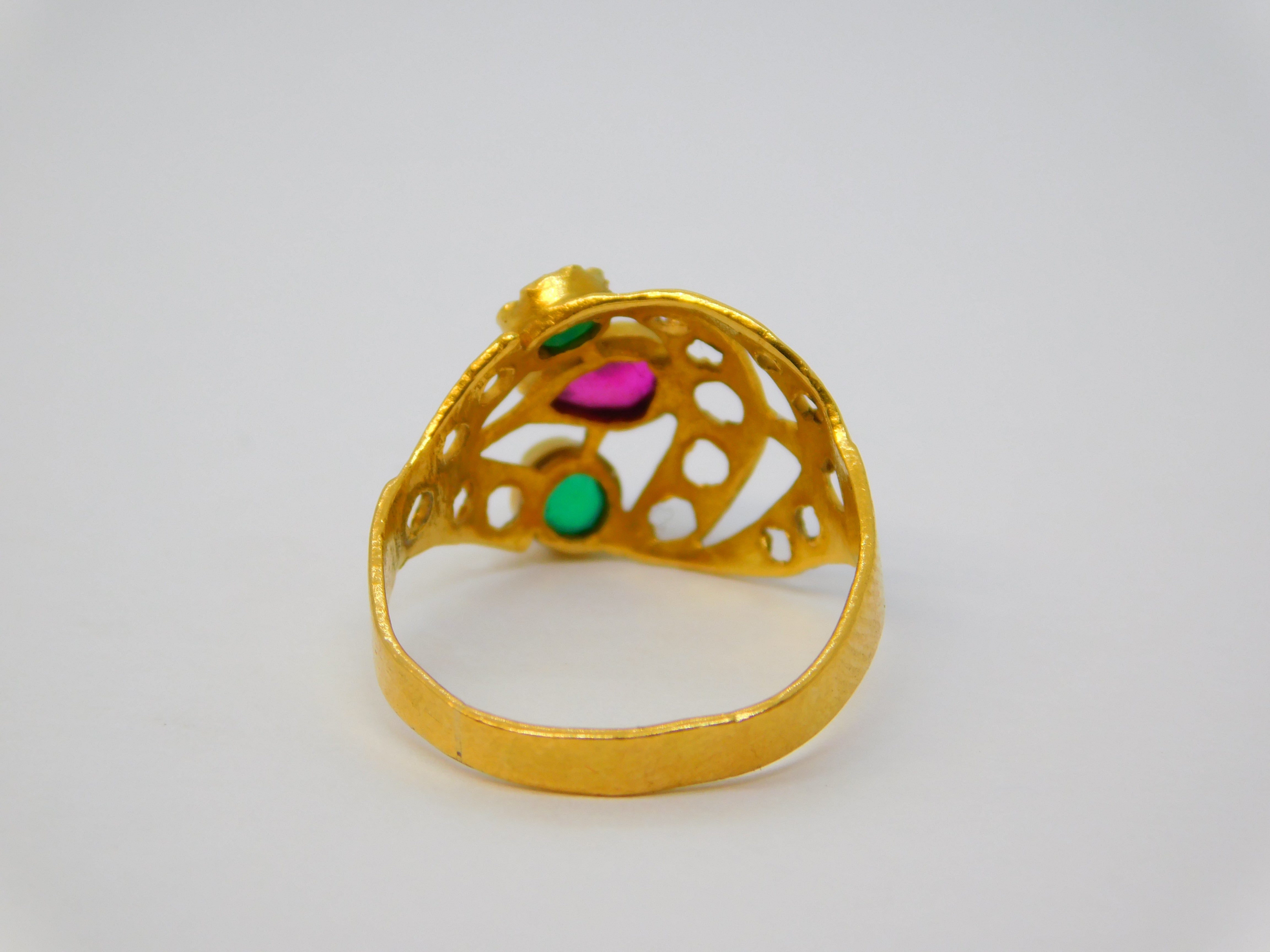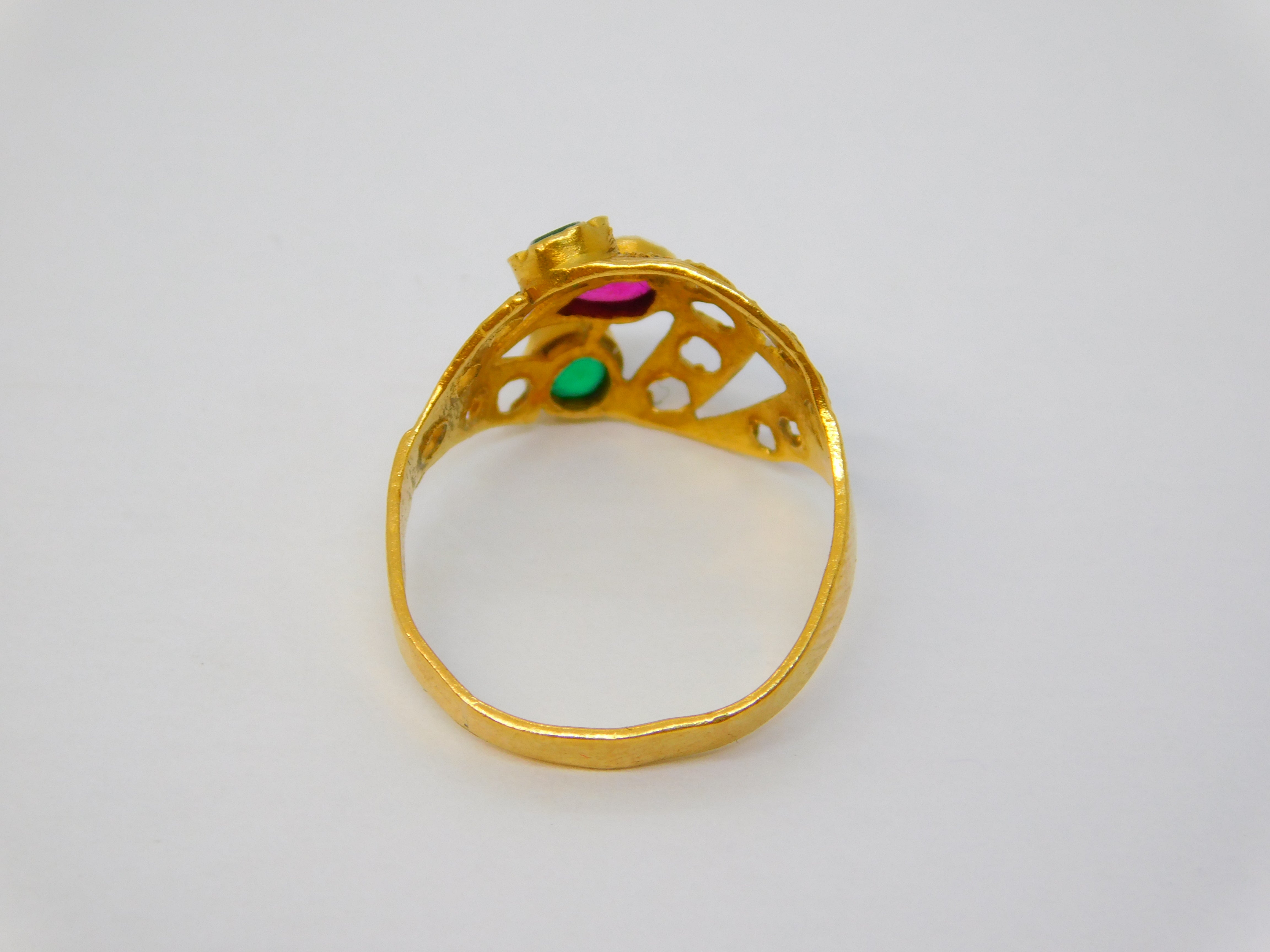 Indian 22ct Yellow Gold, Ruby & Emerald Floral Ring Antique c1920 Art Deco